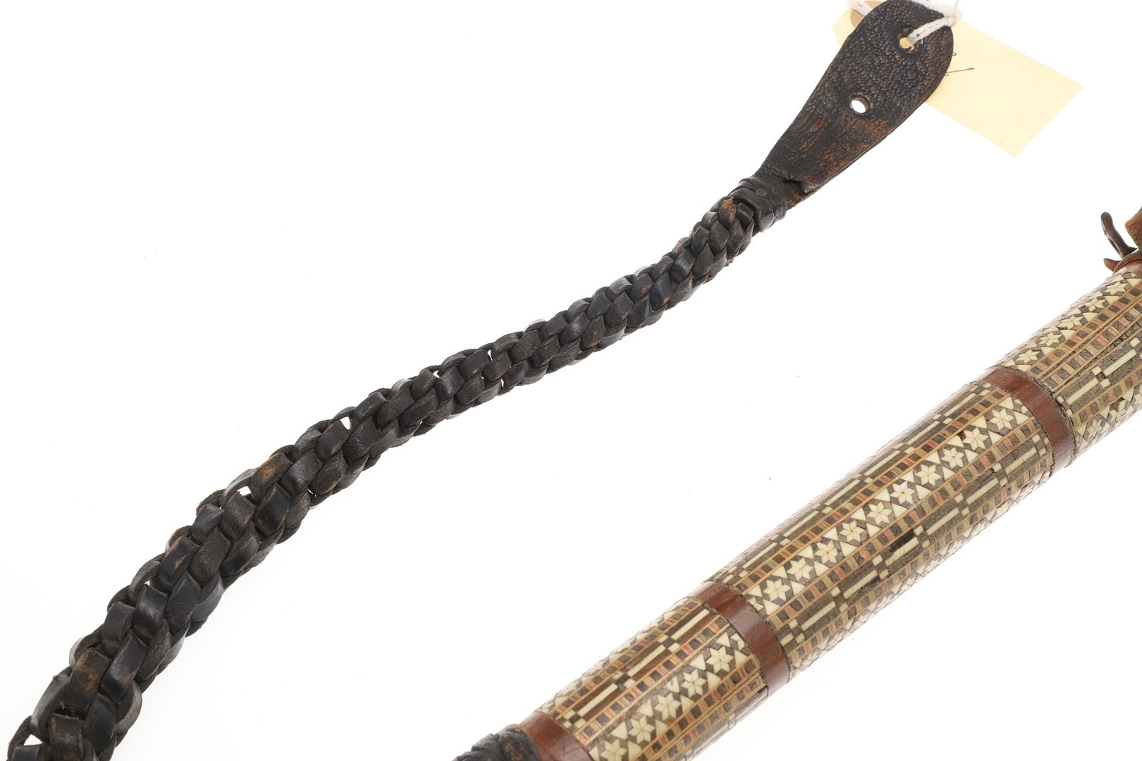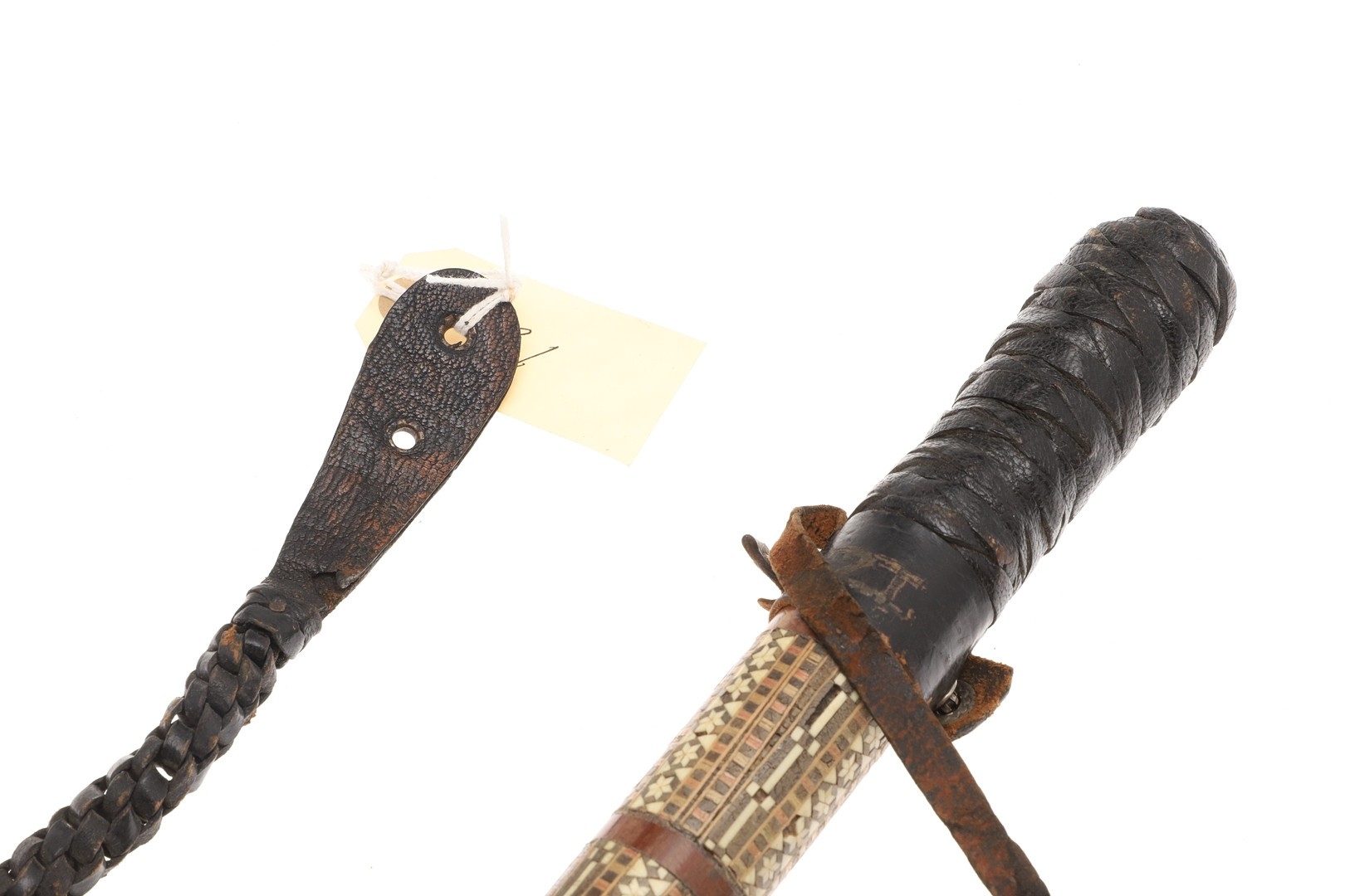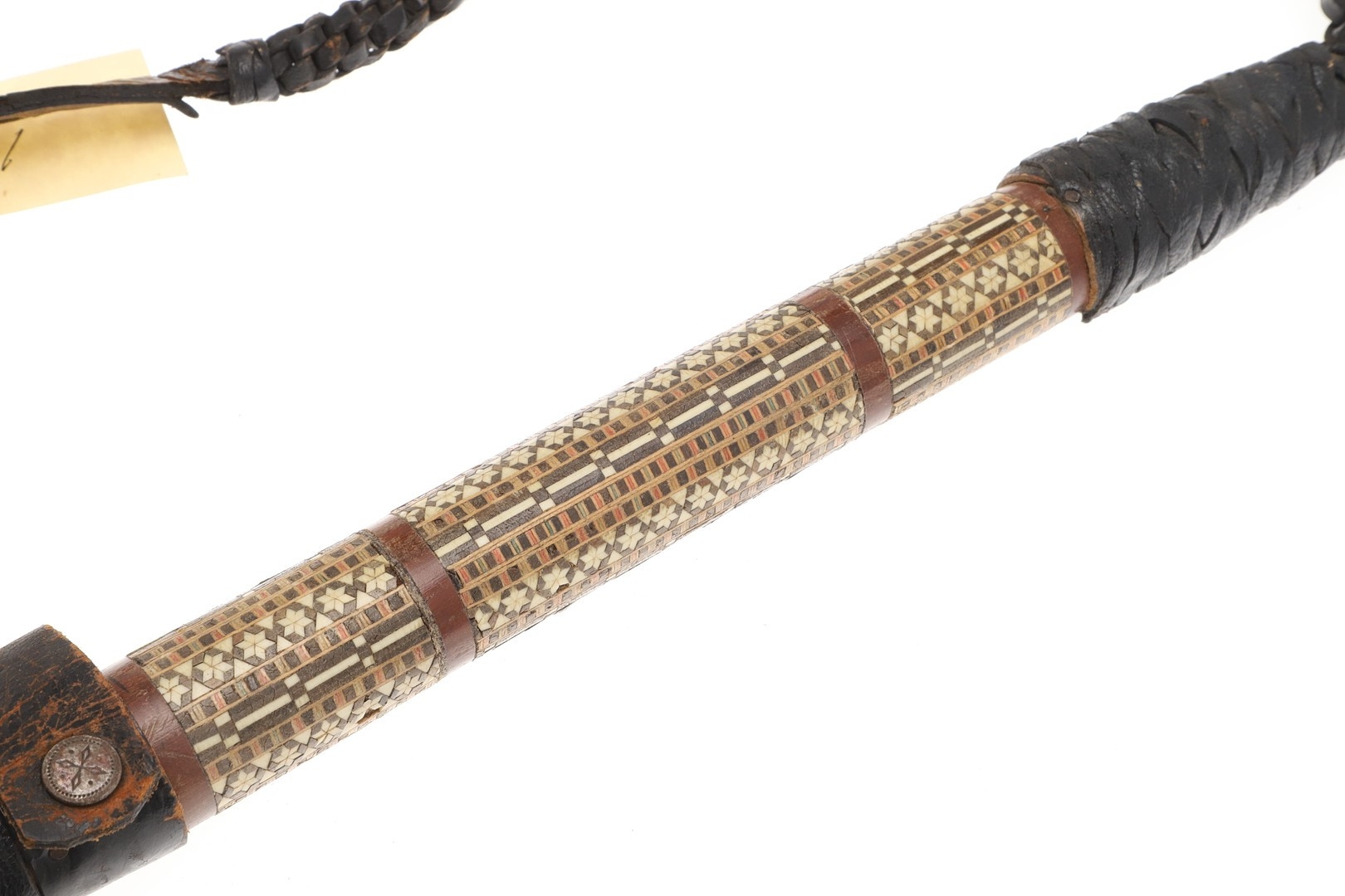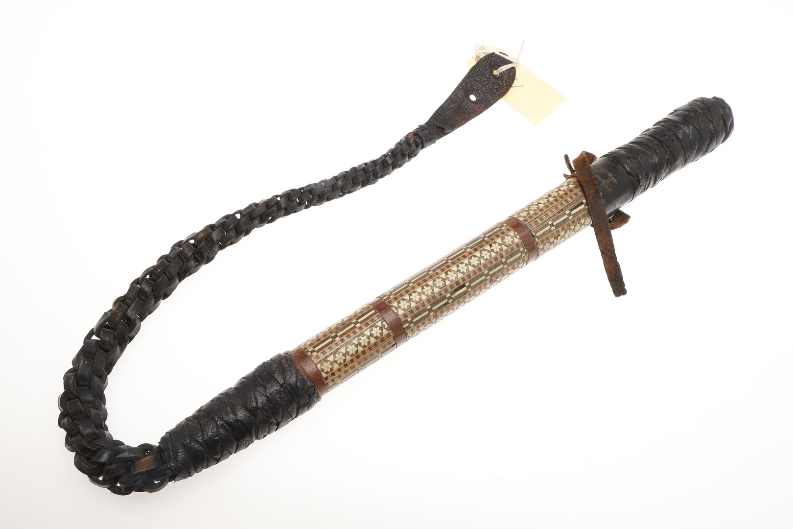AN AFRICAN WHIP AND DAGGER WITH DECORATIVE HANDLE. A leather whip on a mosaic inlay in geometric patterns, the black leather whip and mounts with plaited leather. The handle unscrews to reveal an 18 cm pointed dagger. 82 cm. Exporting outside the EU will require an additional export permit. Ivory Submission Reference: CLZF5NKZ CITES permit is included. Exporting outside the EU will require an additional export permit.