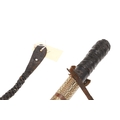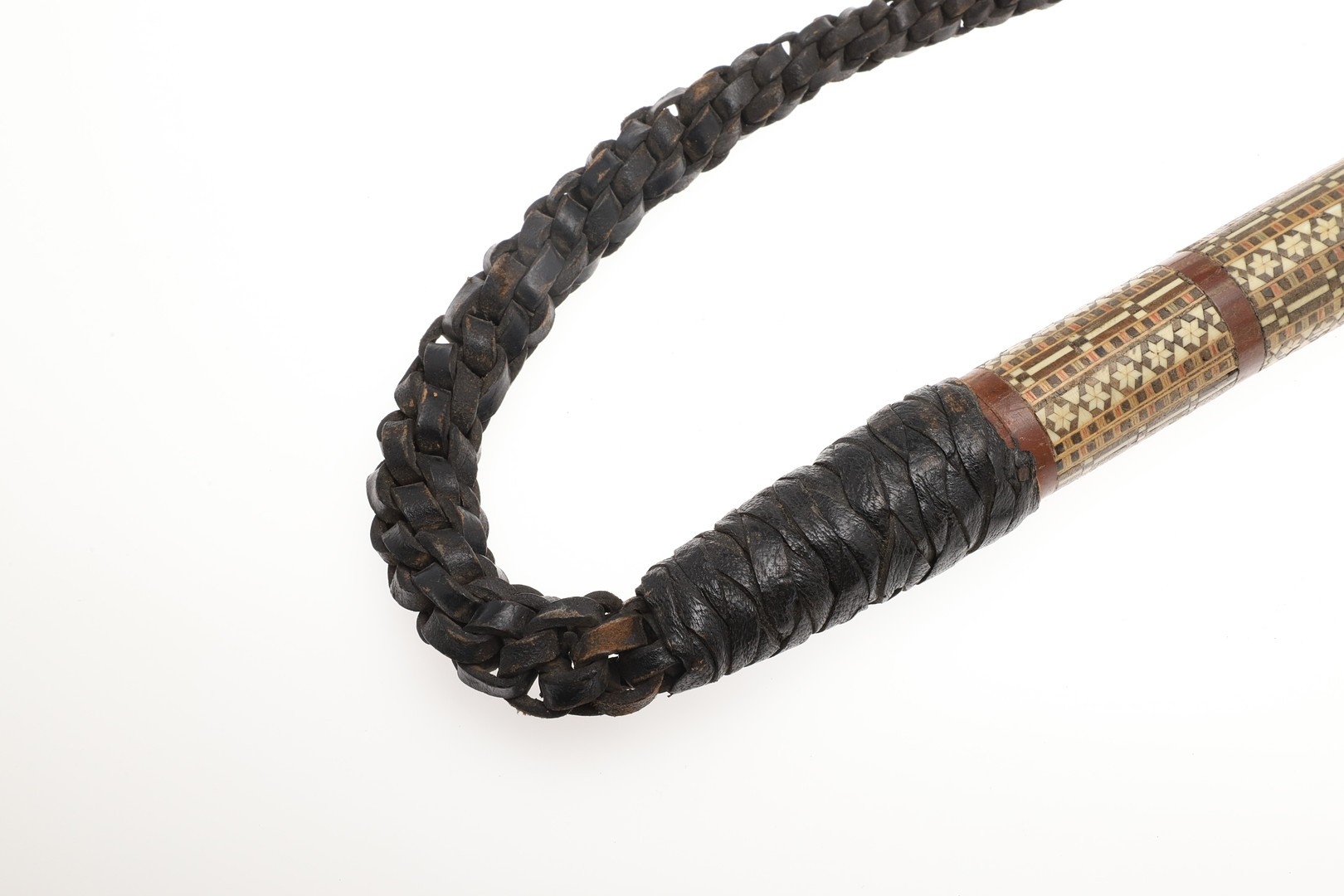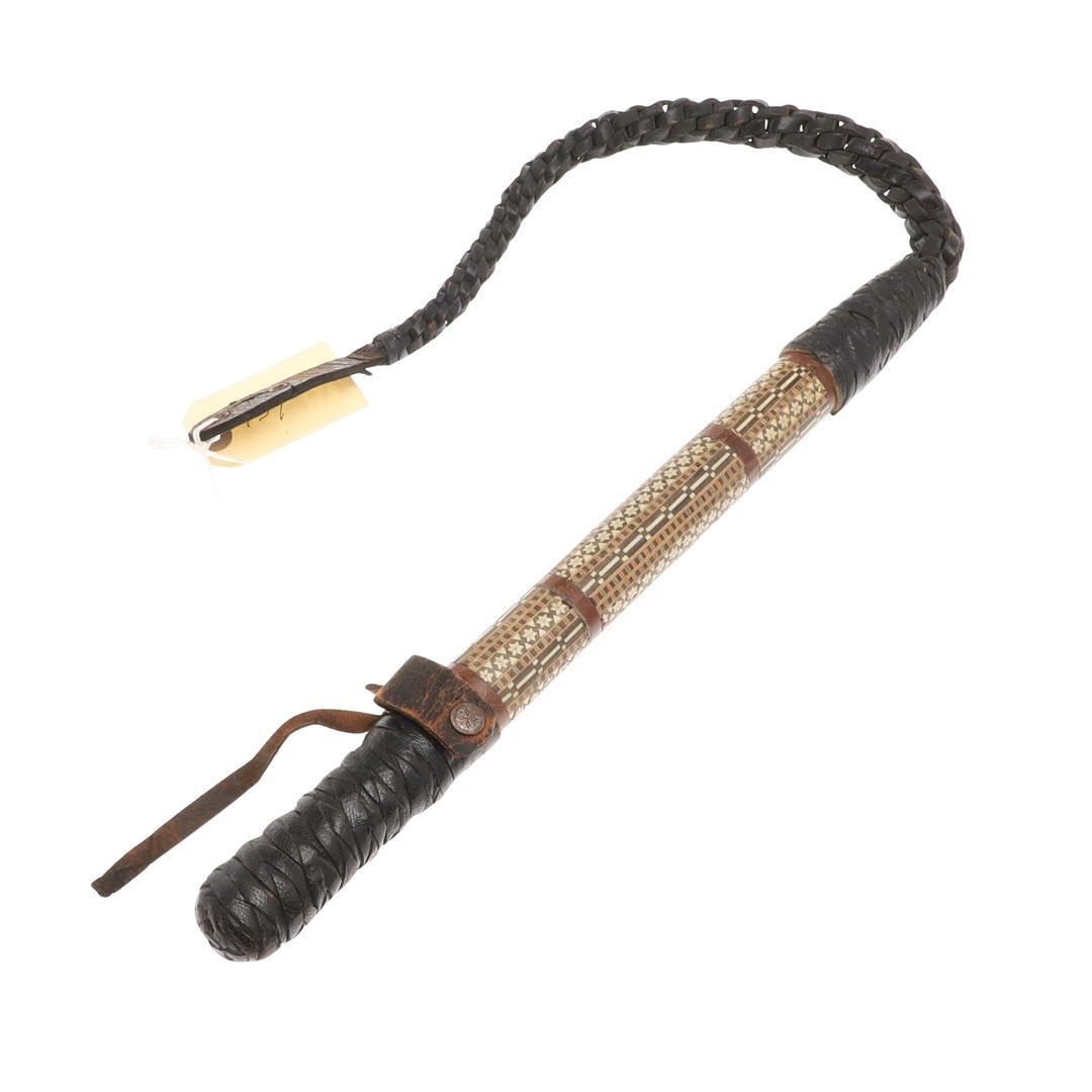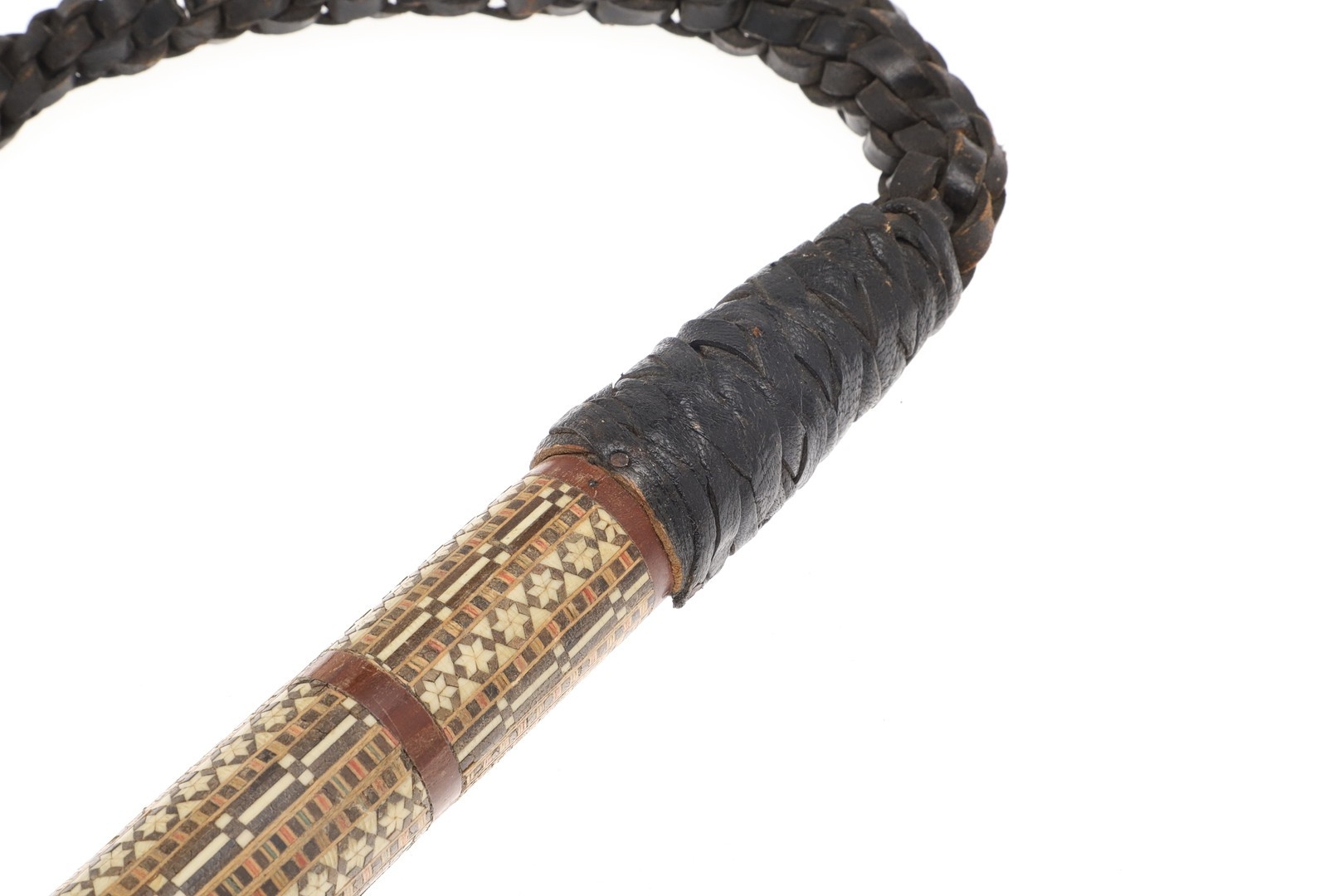 AN AFRICAN WHIP AND DAGGER WITH DECORATIVE HANDLE. A leather whip on a mosaic inlay in geometric patterns, the black leather whip and mounts with plaited leather. The handle unscrews to reveal an 18 cm pointed dagger. 82 cm. Exporting outside the EU will require an additional export permit. Ivory Submission Reference: CLZF5NKZ CITES permit is included. Exporting outside the EU will require an additional export permit.