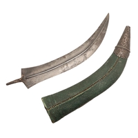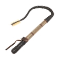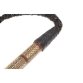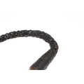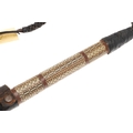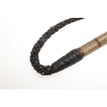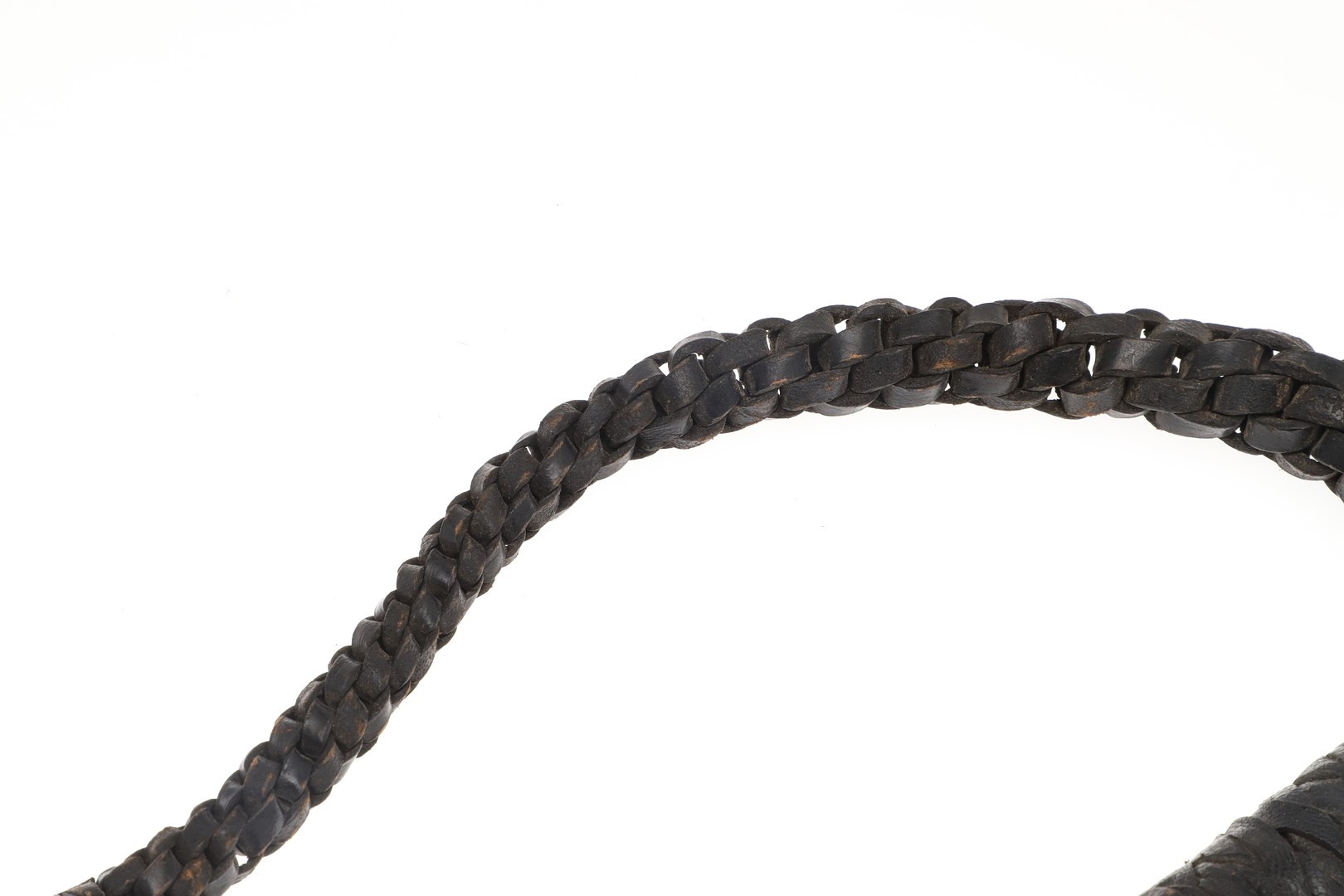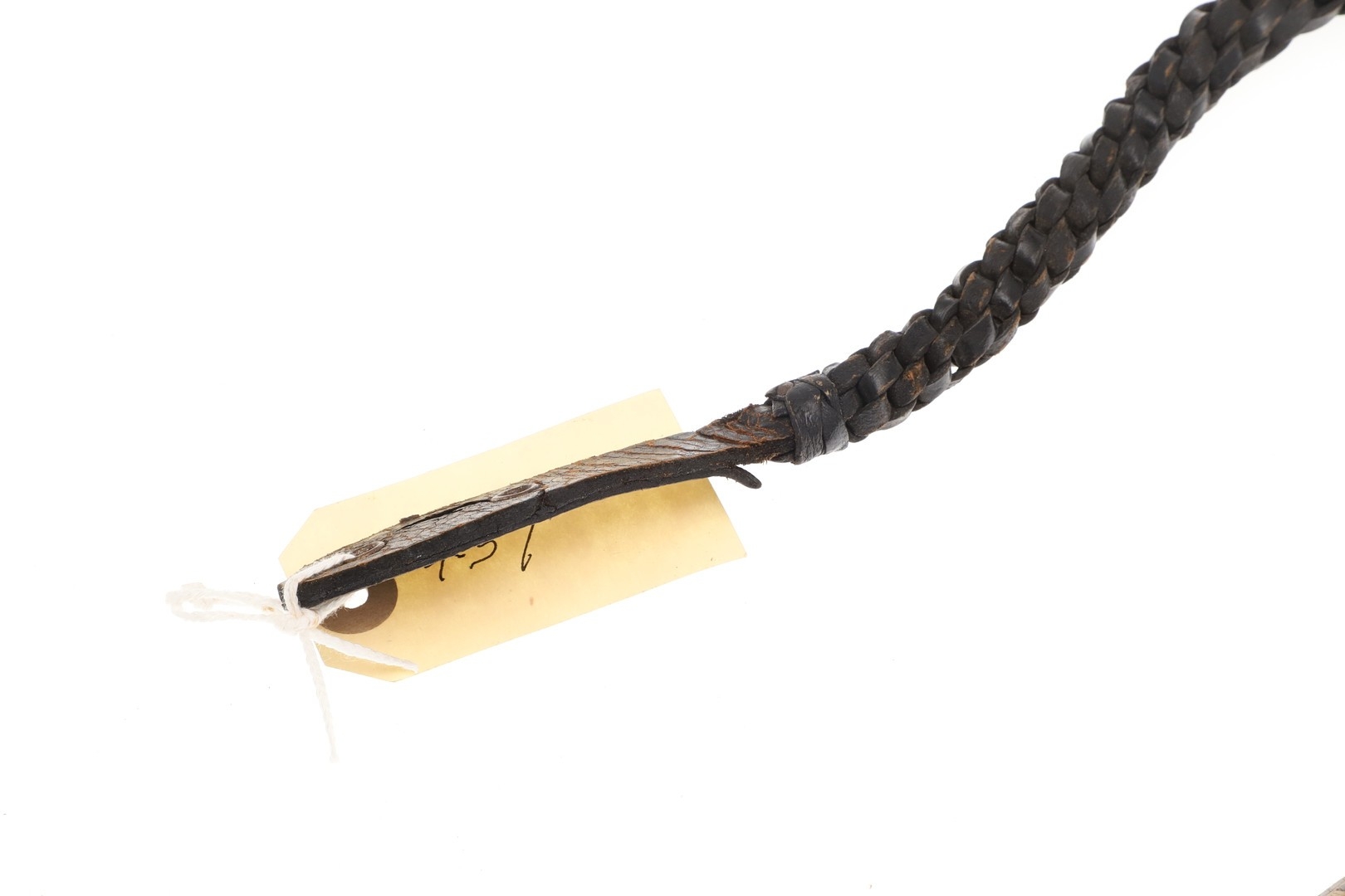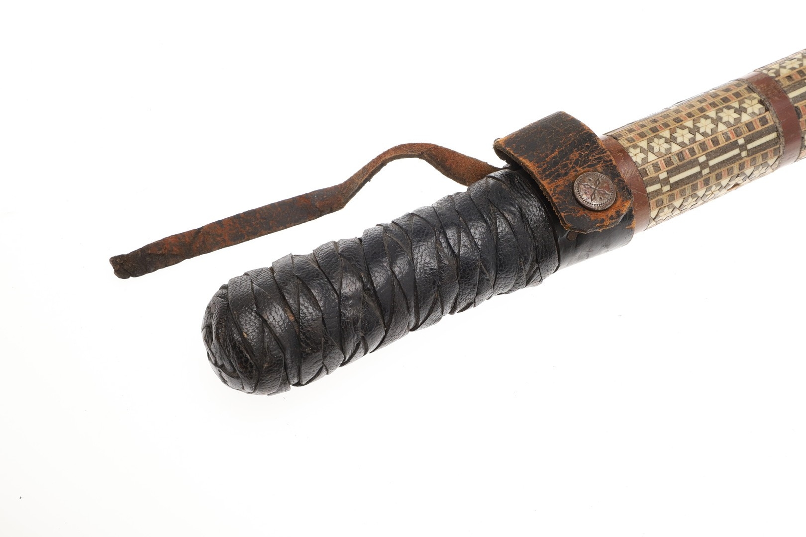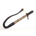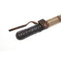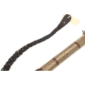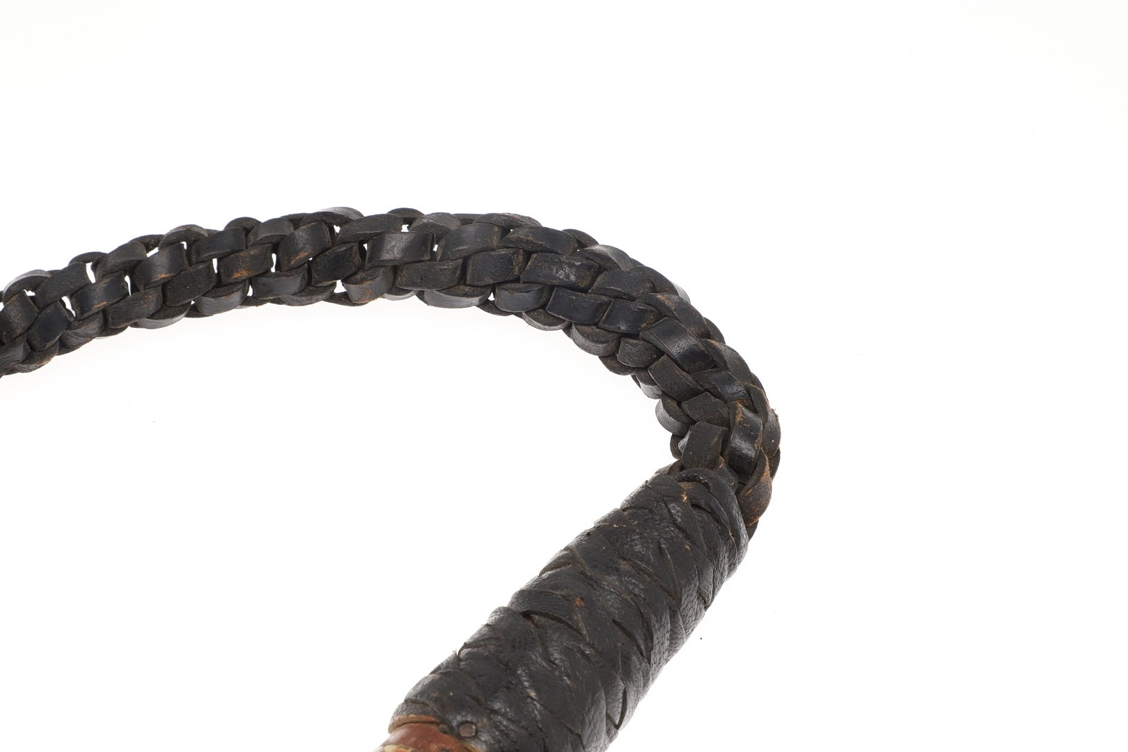 AN AFRICAN WHIP AND DAGGER WITH DECORATIVE HANDLE. A leather whip on a mosaic inlay in geometric patterns, the black leather whip and mounts with plaited leather. The handle unscrews to reveal an 18 cm pointed dagger. 82 cm. Exporting outside the EU will require an additional export permit. Ivory Submission Reference: CLZF5NKZ CITES permit is included. Exporting outside the EU will require an additional export permit.