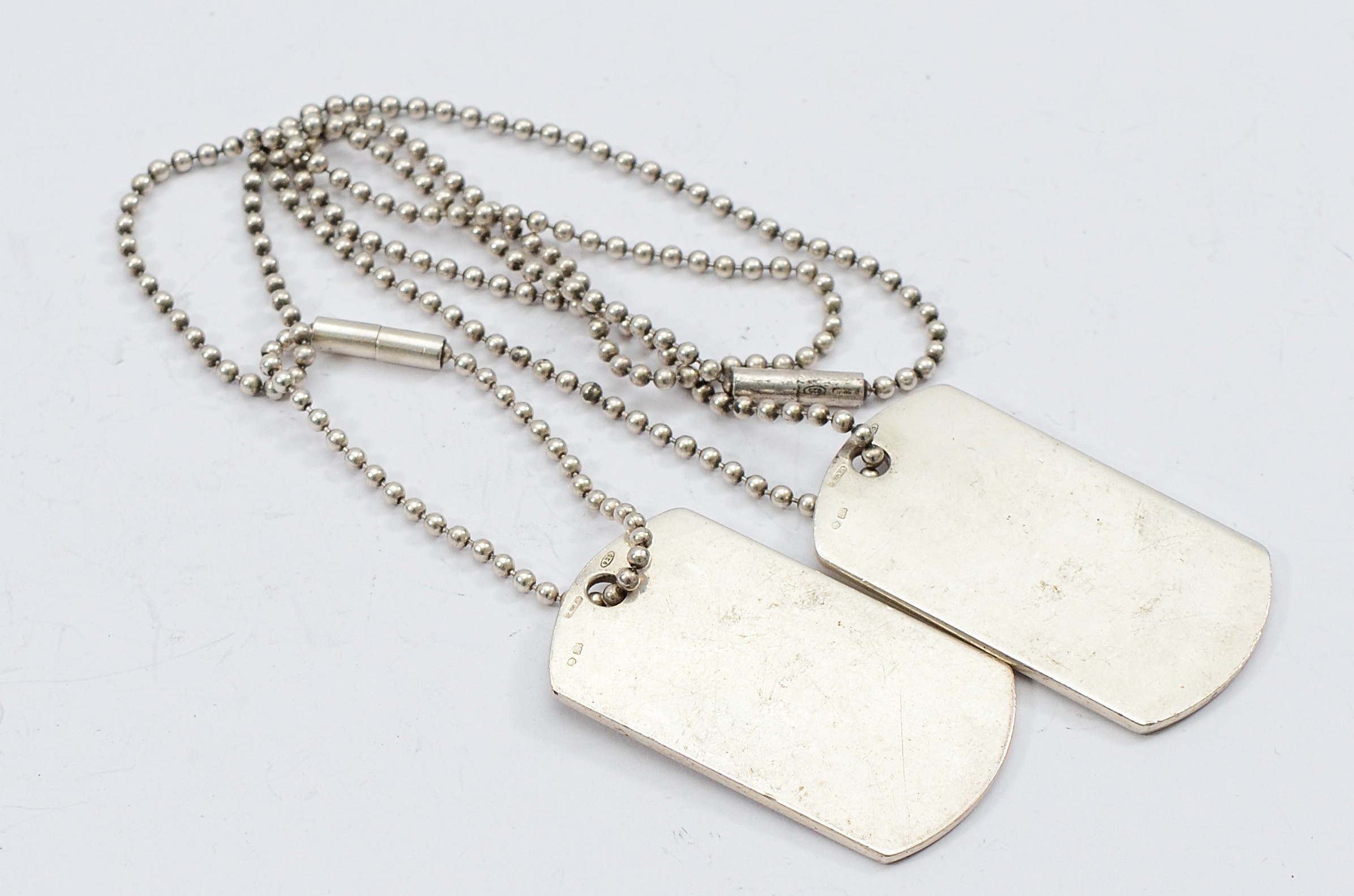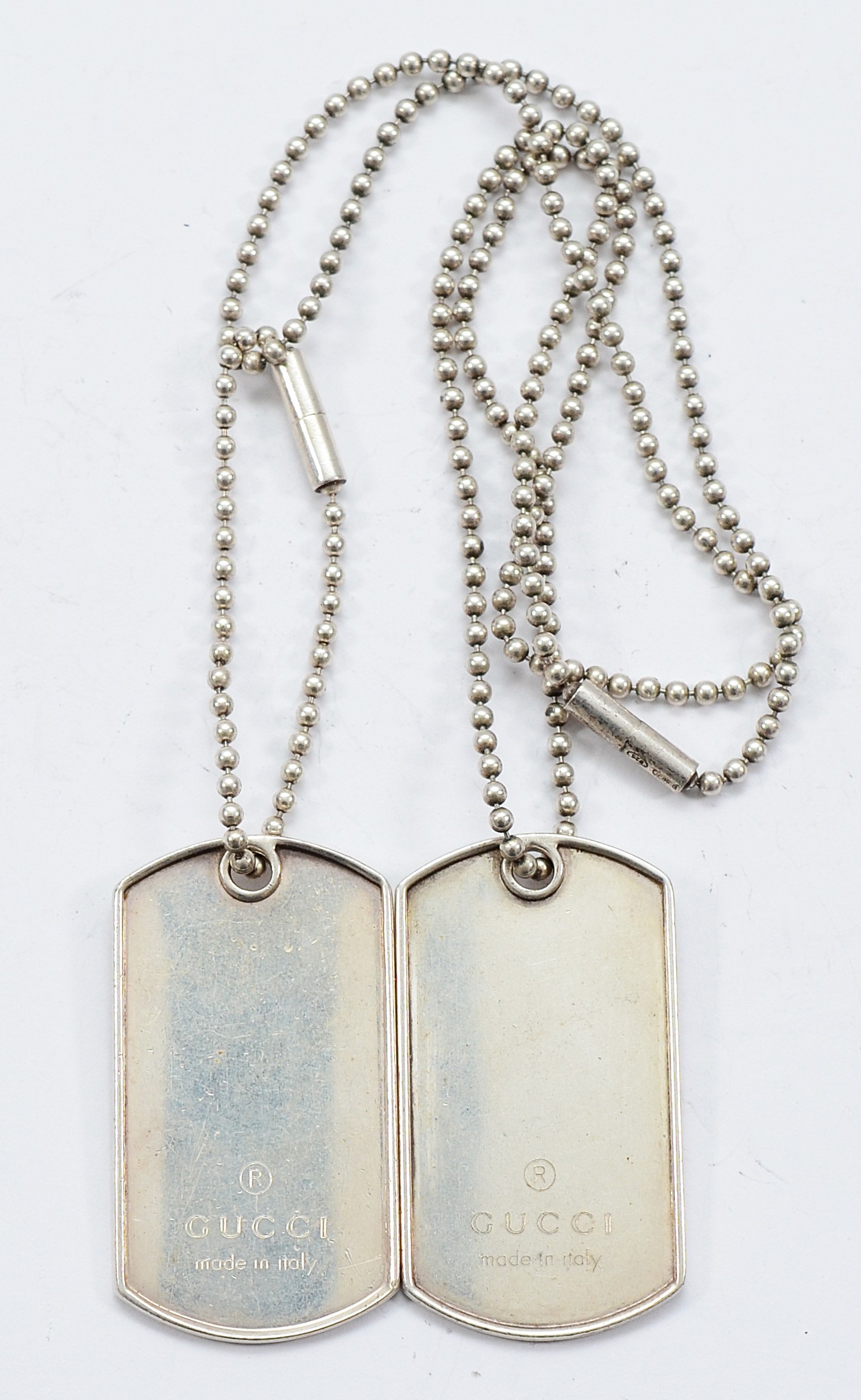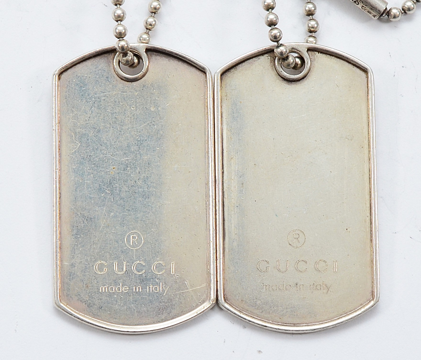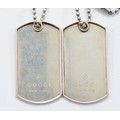 Gucci, two 925 silver identity tag pendants on a chain, UK import hallmarks, 60cm, 55g