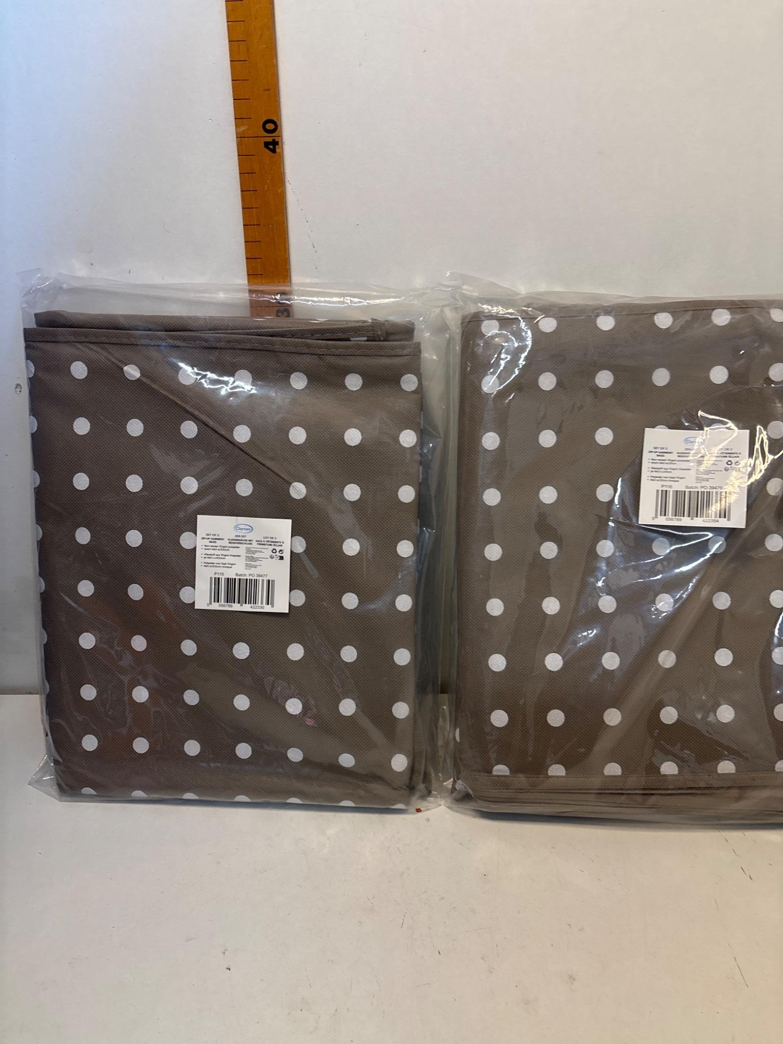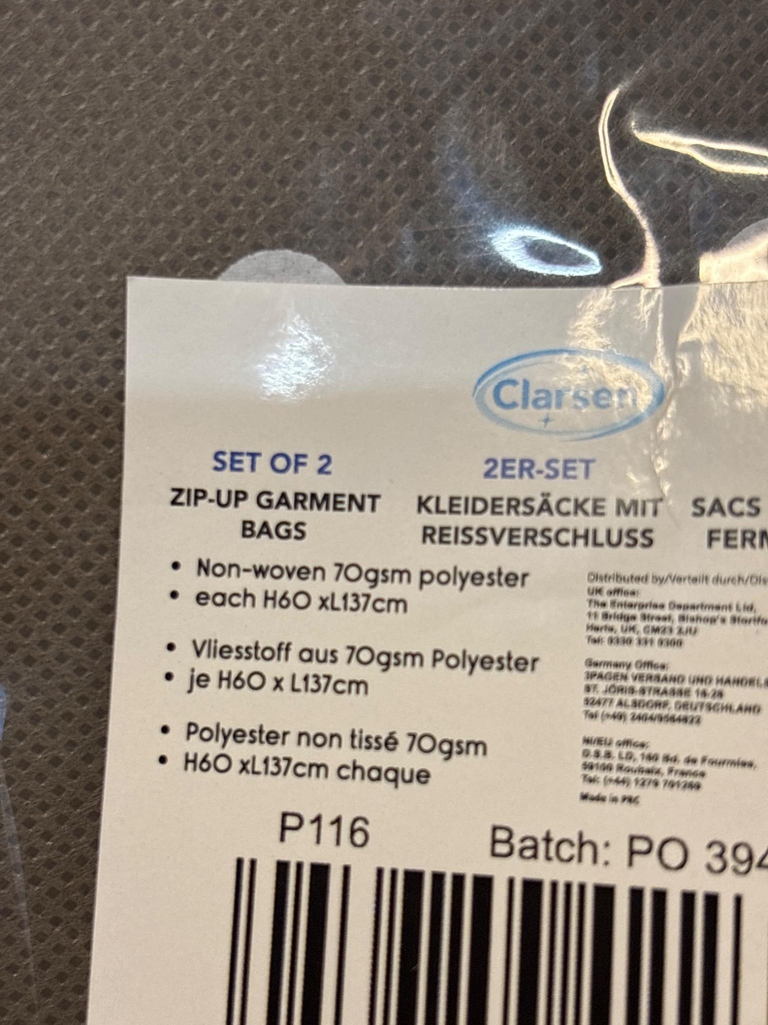 2 zip-up garment bags made from 70gsm polyester; each measures H60 x L137 cm.