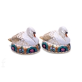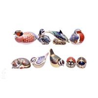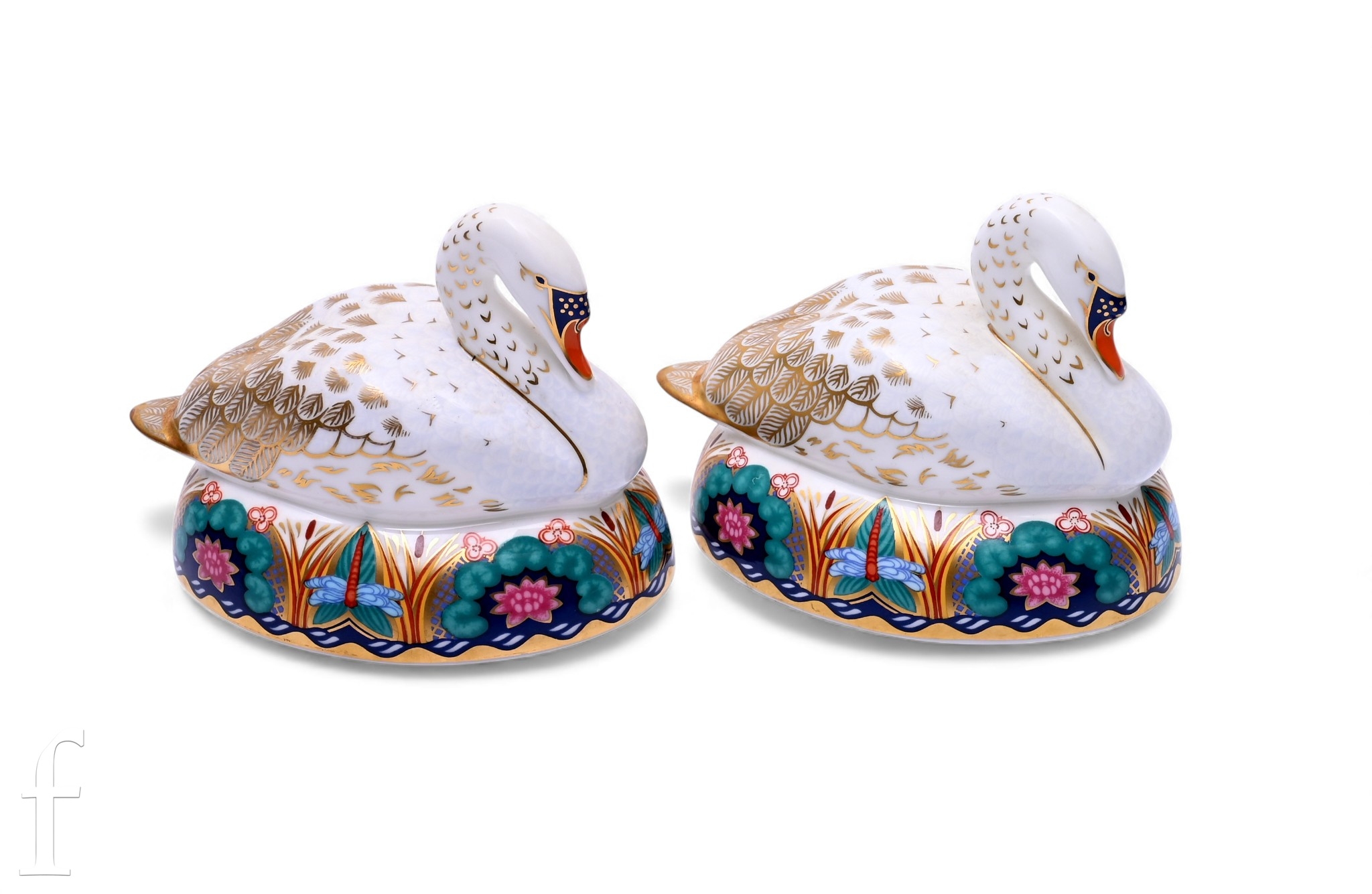 Two Royal Crown Derby White Swan paperweights, printed red marks and gold stoppers, height 10cm, one with box. (3)