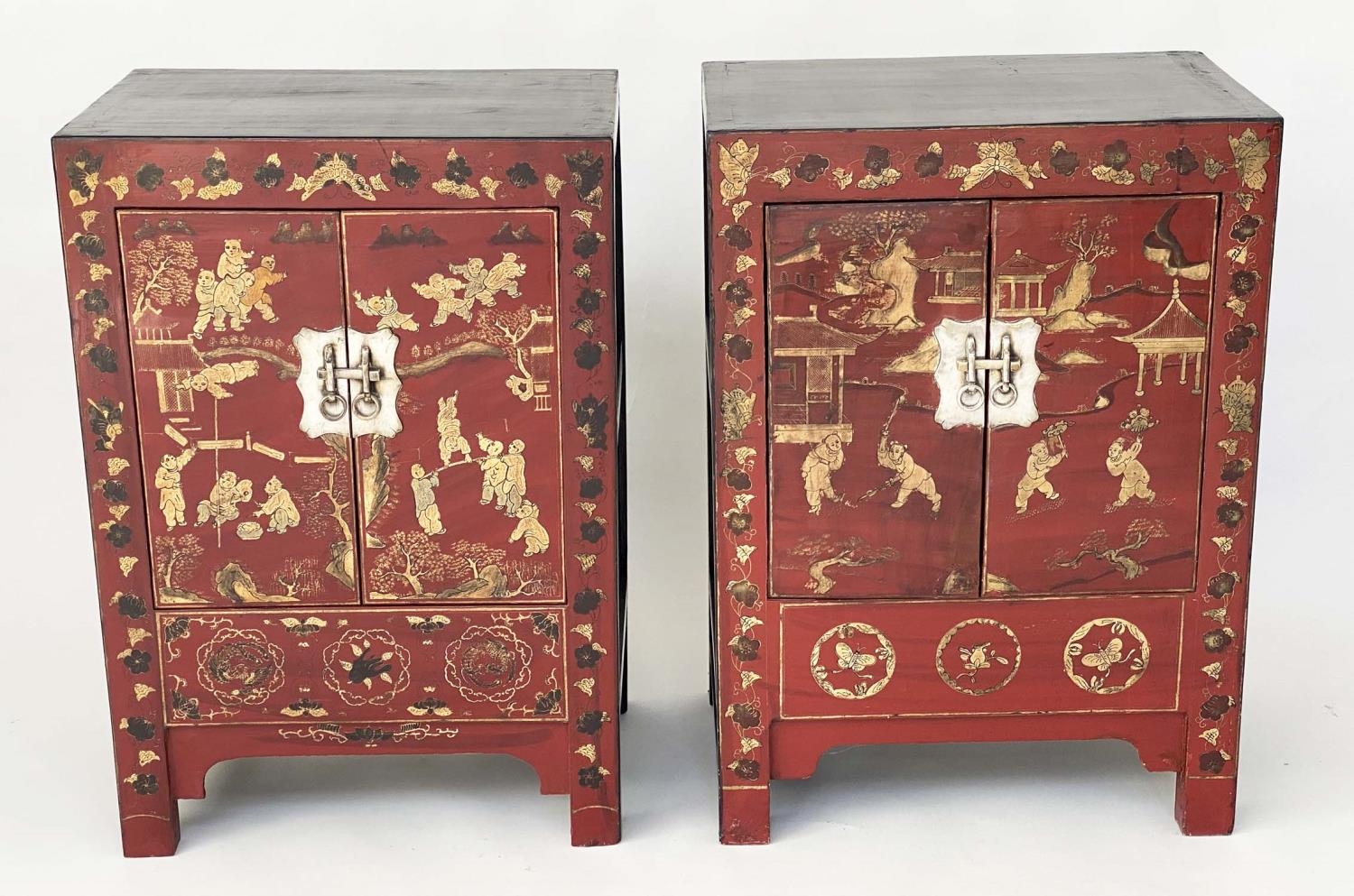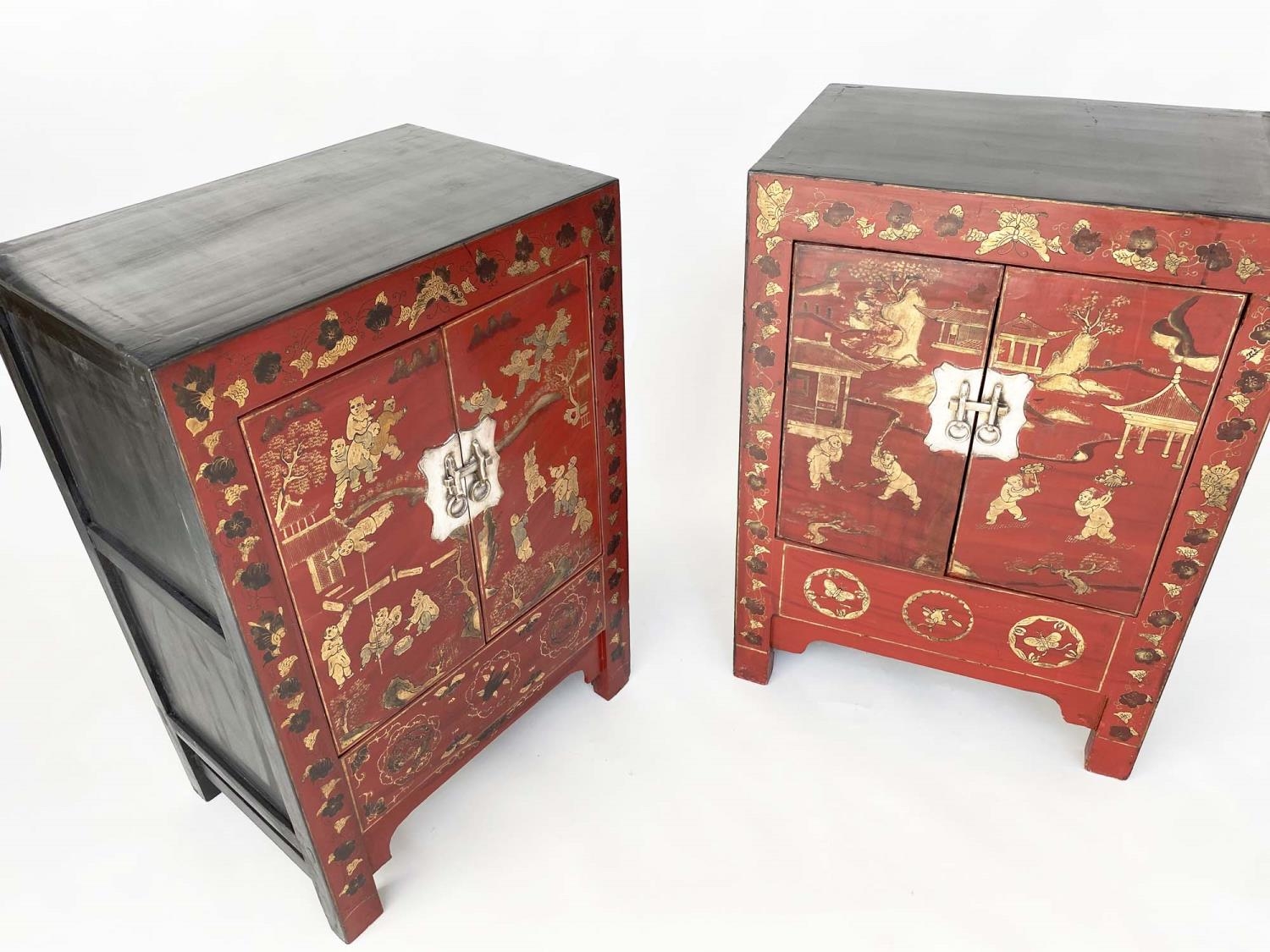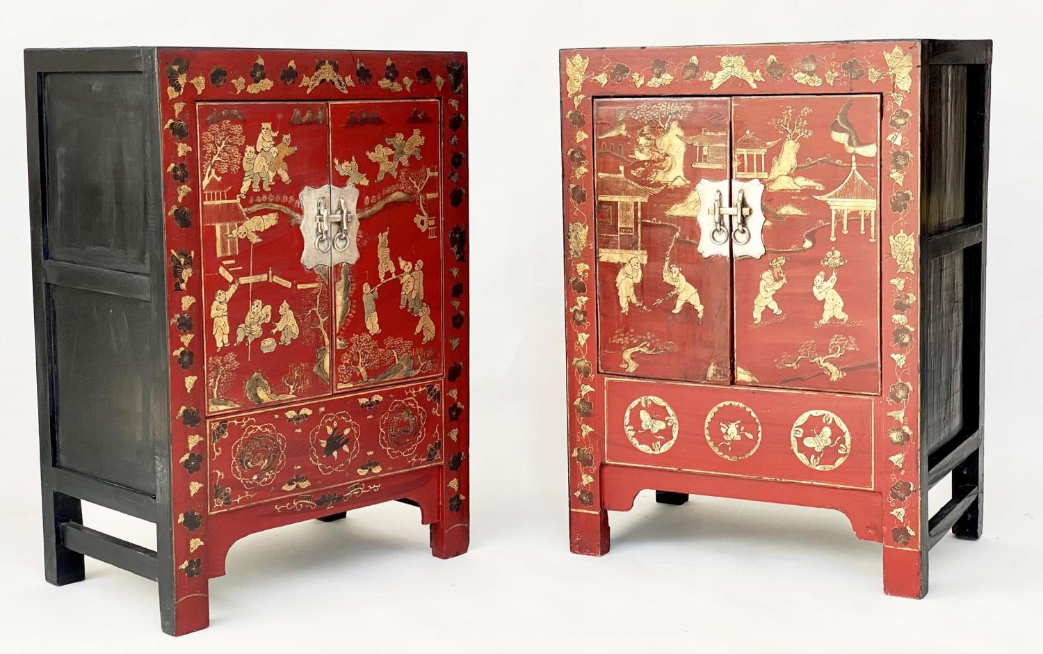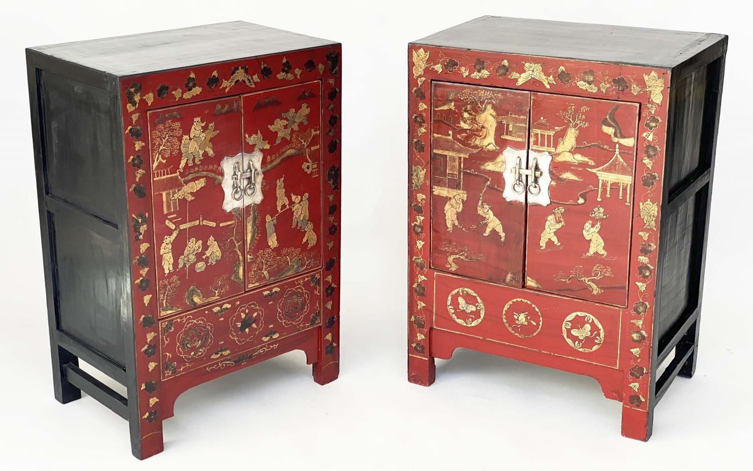 CHINESE CABINETS, a pair, early 20th century scarlet lacquered Chinoiserie gilt decorated and silvered metal mounted each with two doors, 60cm W x 41cm D x 84cm H. (2)
