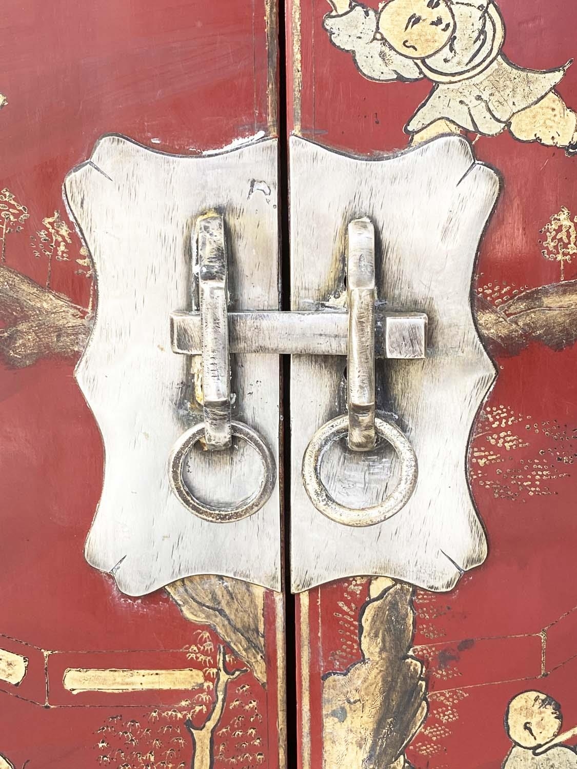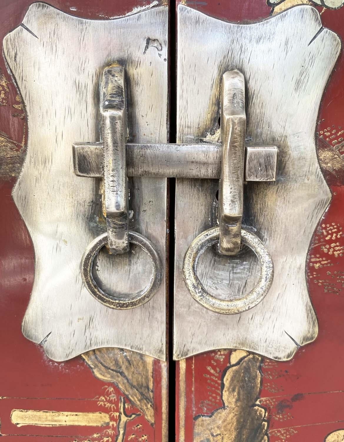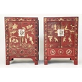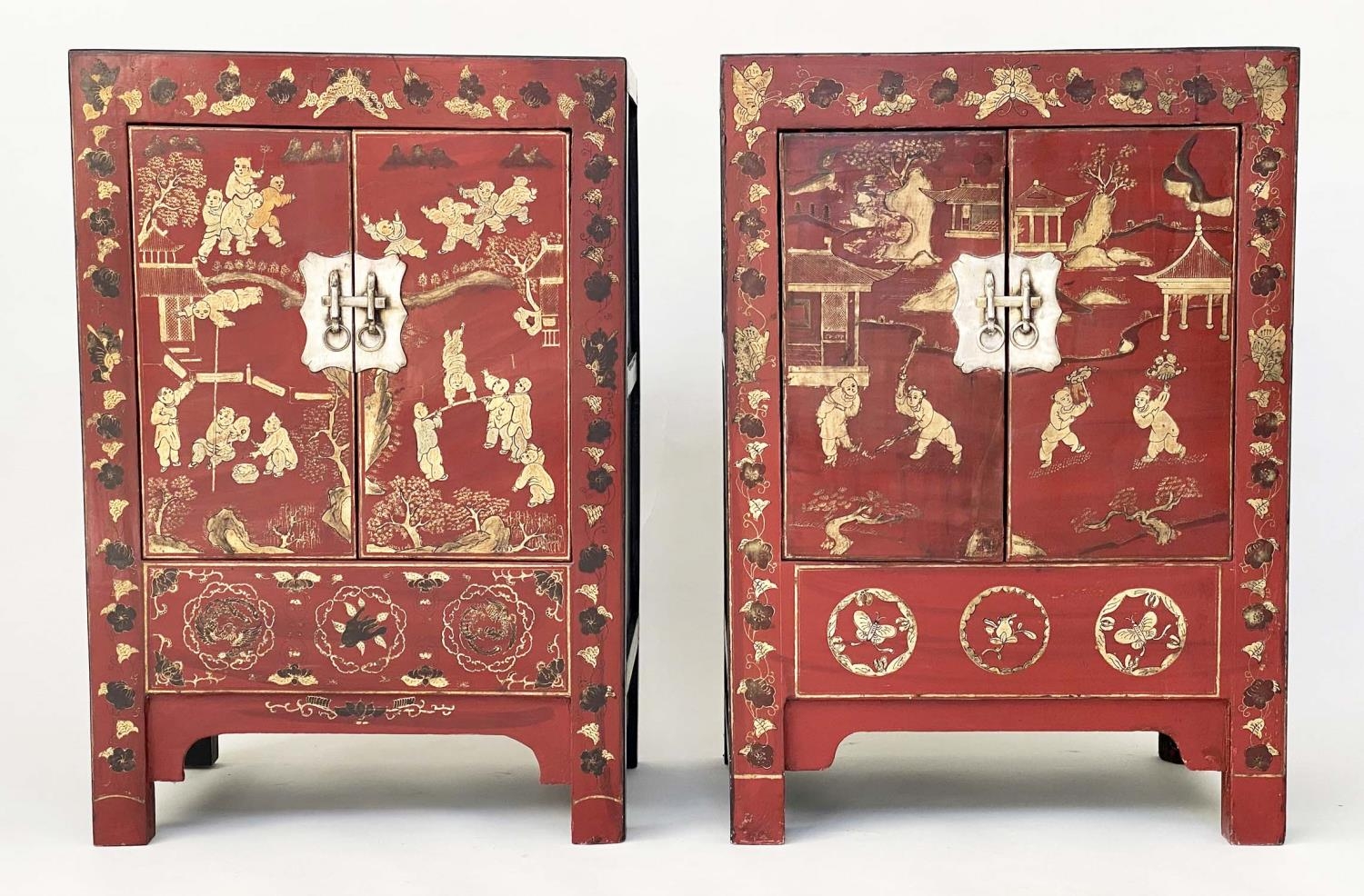 CHINESE CABINETS, a pair, early 20th century scarlet lacquered Chinoiserie gilt decorated and silvered metal mounted each with two doors, 60cm W x 41cm D x 84cm H. (2)