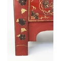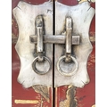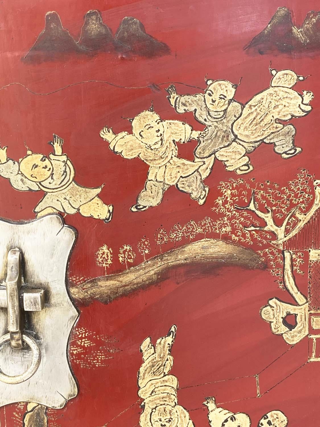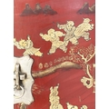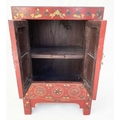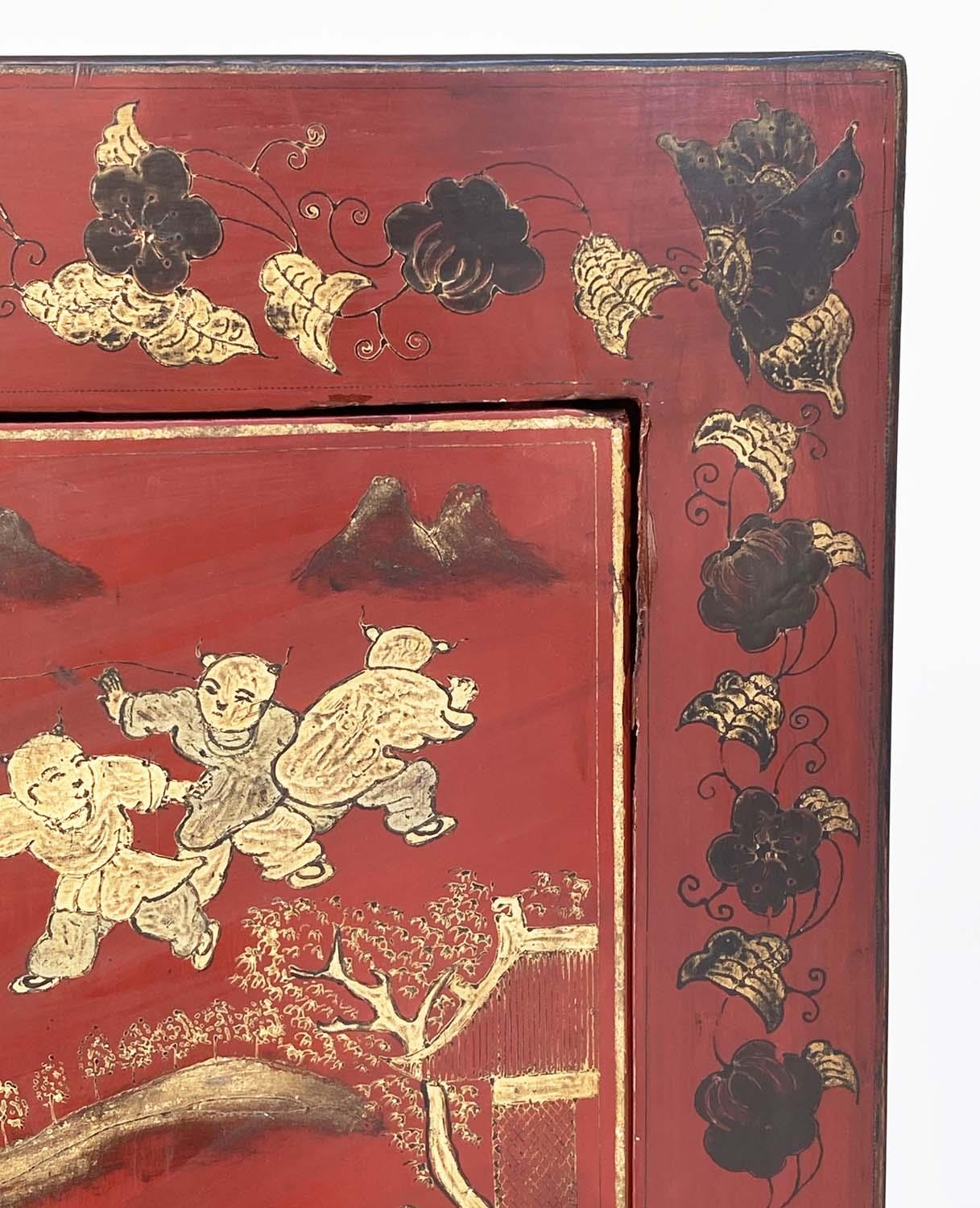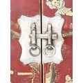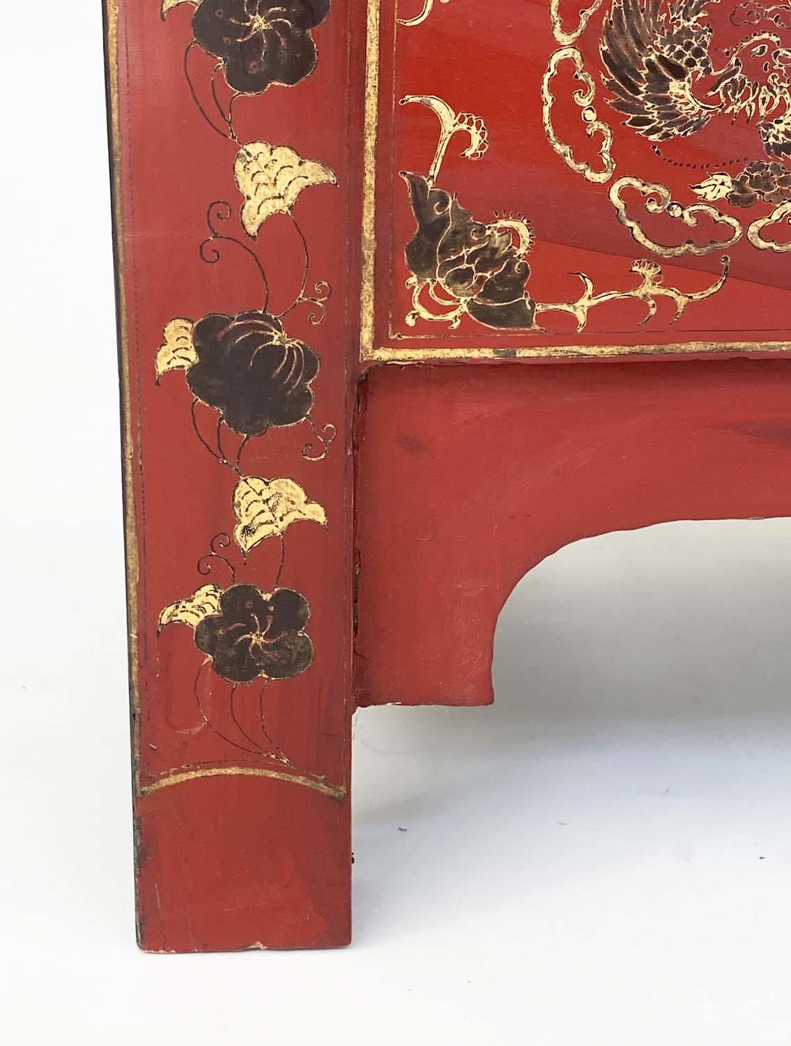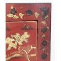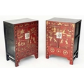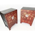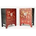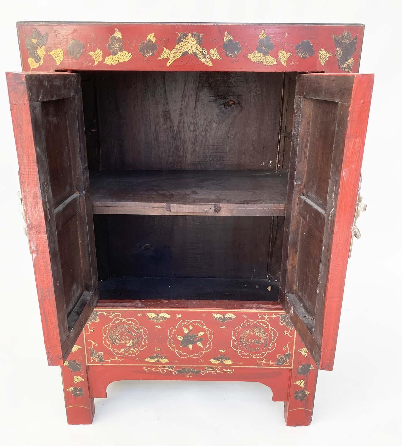CHINESE CABINETS, a pair, early 20th century scarlet lacquered Chinoiserie gilt decorated and silvered metal mounted each with two doors, 60cm W x 41cm D x 84cm H. (2)