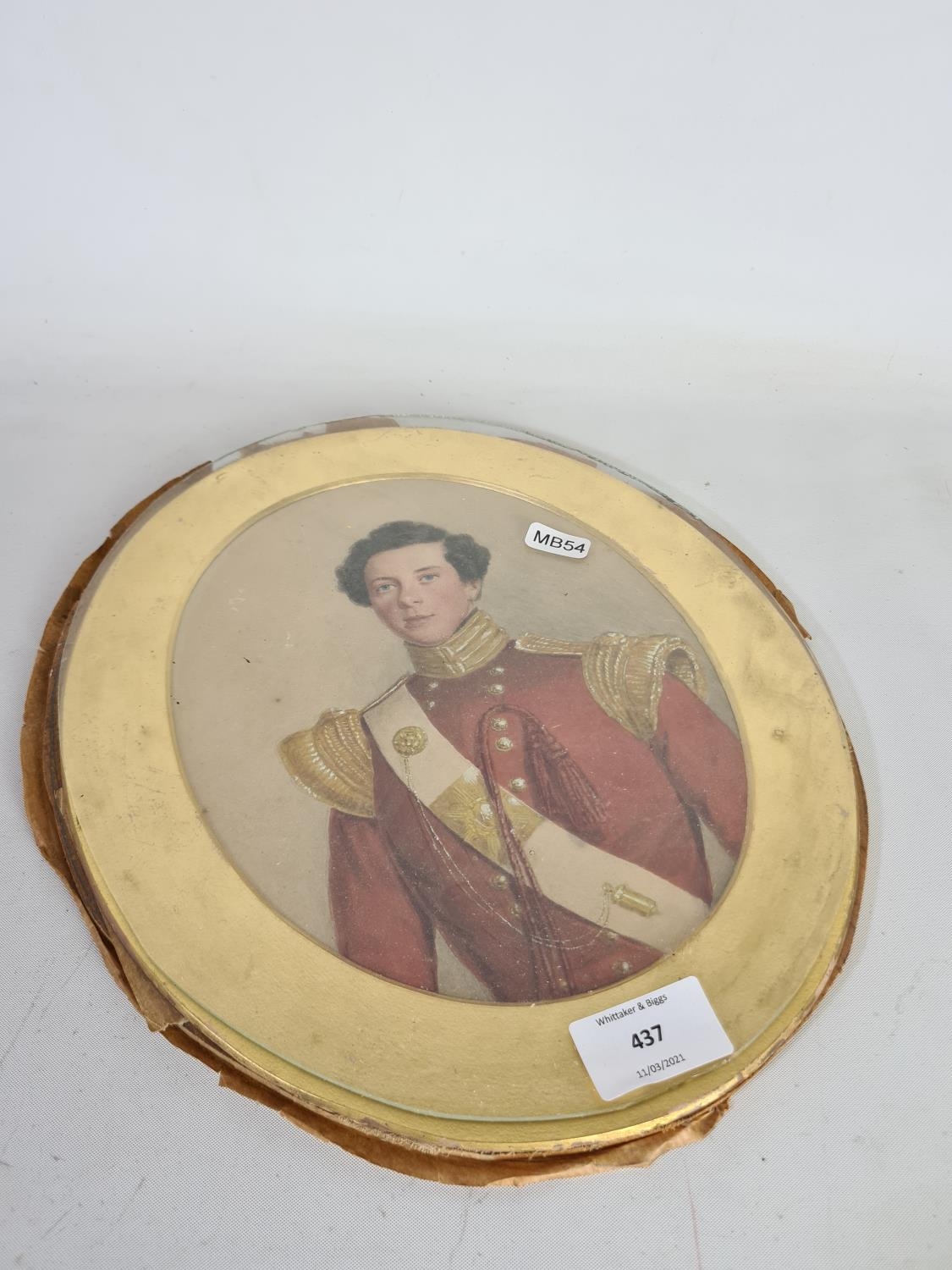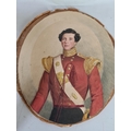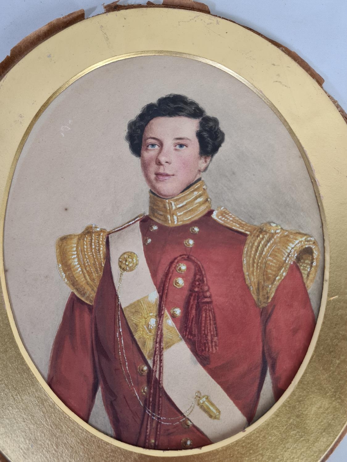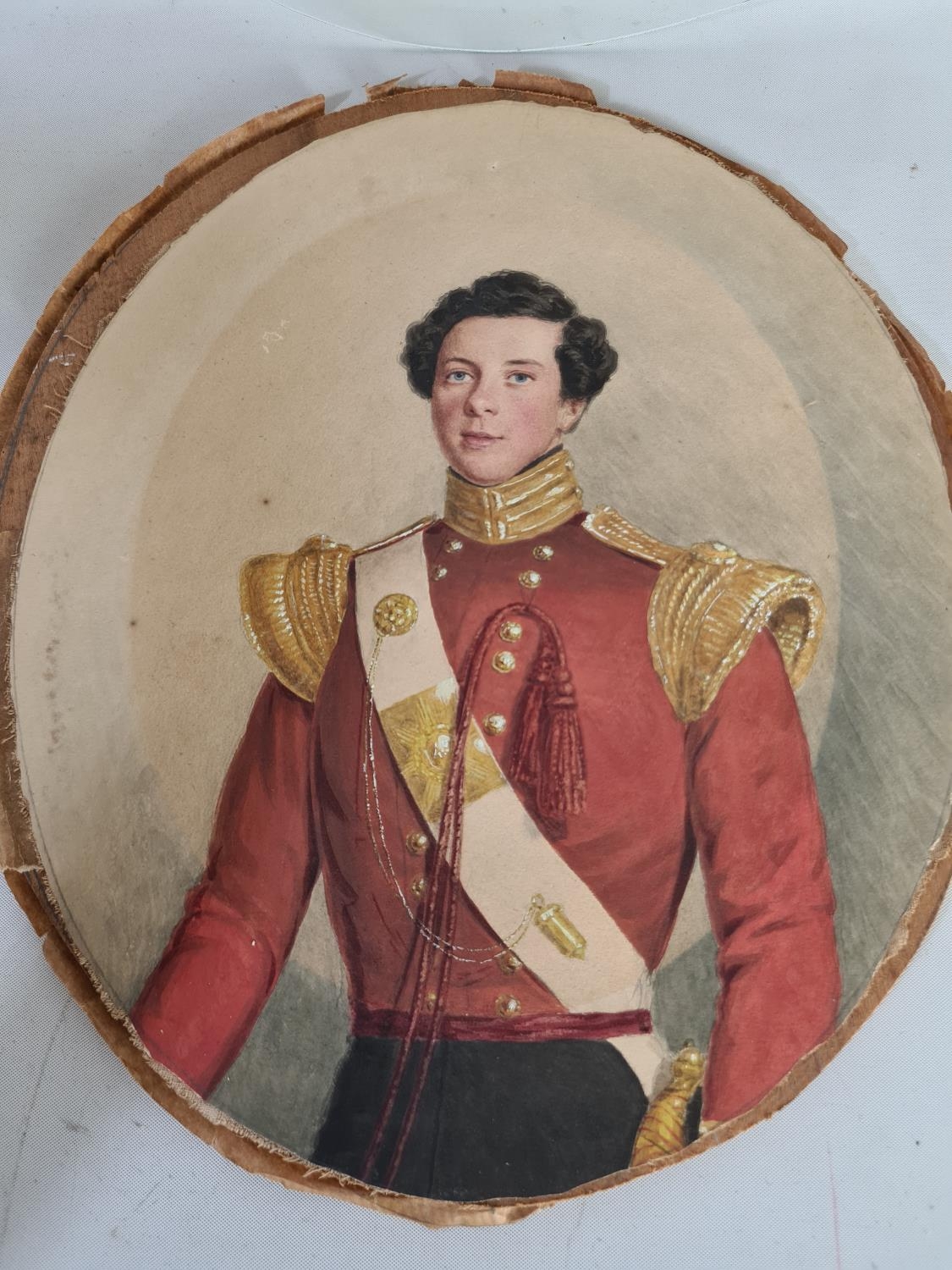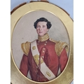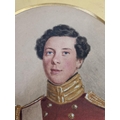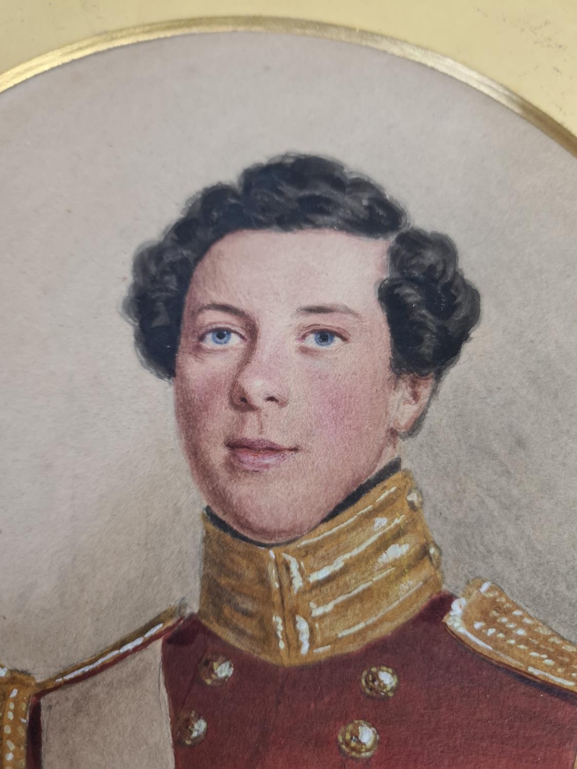 A 19th century oval watercolour portrait of a young gentleman wearing military uniform - approx. 30cm x 25cm excluding frame