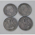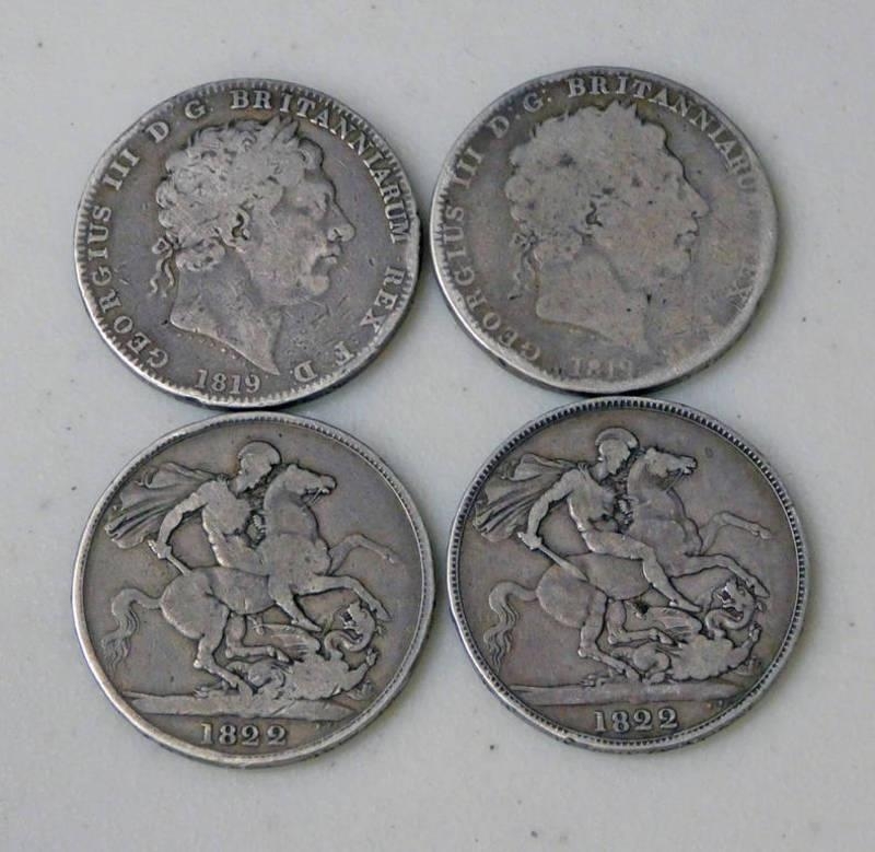 TWO 1819 GEORGE III CROWNS & TWO 1822 GEORGE IV CROWNS