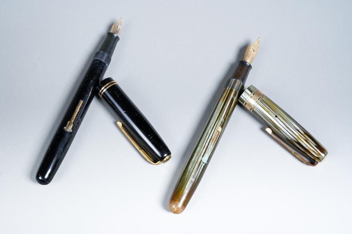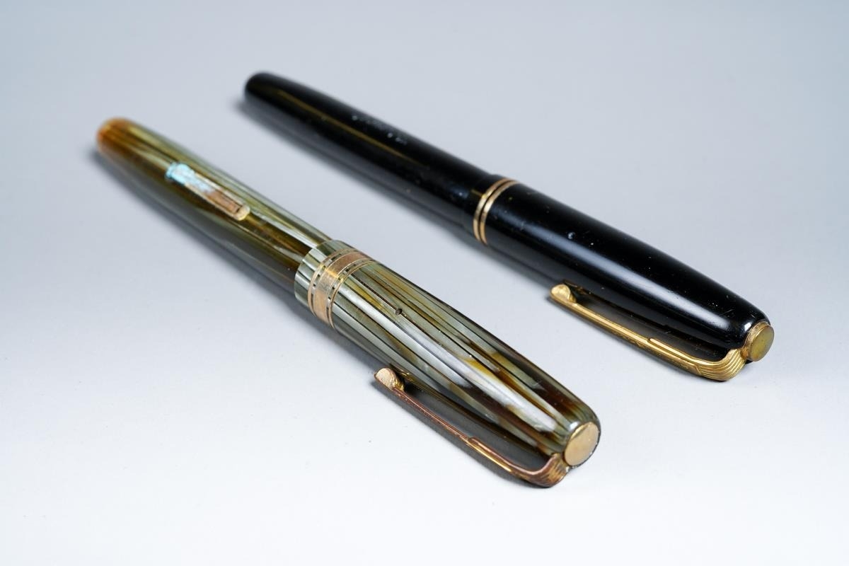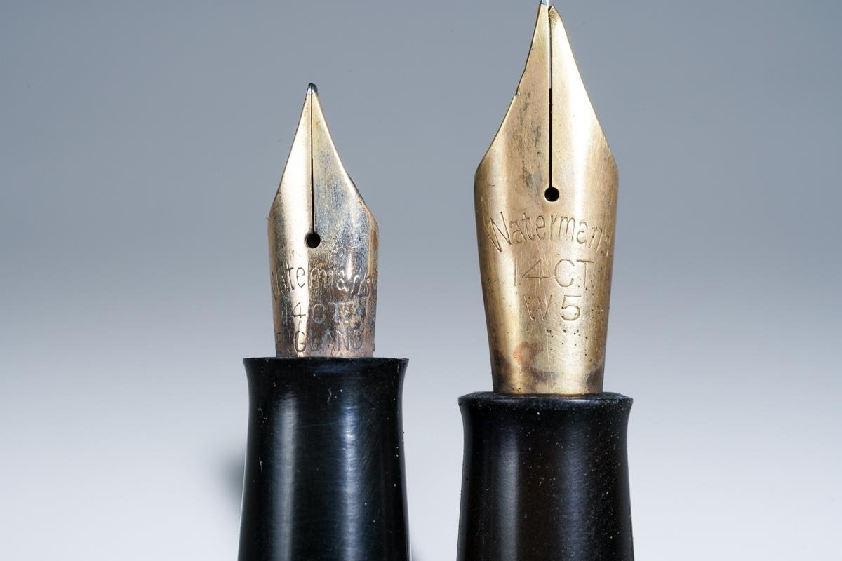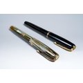 A vintage Waterman W5 grey striated lever fill fountain pen with gilt bands to cap, the nib stamped Waterman W5 together with a vintage Waterman black and gilt lever fill fountain pen, the nib stamped WATERMAN'S 14ct ENGLAND [2]