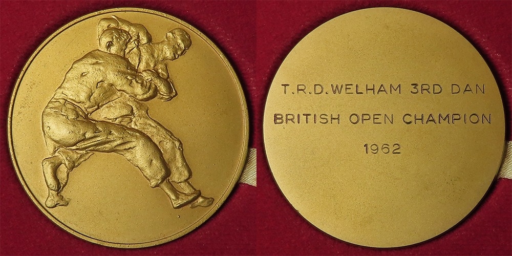 British Sporting Medal (judo): A 55mm gilt bronze medal, reverse engraved 'T.R.D. WELHAM 3RD DAN BRITISH OPEN CHAMPION 1962'. Obverse with raised image of two judo fighters in action. Contained in a blue Royal Mint case. Weight 85.5g.