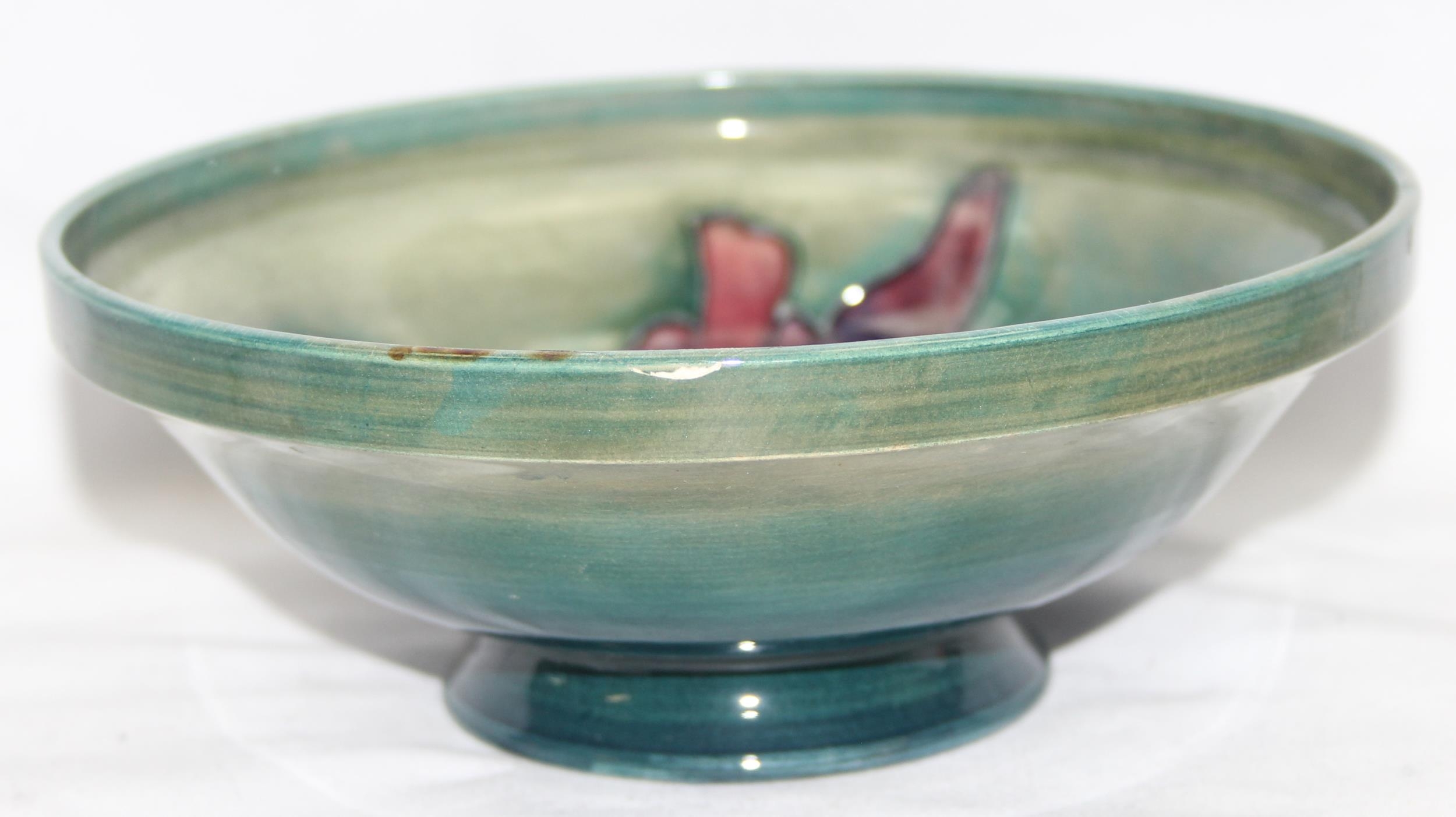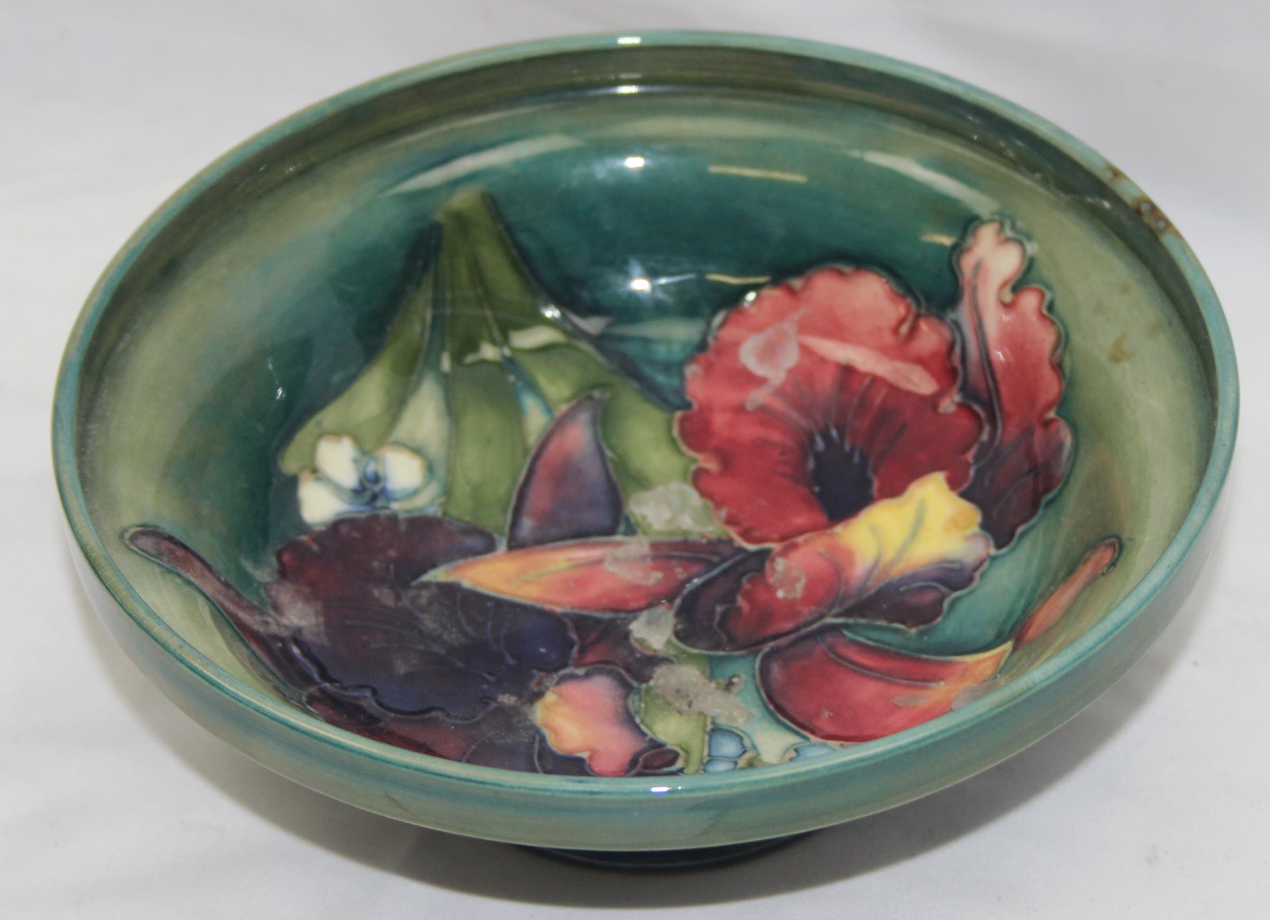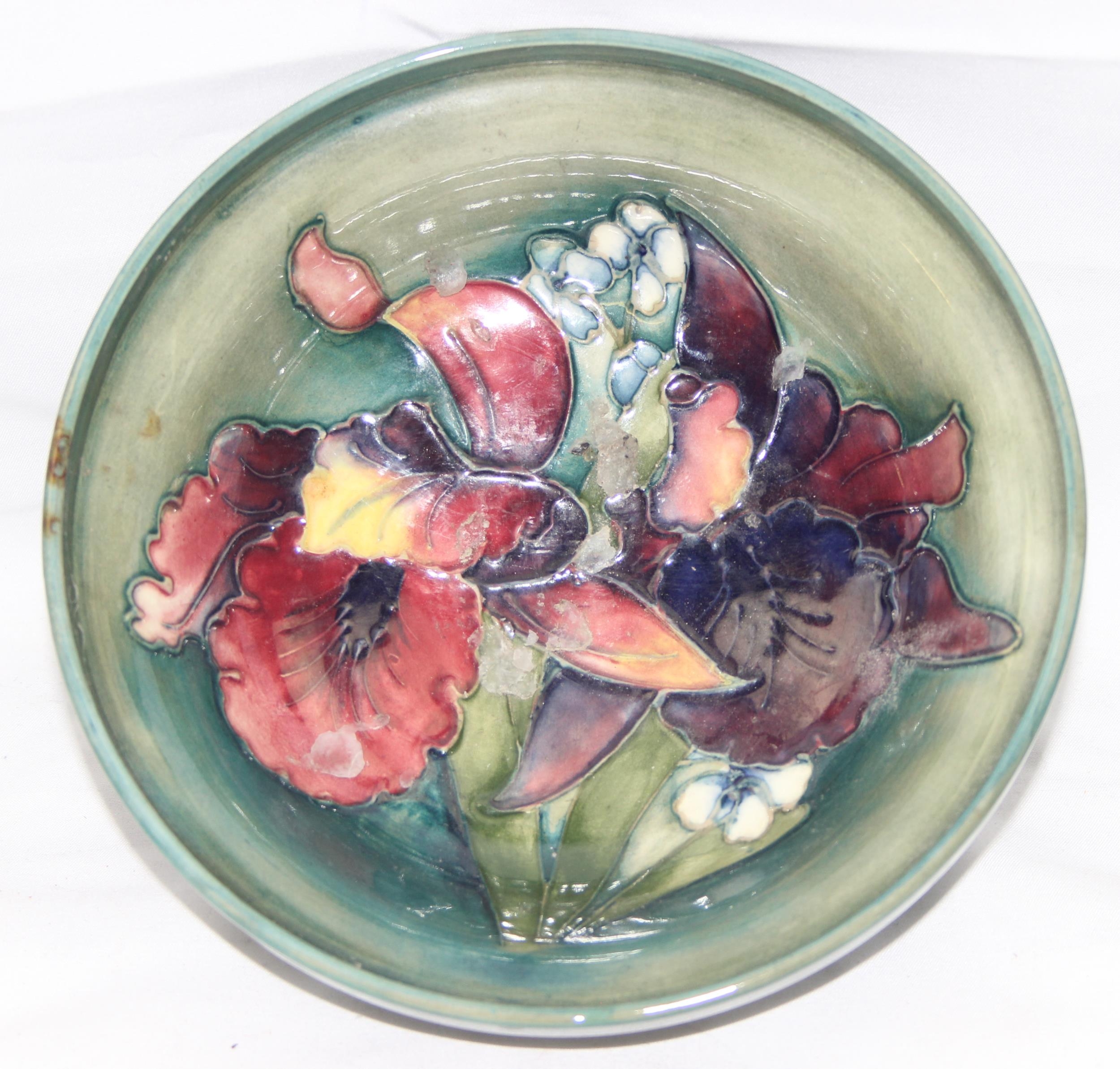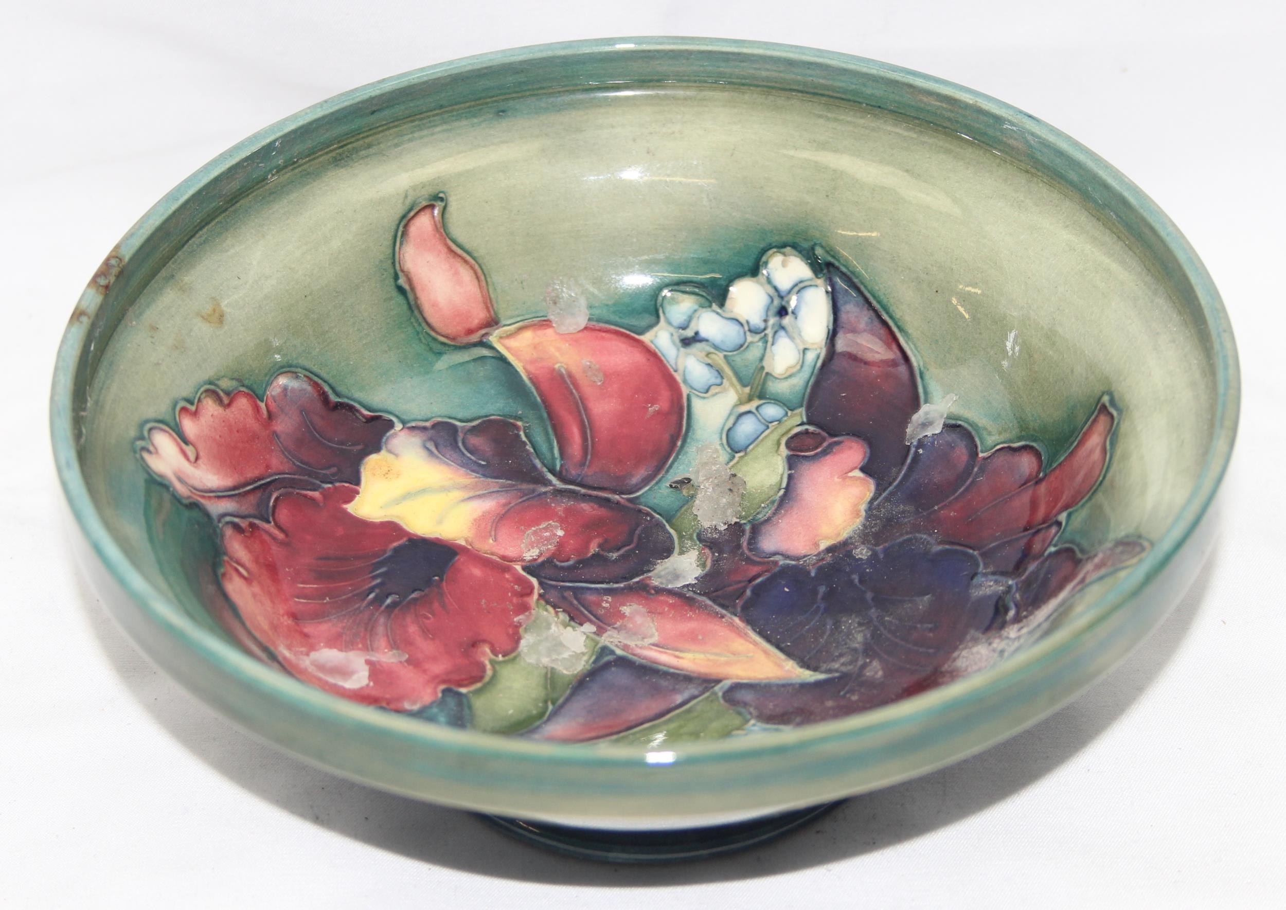 Moorcroft pottery footed bowl in the Orchid pattern (af), approx 17cm diam