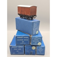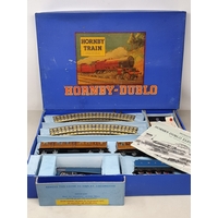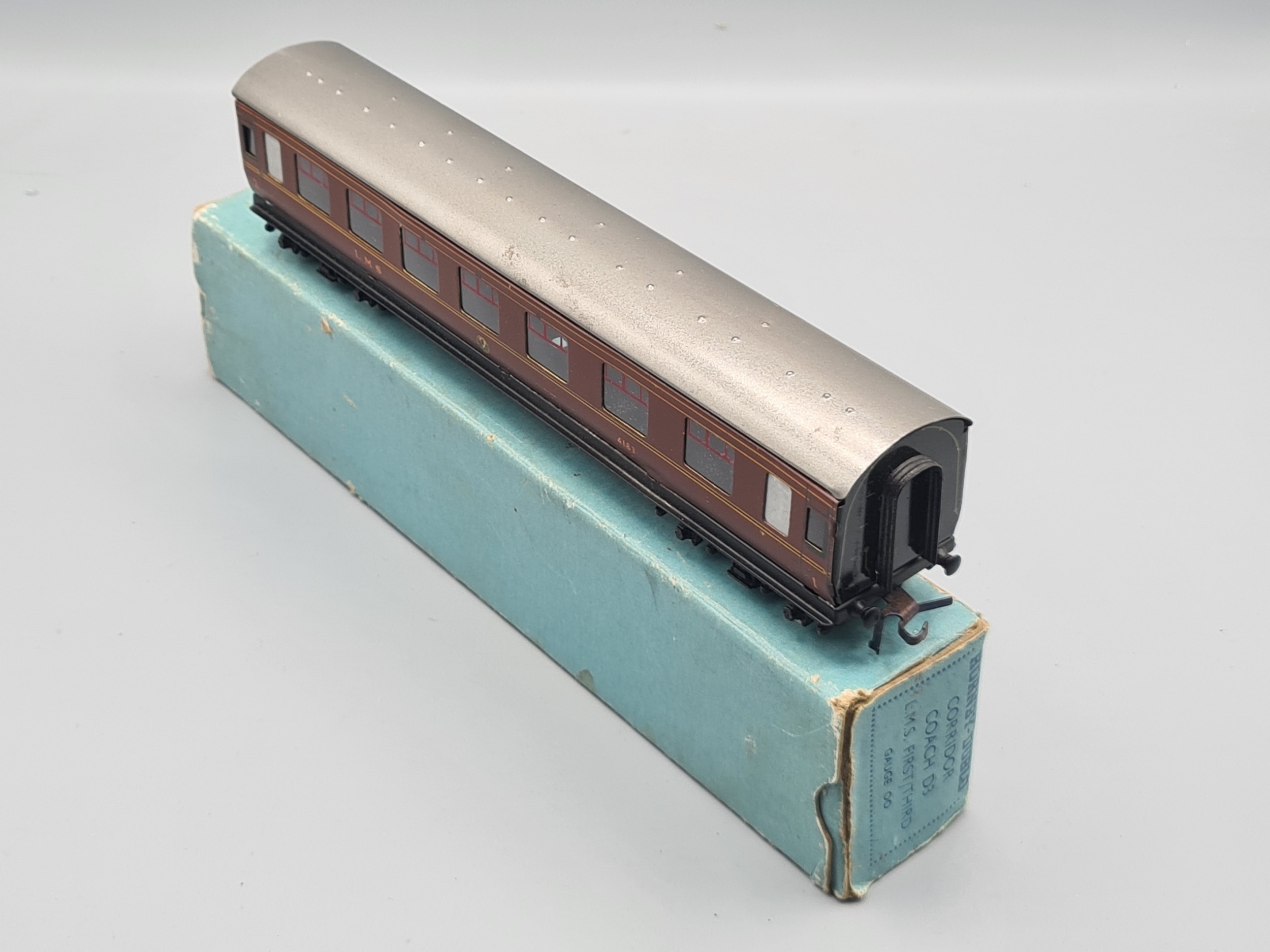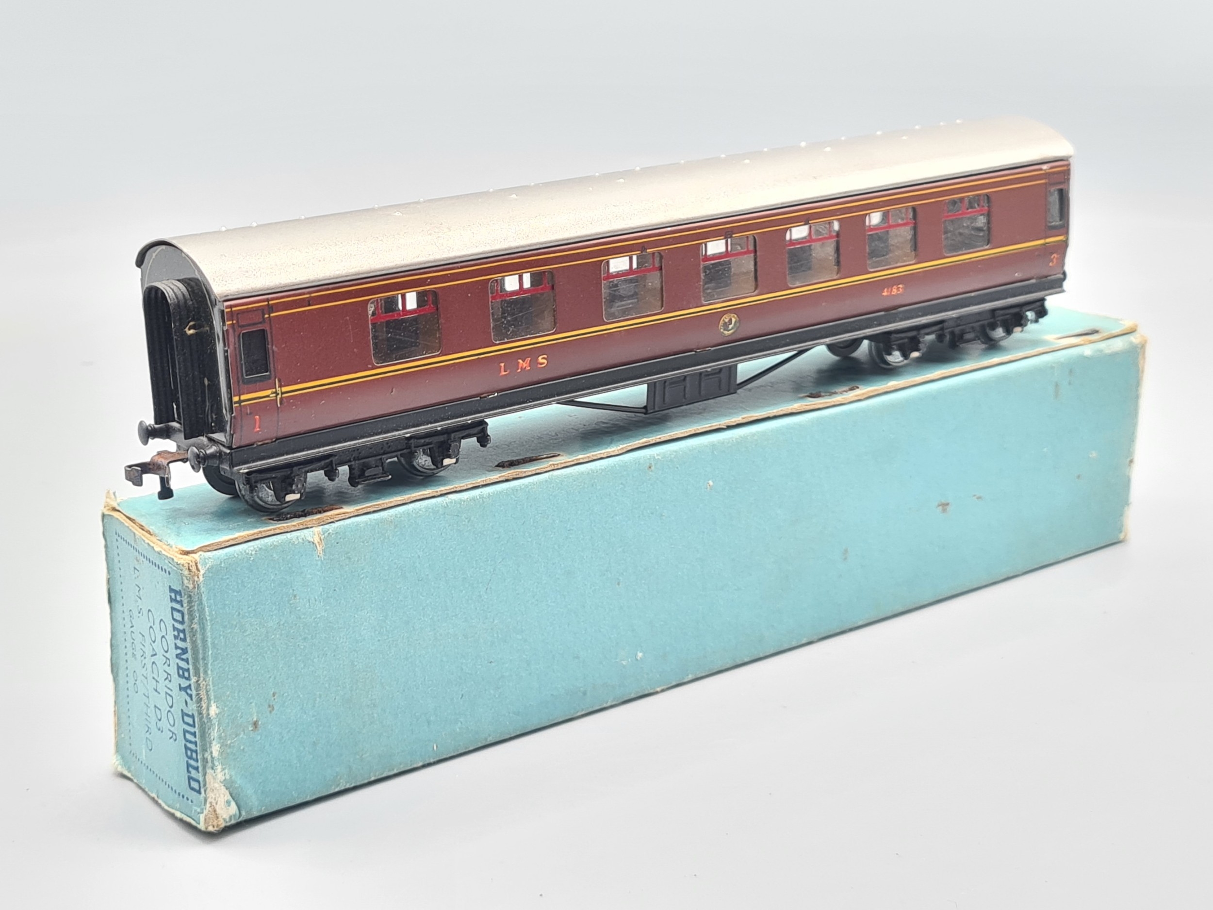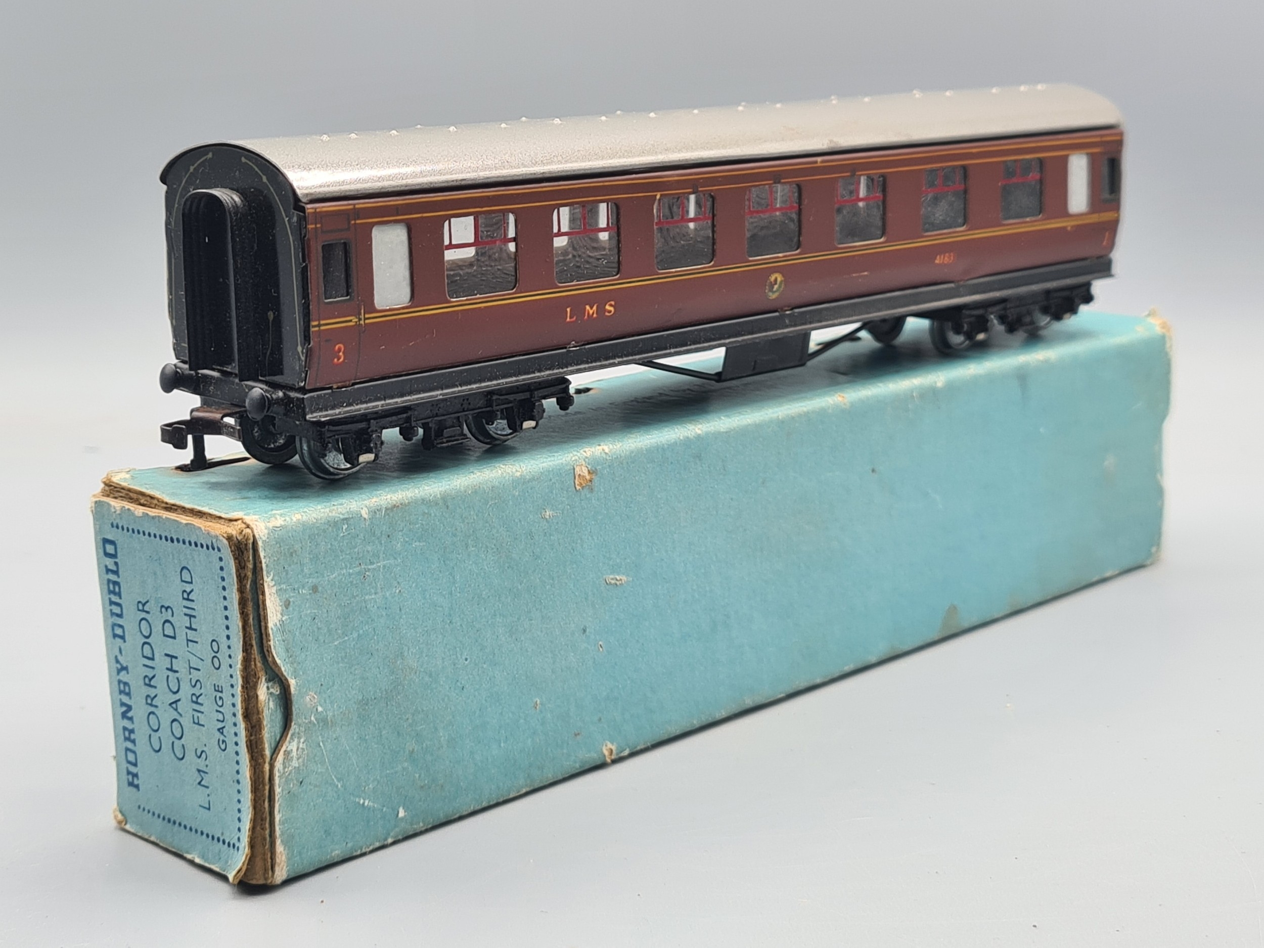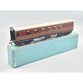 A boxed Hornby Dublo D3 LMS 1/3rd Coach, M, in the rare 4/48 box of which few were made with a production run of 1500 theoretically but few have been found. Please note the coach has a very matt finish to tinplate possibly produced pre-war
