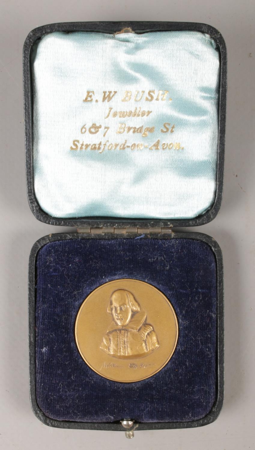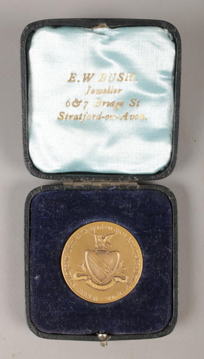 A Shakespeare medal, with portrait on one side, and birth and death dates to the reverse, cased in original box, stamped for Stratford on Avon.
