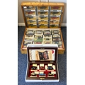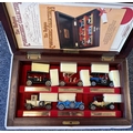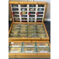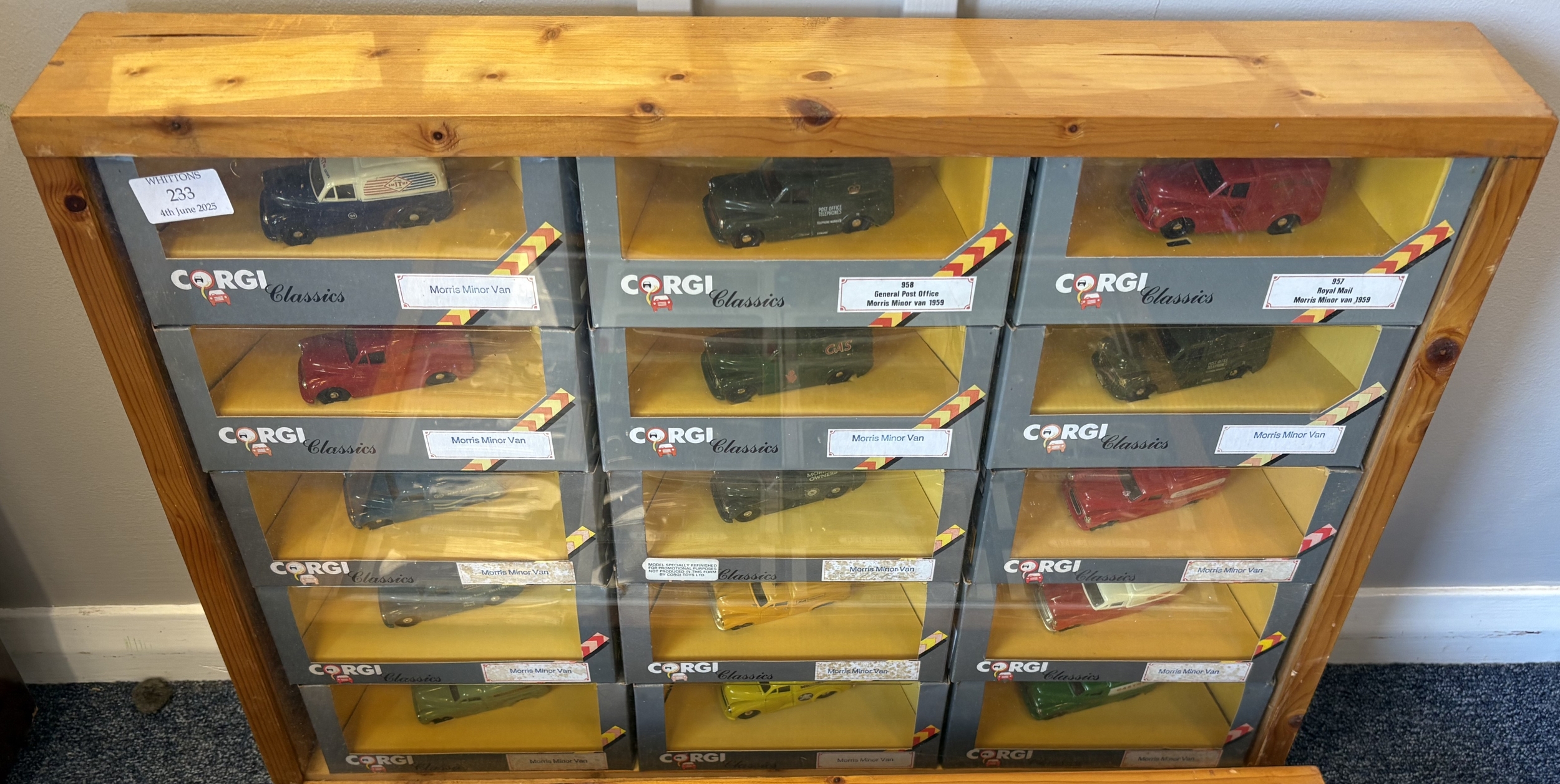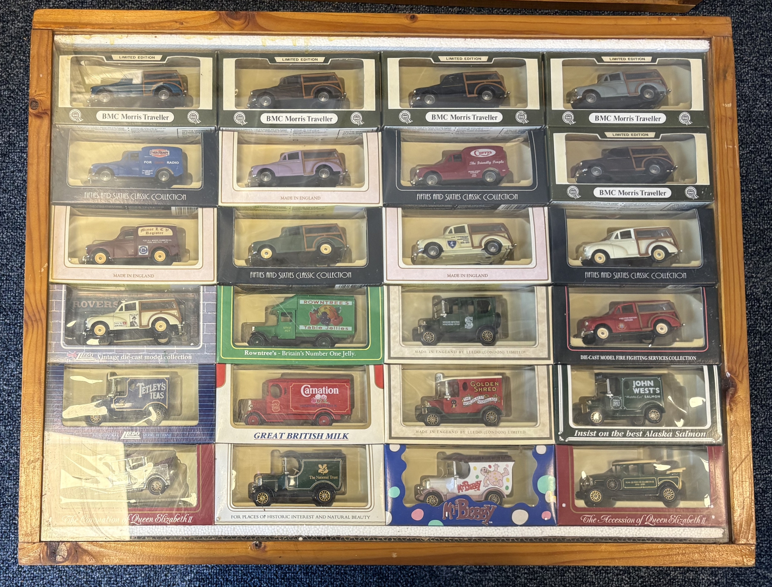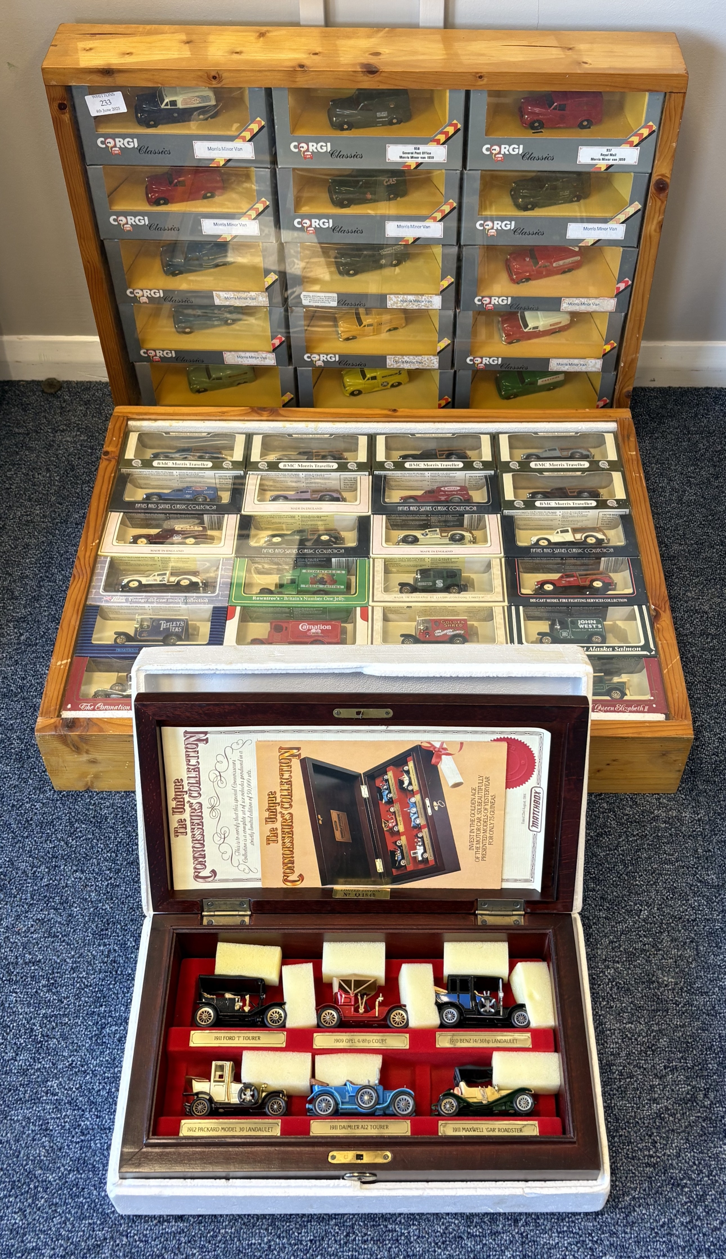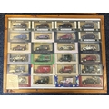 Two framed and glazed display cabinets containing various 'Corgi' Morris Minor diecast model vehicles and other model vehicles together with a boxed 'Connoisseurs Limited Edition Collection'. Est. £20 - £30.