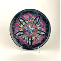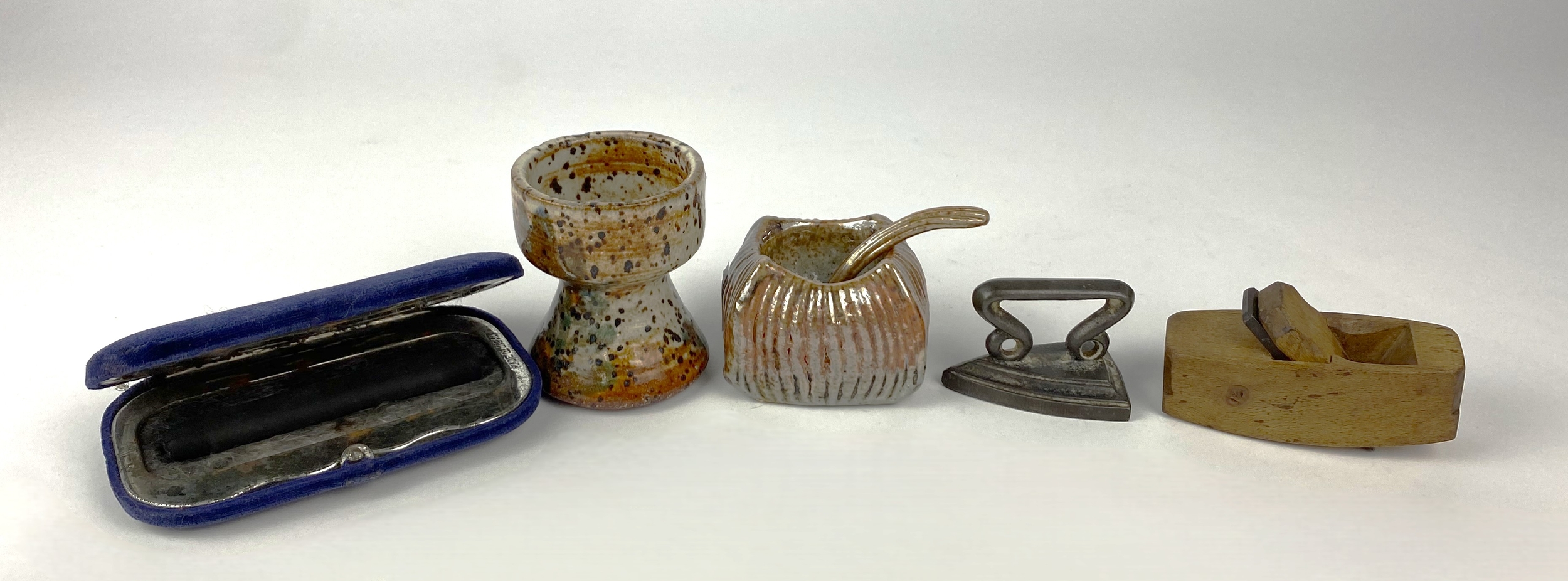 A Maze Hill Pottery studio pottery salt with spoon, of ribbed square shaped form with iridescent glaze, impressed marks to base, together with a speckle glazed studio pottery egg cup, indistinctly signed, a miniature model of a wooden plane, a miniature iron and a vintage Japanese charcoal handwarmer