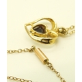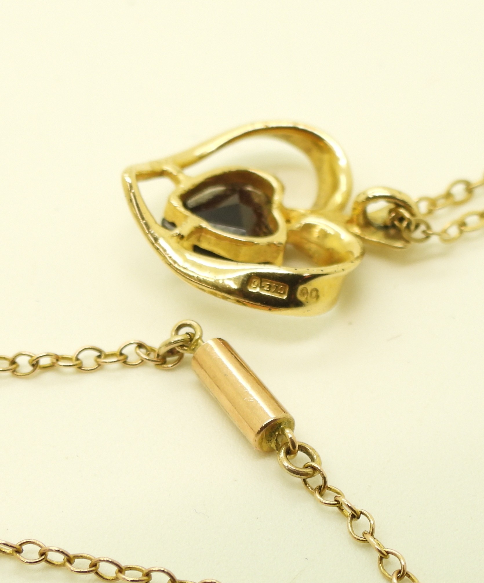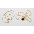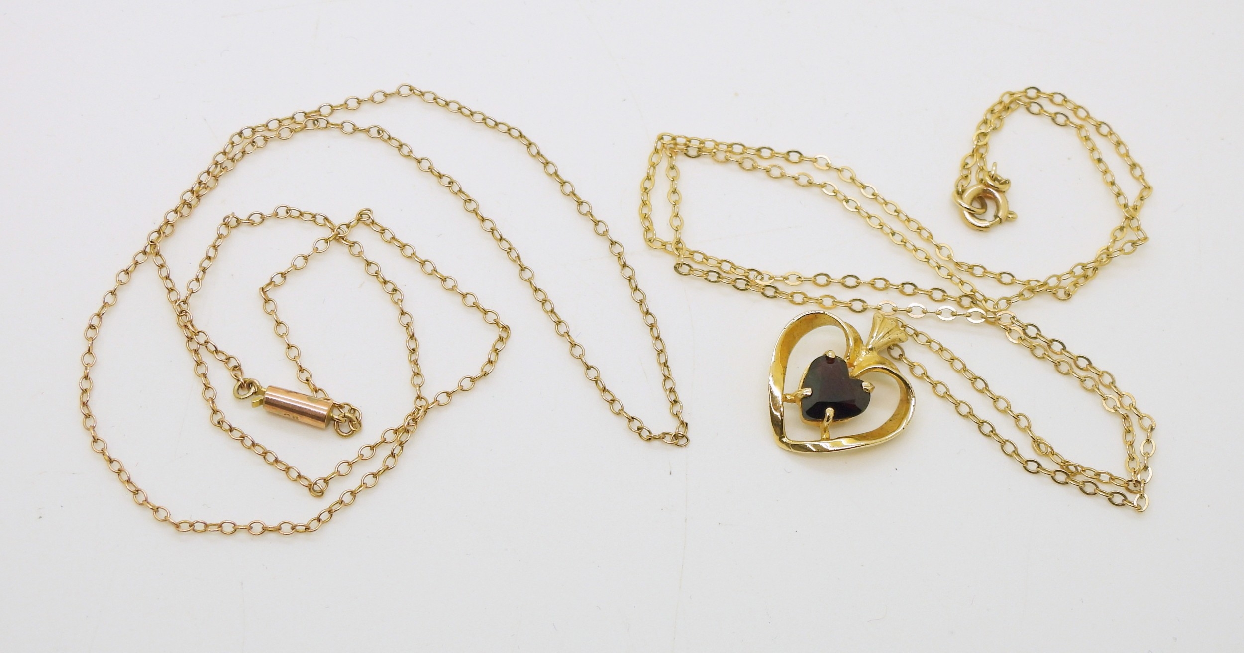 A 9ct gold heart shaped garnet pendant and yellow metal chain. length of pendant 1.7cm, chain 42cm, together with a further 9ct gold chain, length 41cm, weight 3.7gms