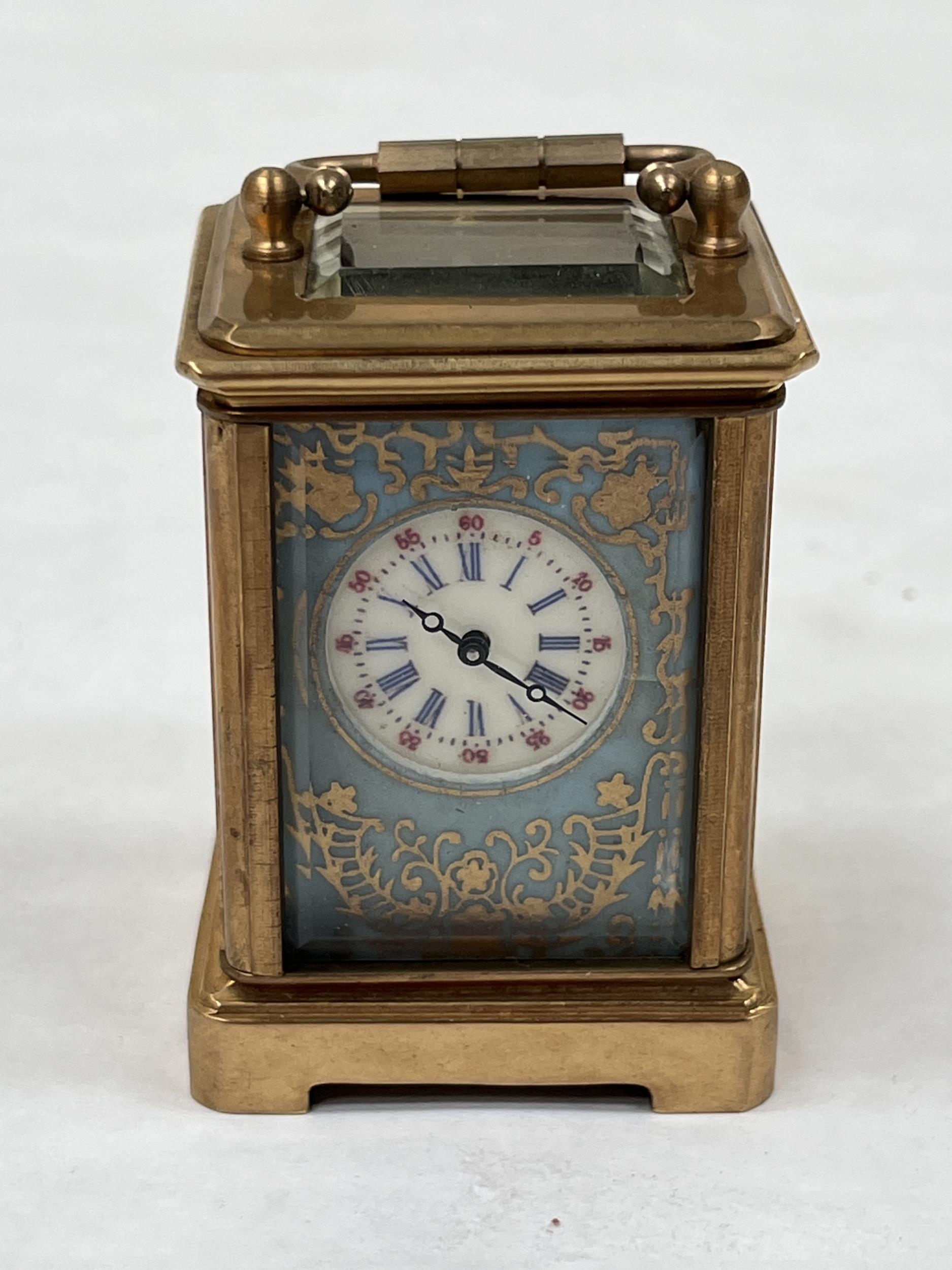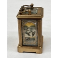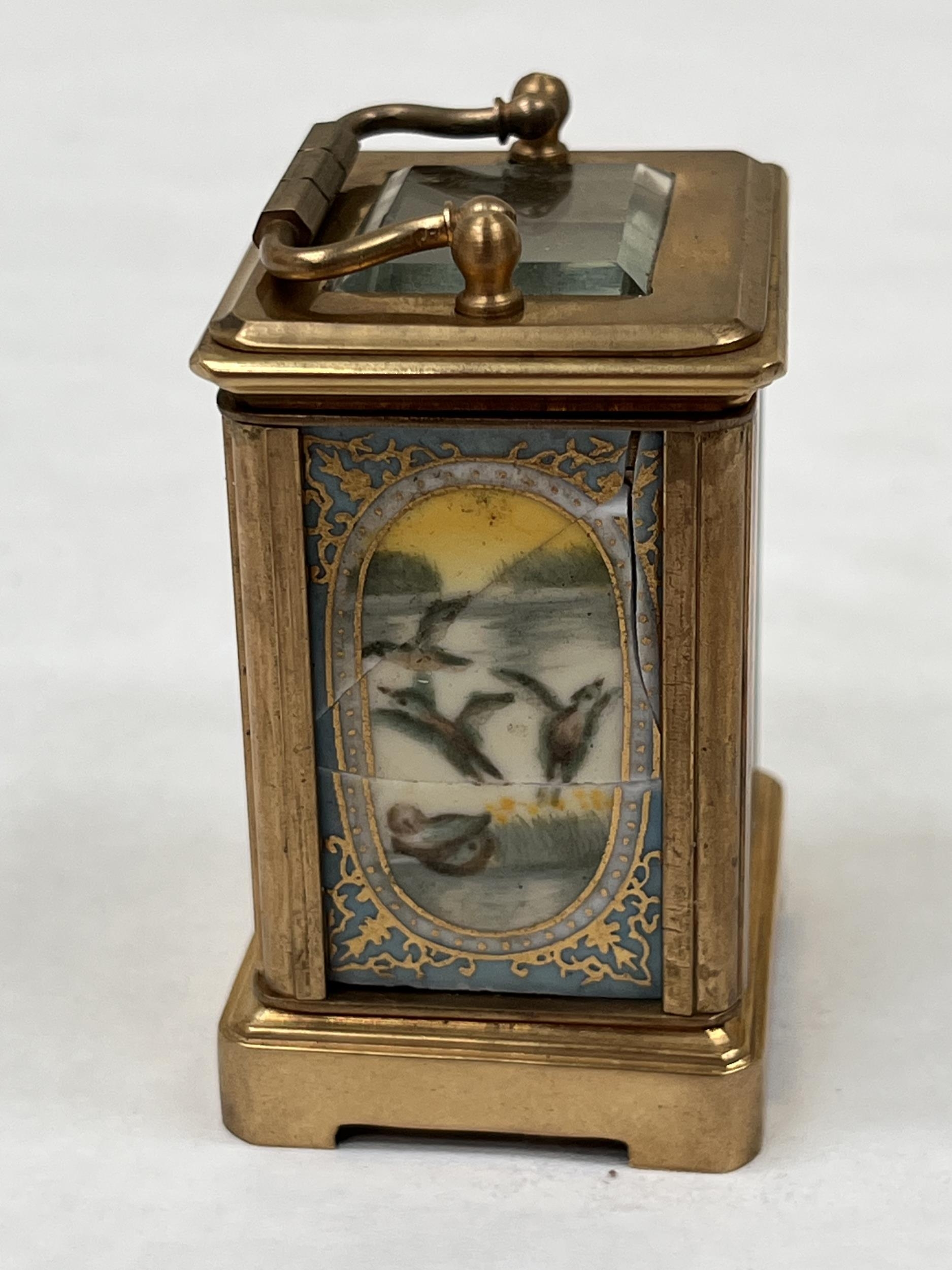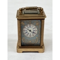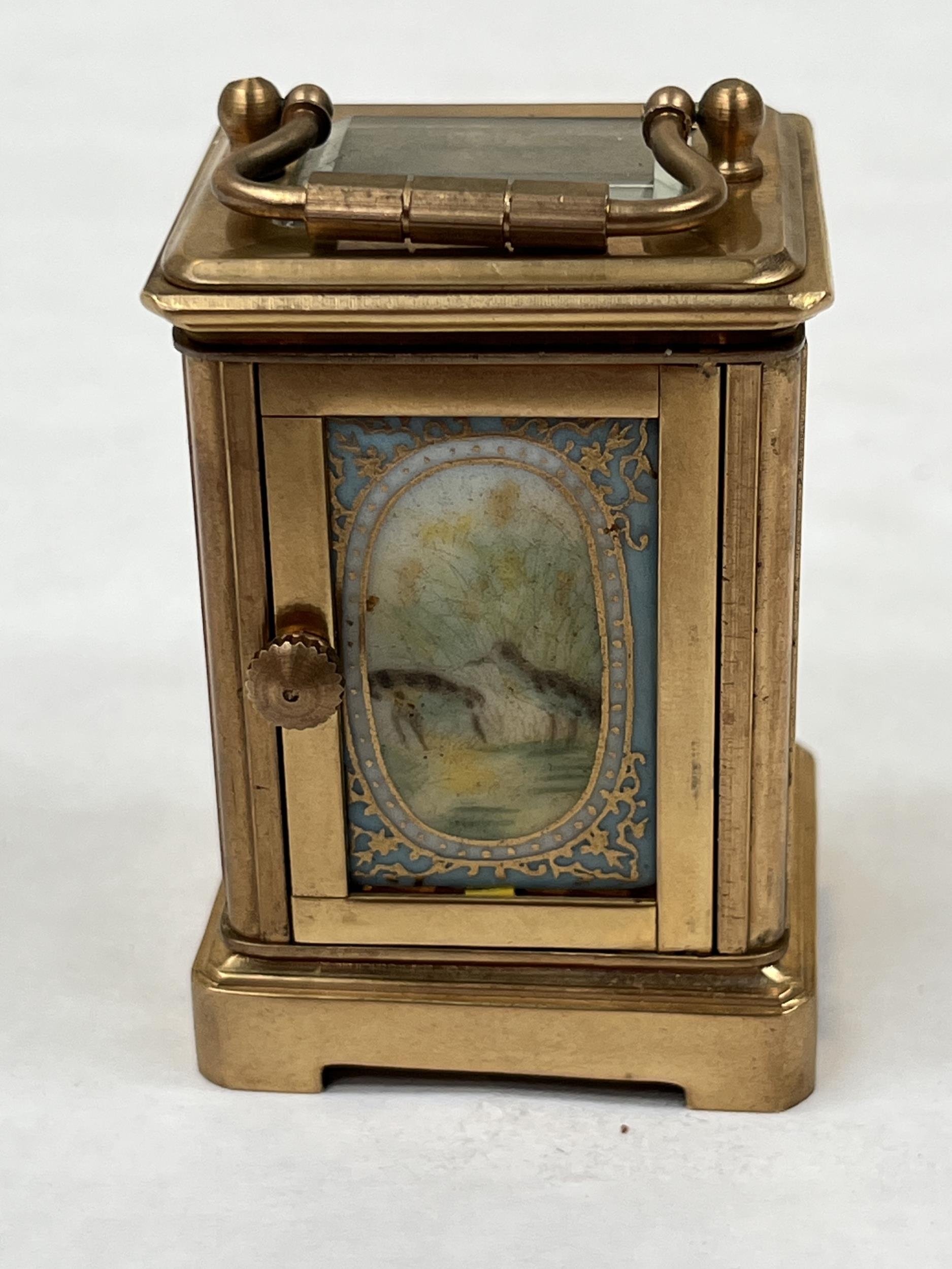 A late 19th century French gilt brass miniature carriage timepiece, the dial sides and back with gilded Limoges panels. One glass pane A.F. 2¼' high.