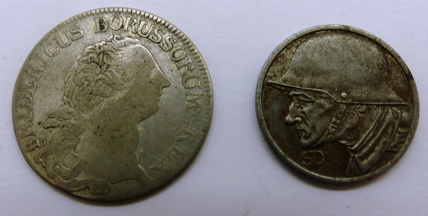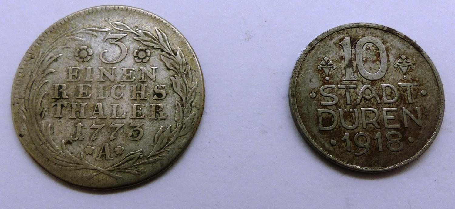 1773 silver German 3 Einen Reichs Thaler and a 1918 WWI coin. P&P Group 0 (£5+VAT for the first lot and £1+VAT for subsequent lots)