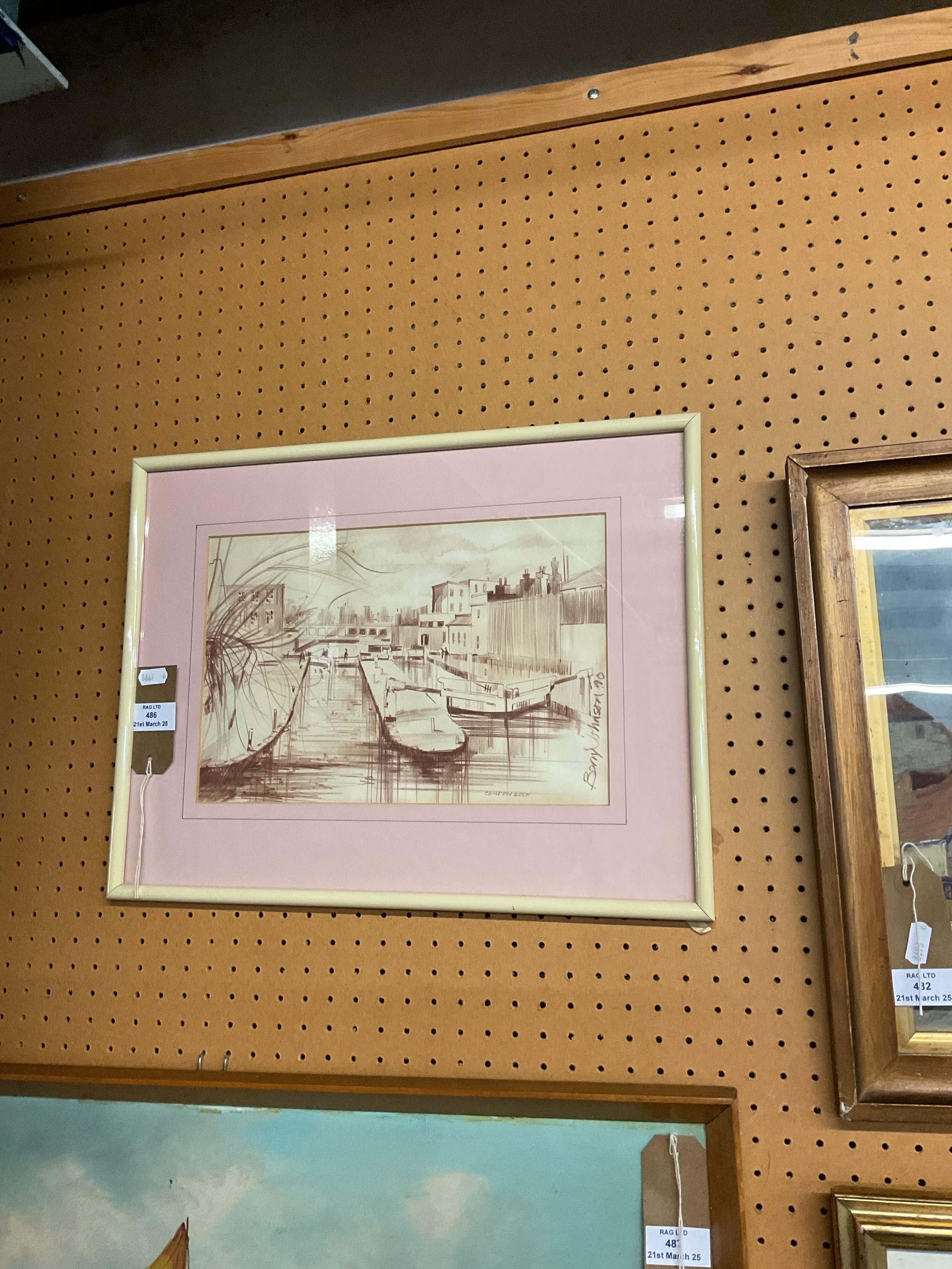 A mounted framed and glazed crayon drawing depicting 'Camden Lock' by local artist Barry Johnson dated 90