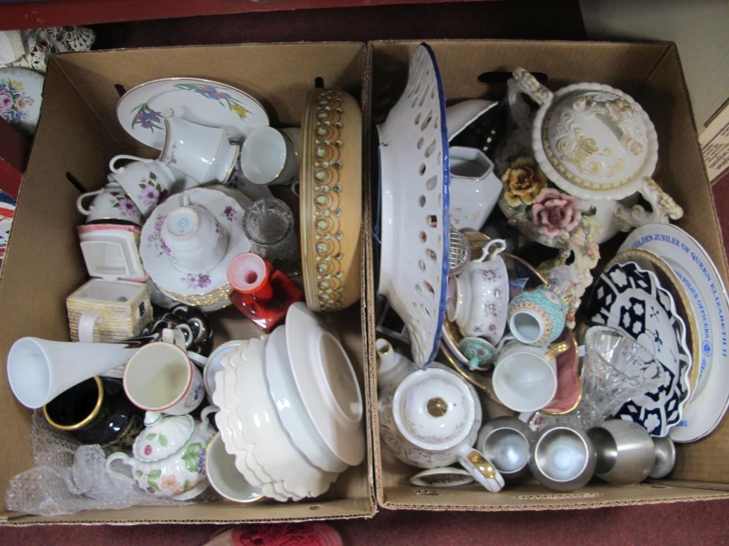 Glass Vases, Startford stoneware fruit bowl, musical teapot, Czech teaware, other ceramics, pewter goblets:- Two Boxes