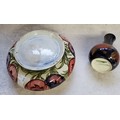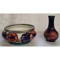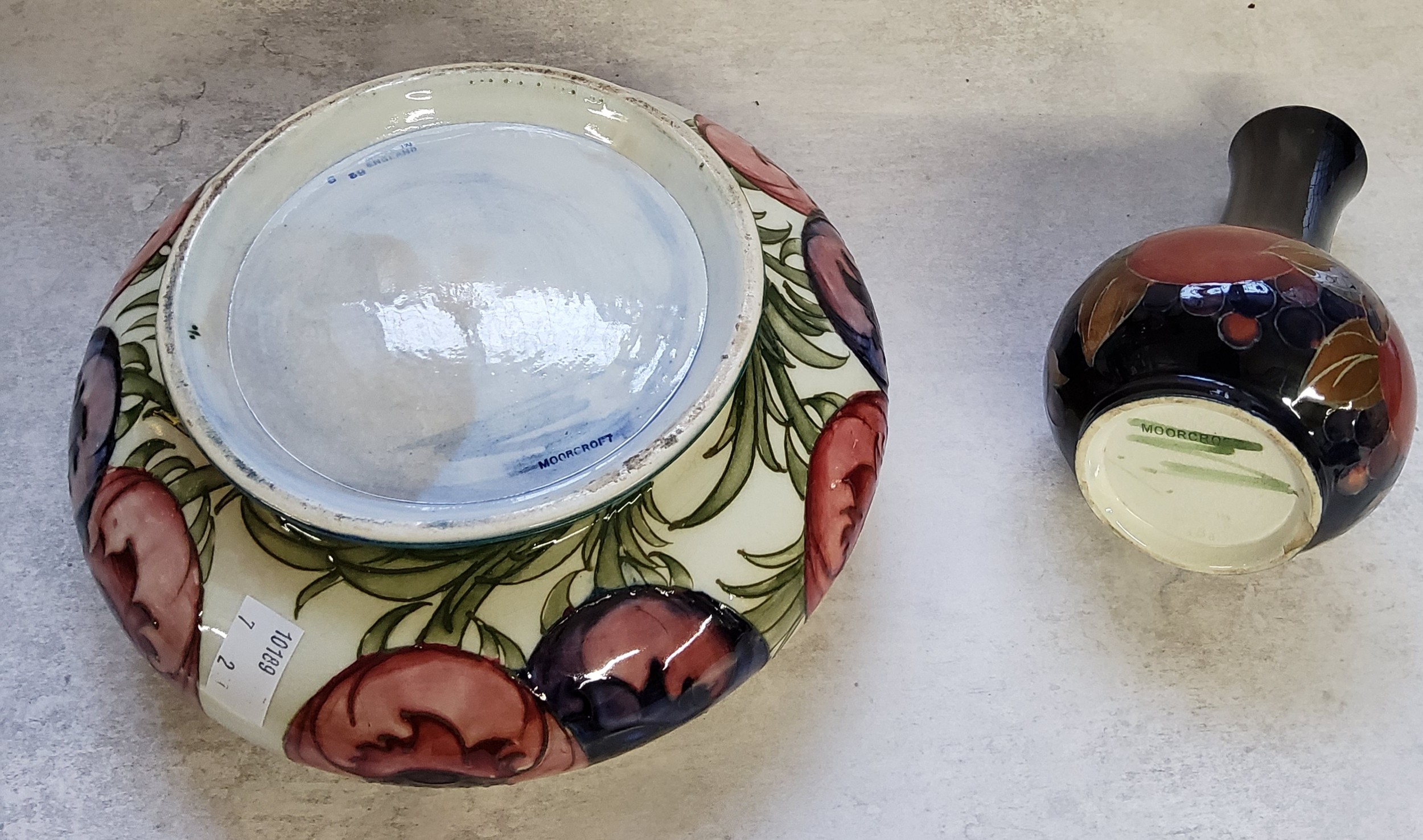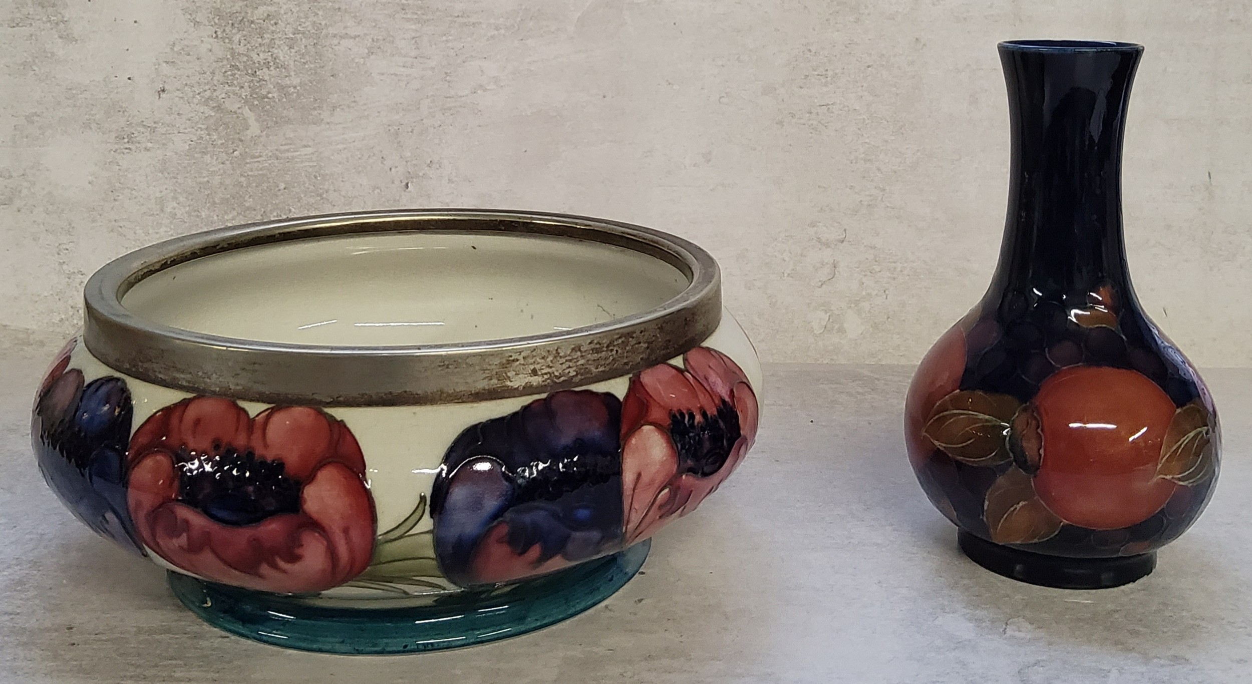 A Walter Moorcroft bud vase, pomegranate pattern, c1947-1953 Walter Moorcroft initial mark with MOORCROFT and MADE IN ENGLAND; a Walter Moorcroft EPNS mounted pedestal fruit bowl, Big Poppy pattern, white ground, turquoise base, c1947-1953
