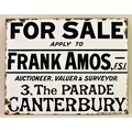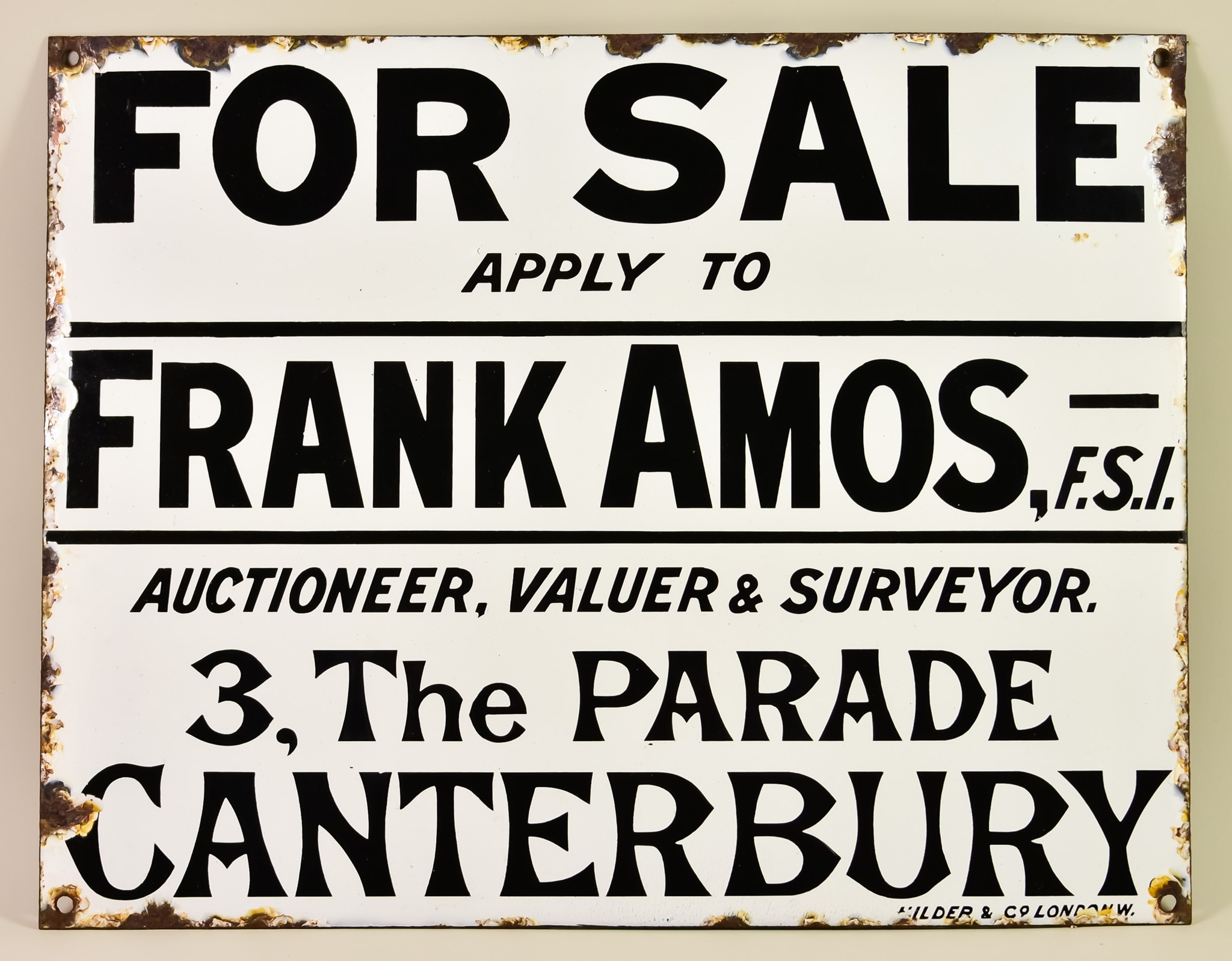 Of Canterbury Interest - An early 20th Century enamel sign by Hilder & Co, London, the white ground with black lettering reads 'For sale apply to Frank Amos, F.S.I. auctioneer, valuer and surveyor. 3 The Parade Canterbury, 14ins x18ins