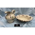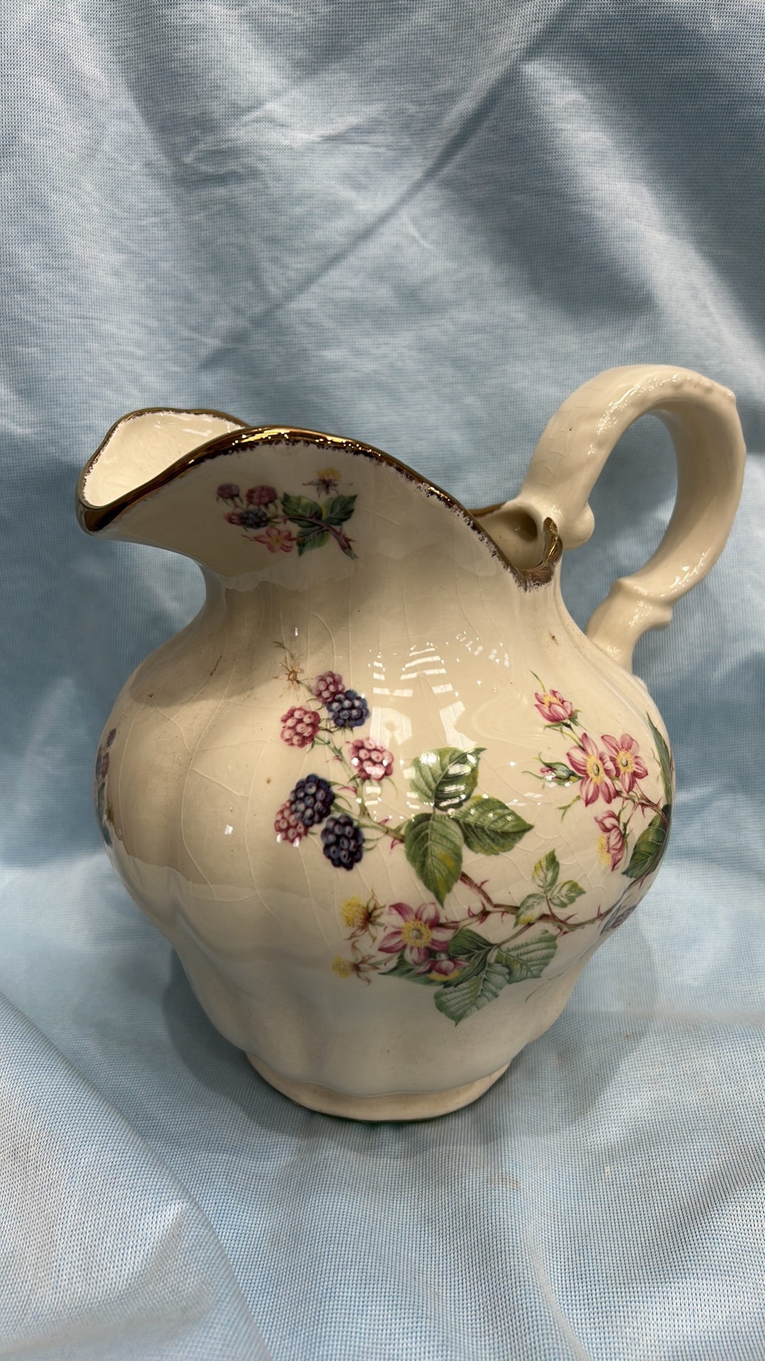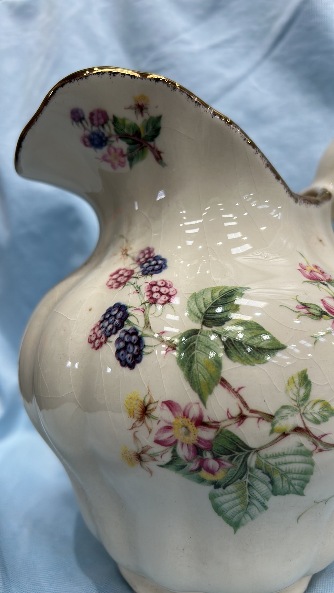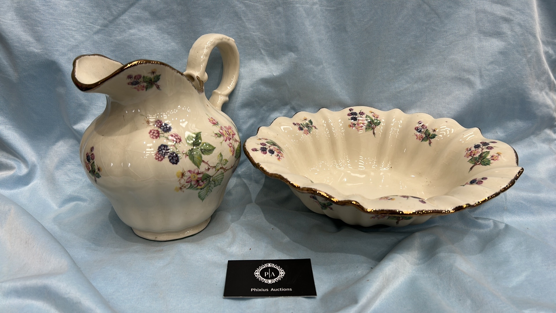 Pair of English Staffordshire ironstone wares comprising a baluster jug and scalloped fluted bowl, cream ground with transfer-printed blackberry blossom sprays and gilt rim accents.