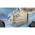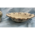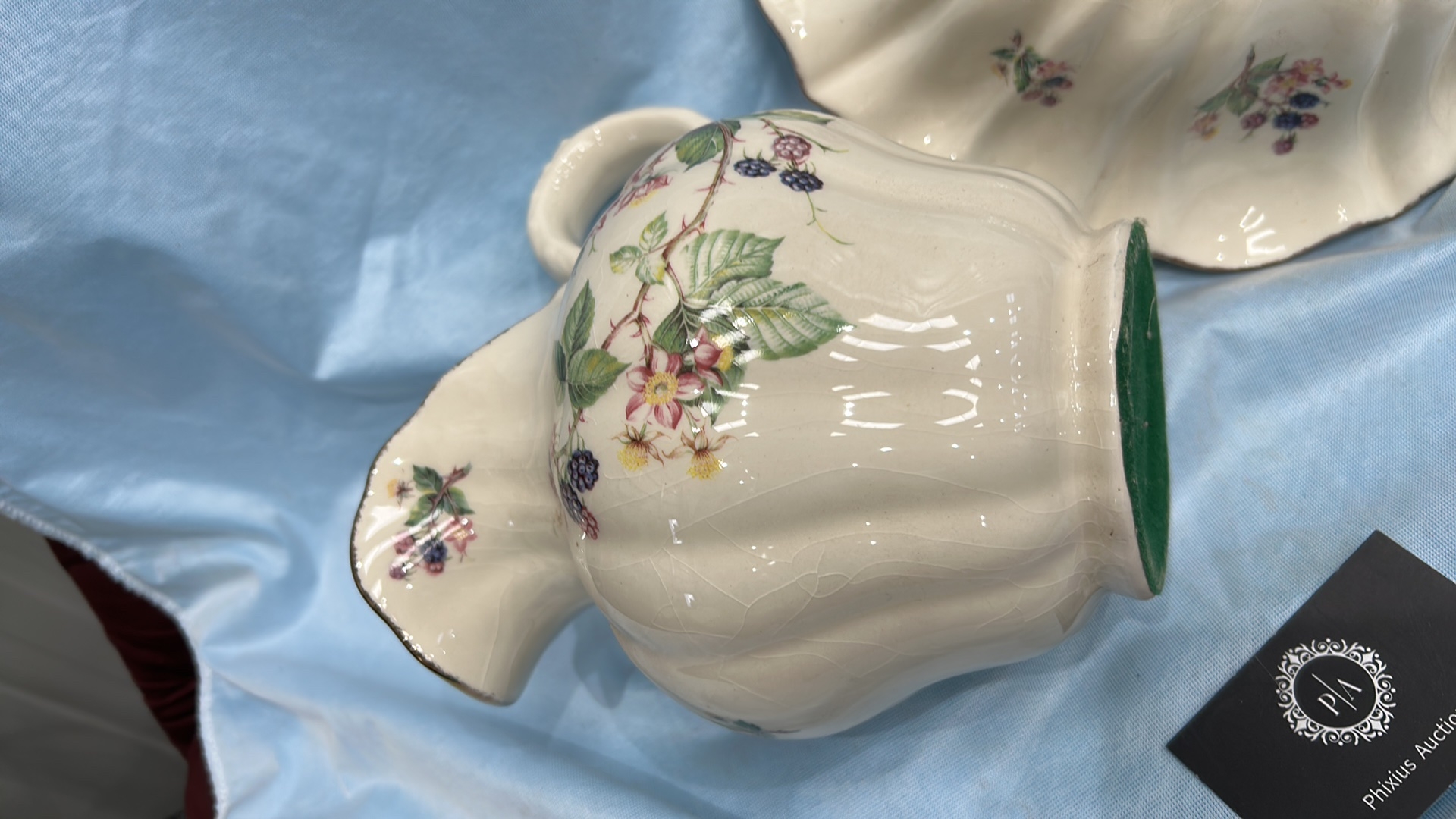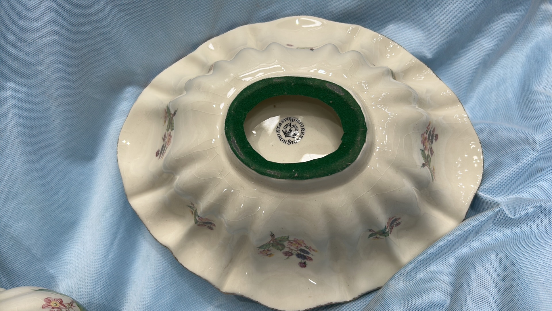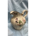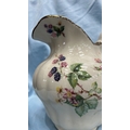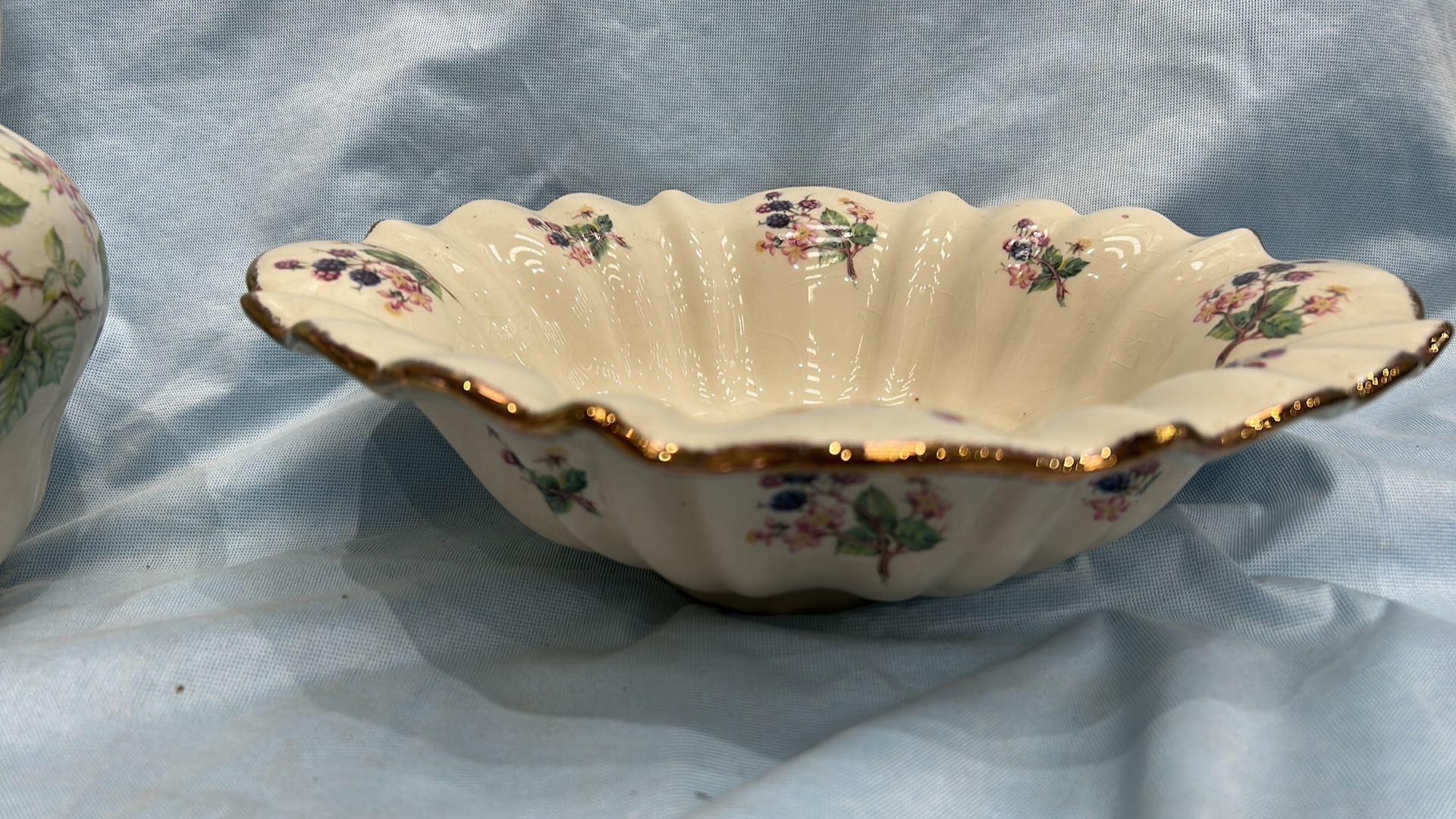 Pair of English Staffordshire ironstone wares comprising a baluster jug and scalloped fluted bowl, cream ground with transfer-printed blackberry blossom sprays and gilt rim accents.