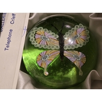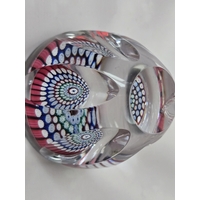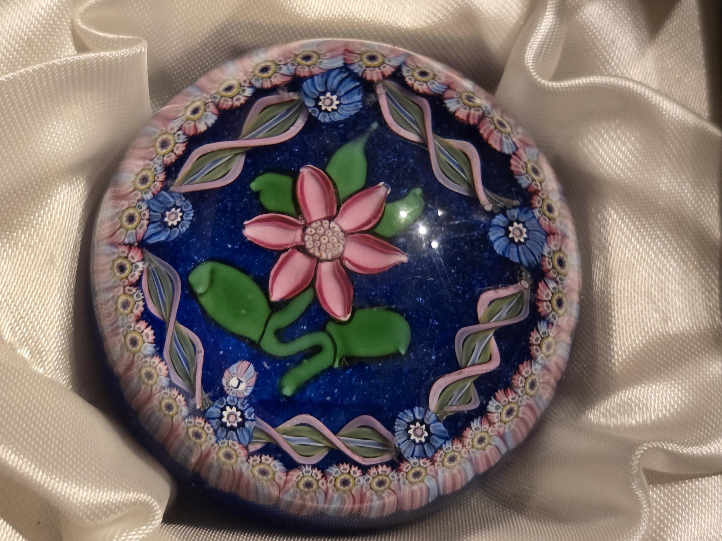 Jay Glass paperweight. Pink flower & Garlands on blue. By John Deacons & Allan Scott c1979 Very good condition. Box, no certificate. 56mm diam.