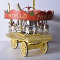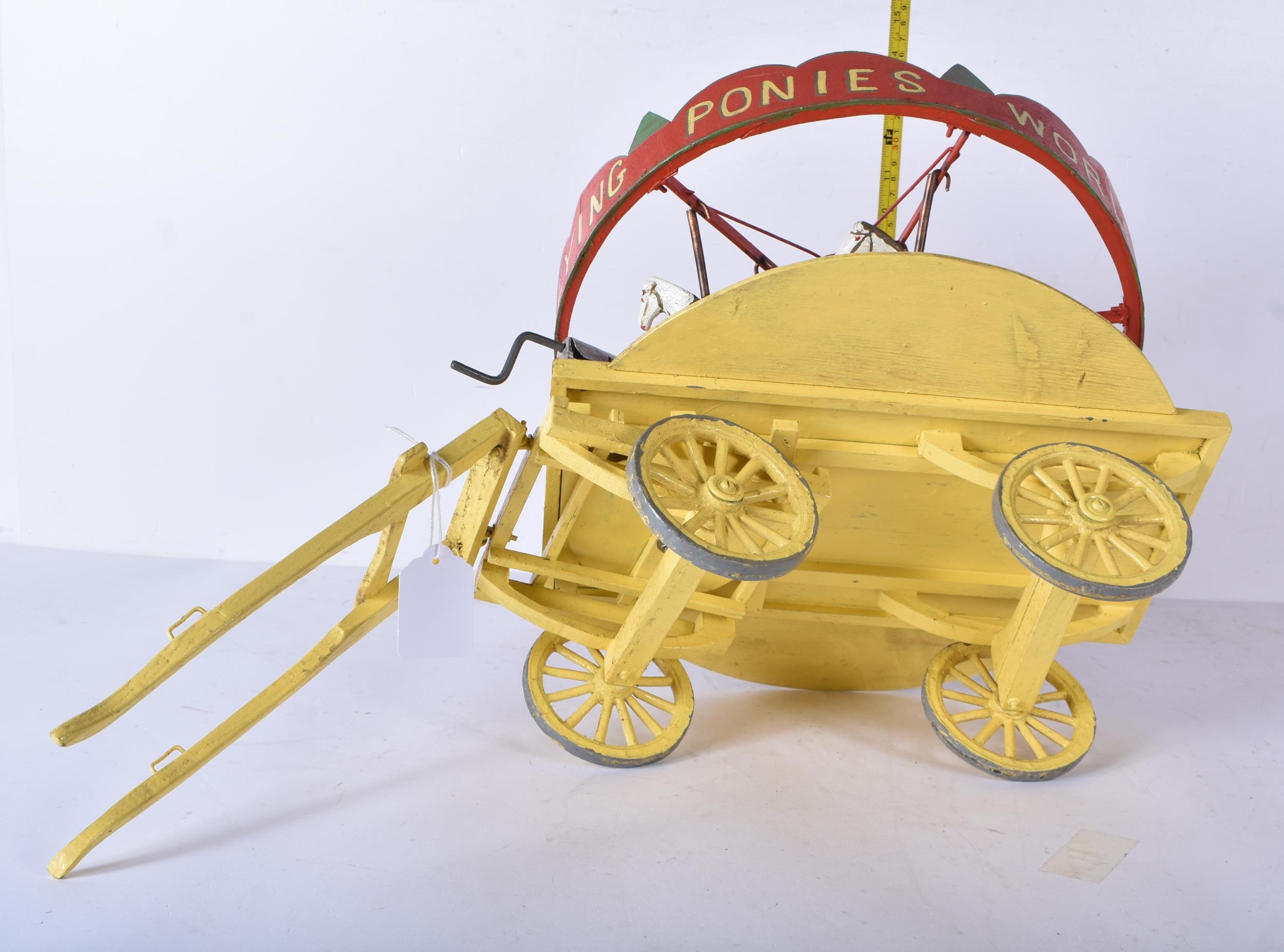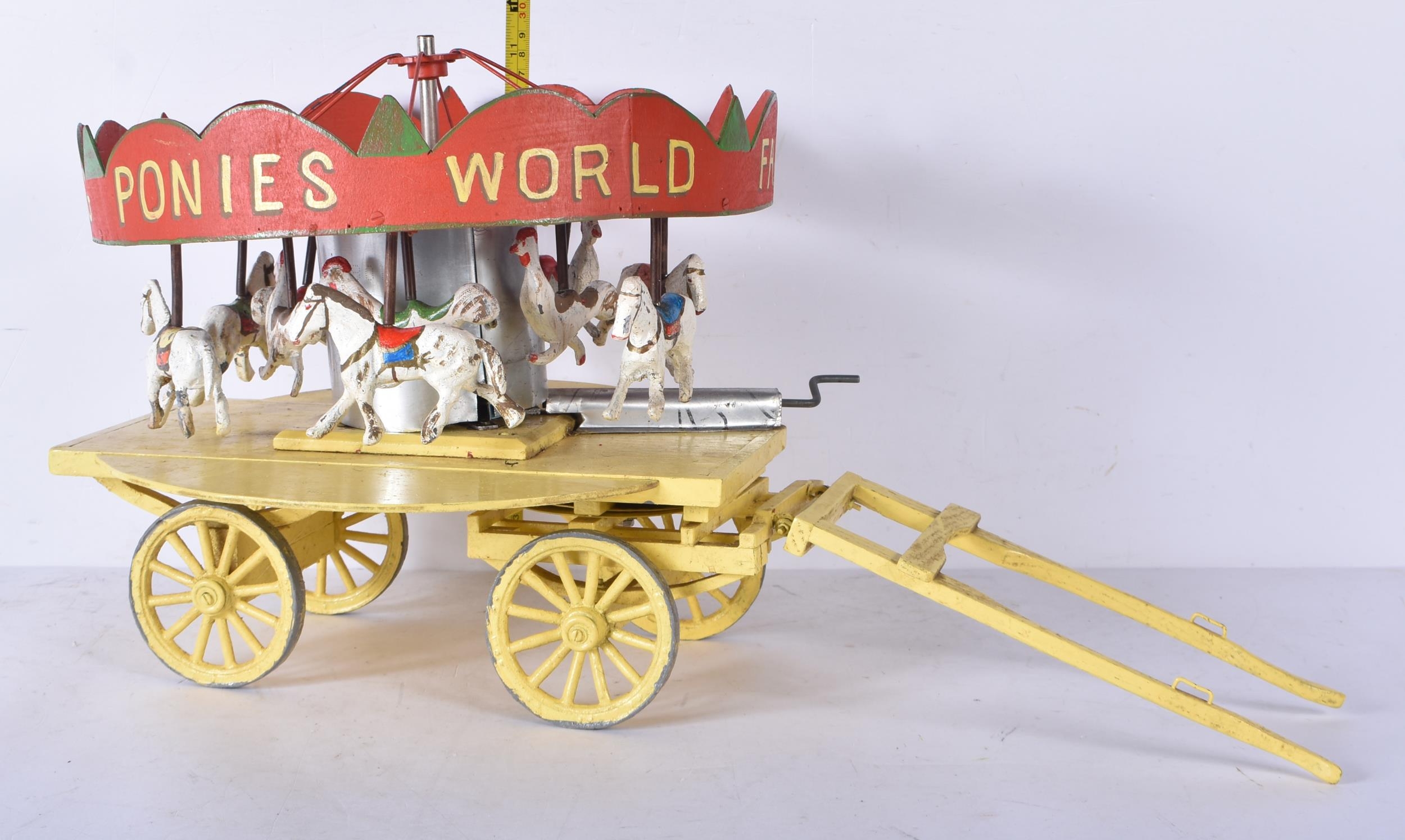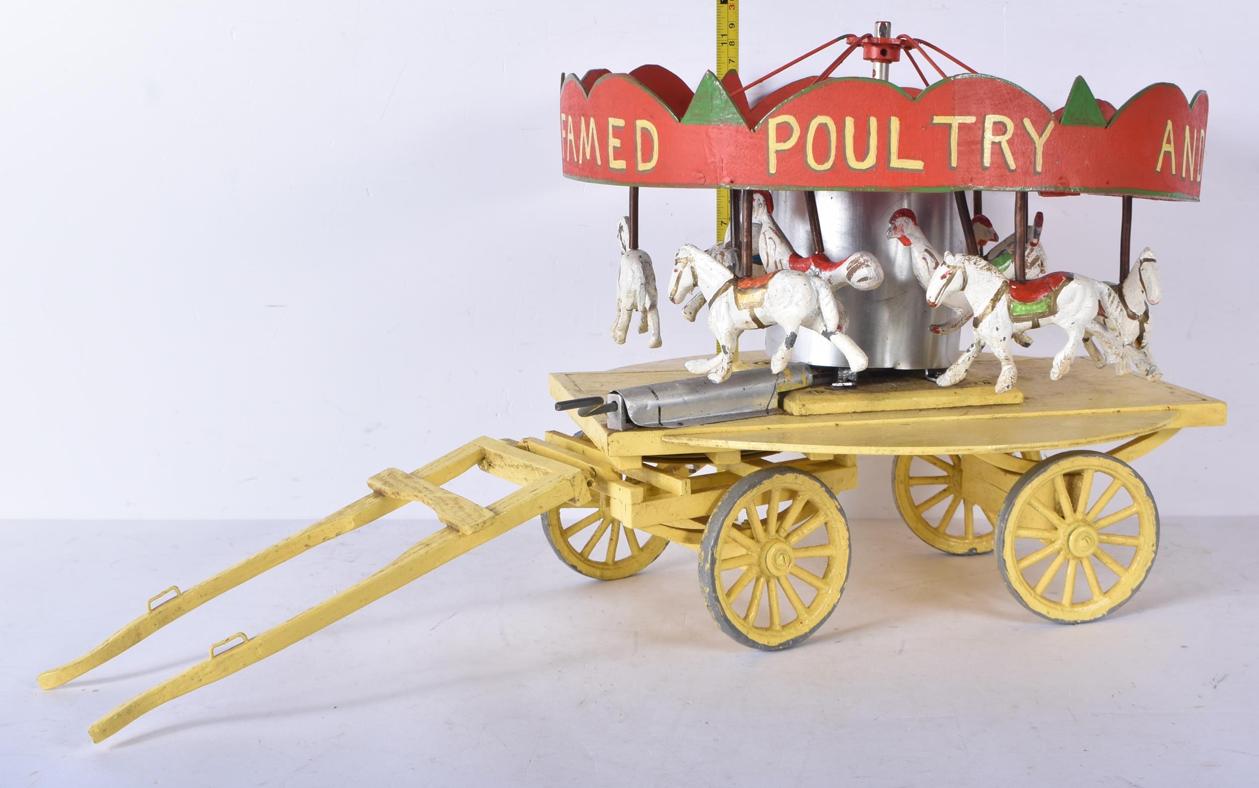 An early 20th Century folk art scratch built wooden and metal model carousel with painted lead and metal ponies and cockerels 28 x 57.5 x 30cm
