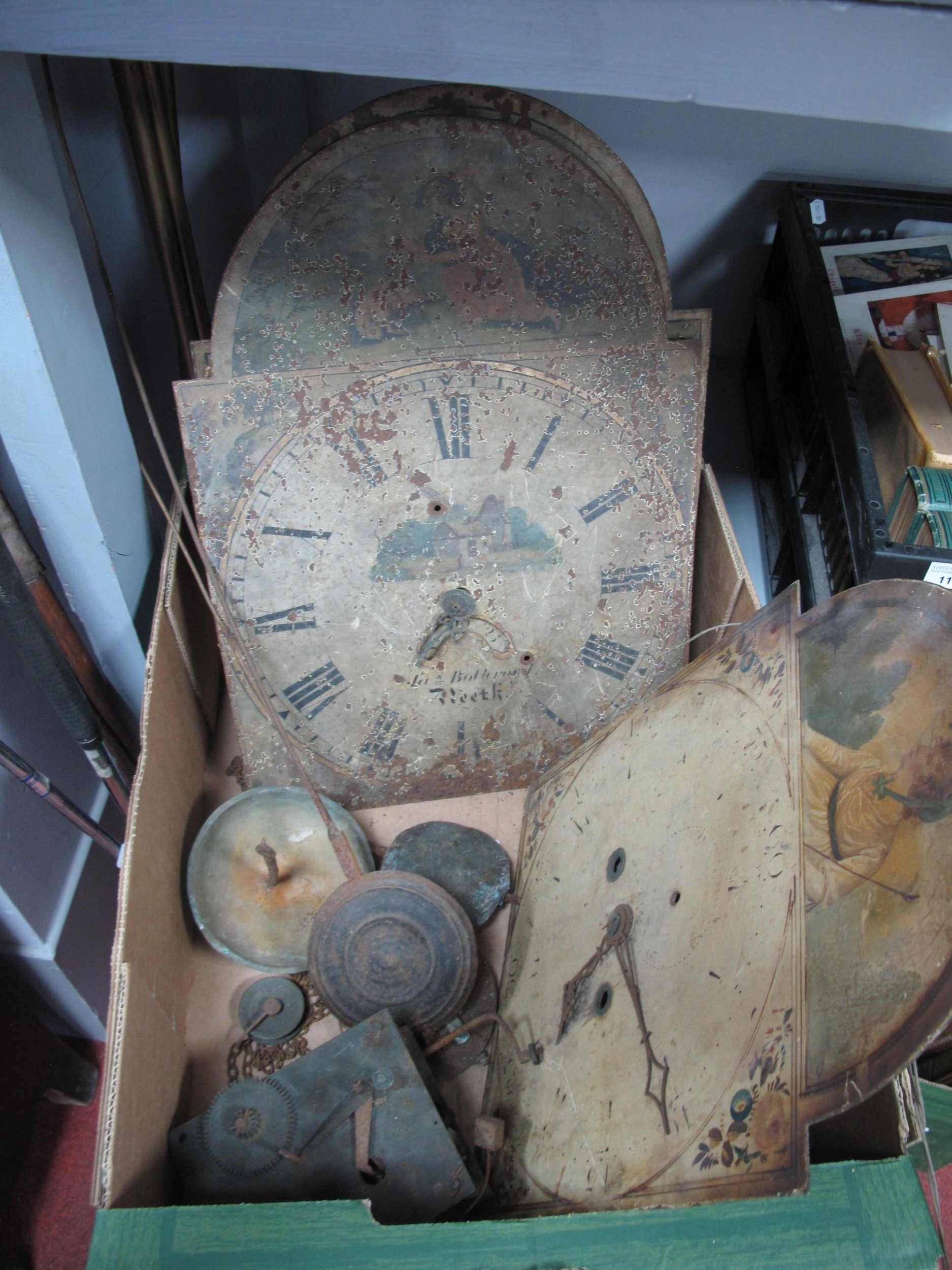 XIIX Century Longcase Movement (Damages) Pendulums, XX Century white dials, weight:- One Box.