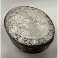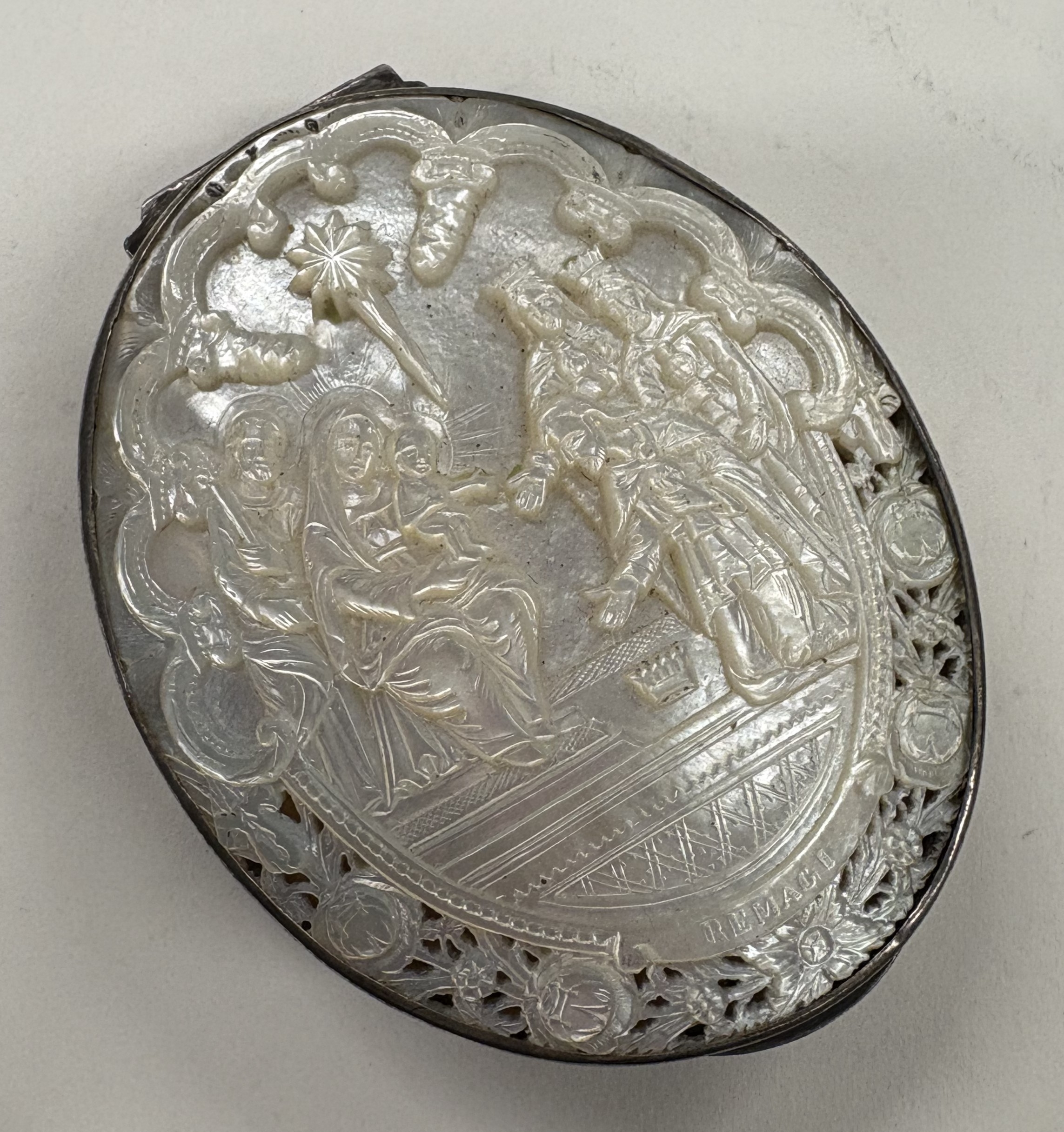 An early 19th Century Dutch silver snuff box with carved MOP decoration to cover. Approx. 179 grams. Est. £400 - £600.