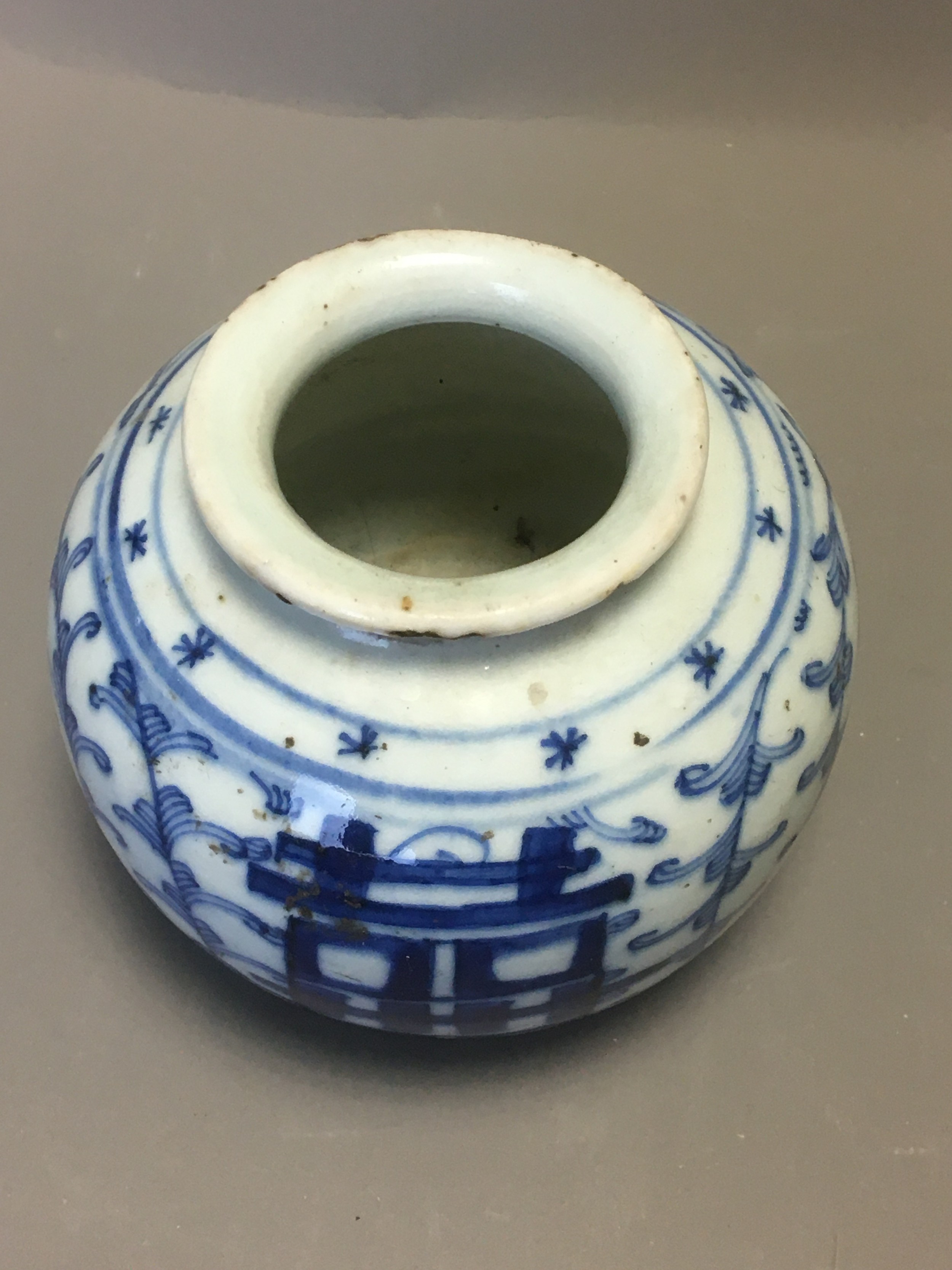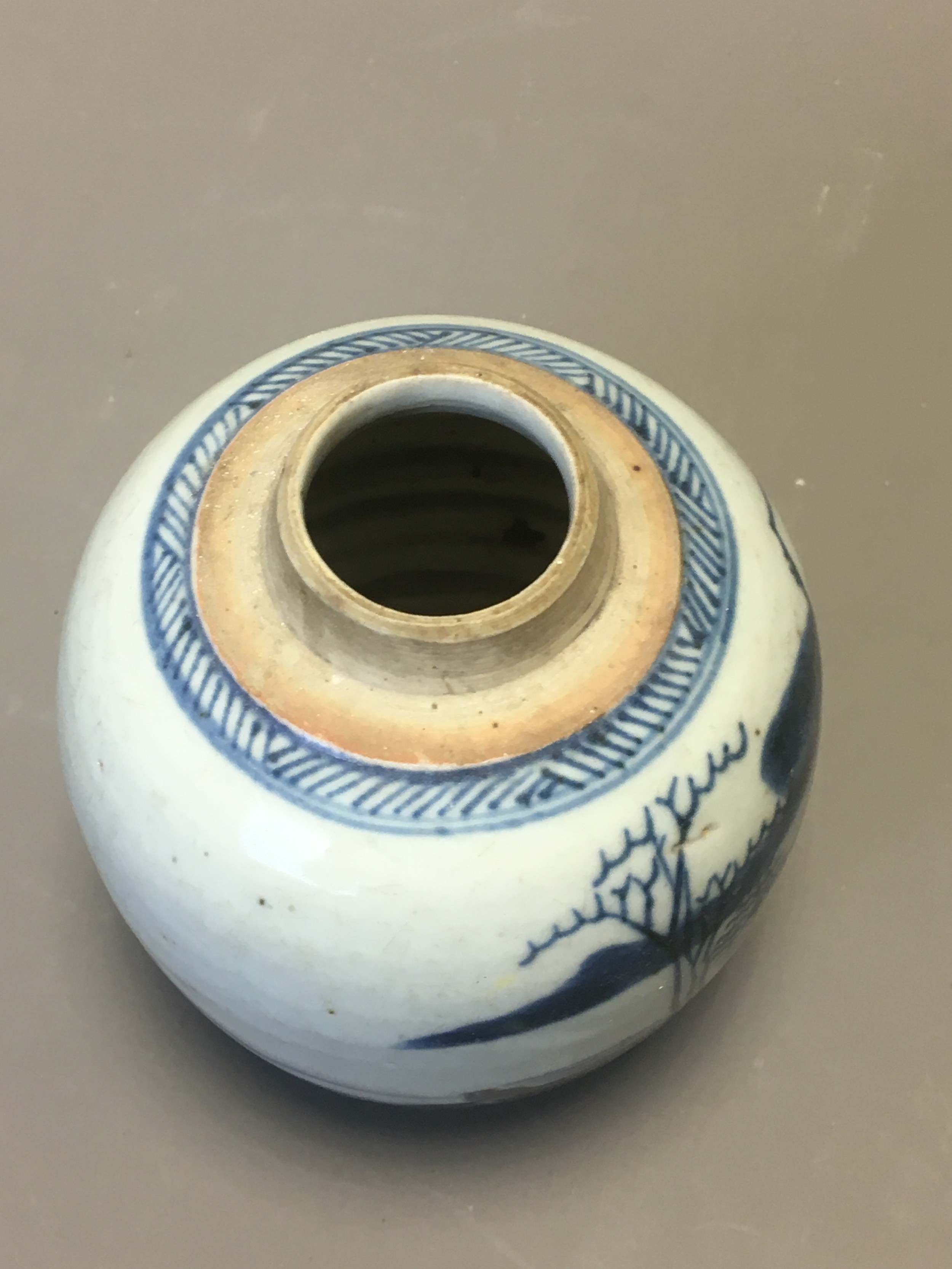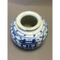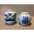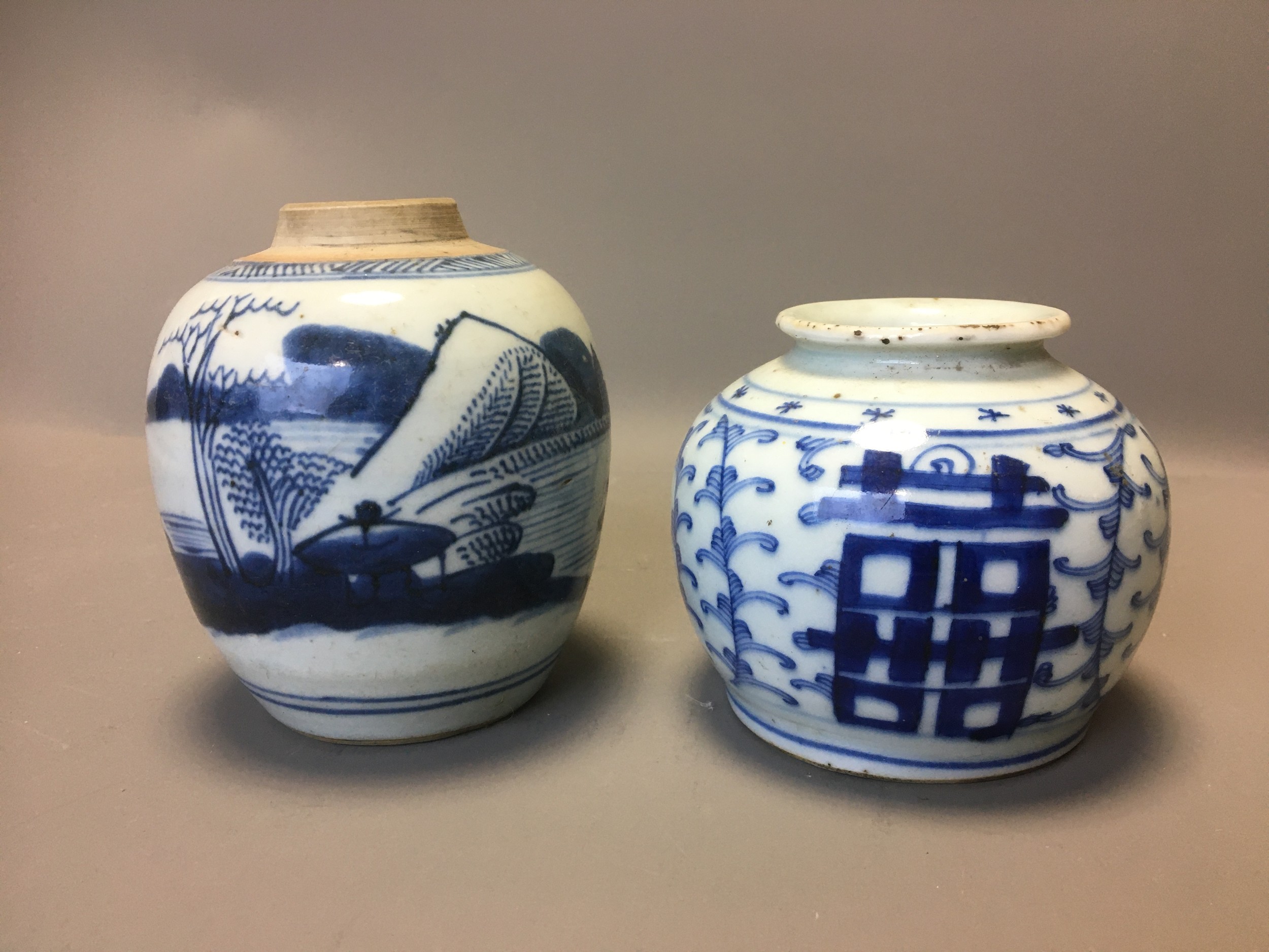 Chinese Jars x 2 both with Blue and White decoration one with Auspicious Symbols Early 20th Century the other an earlier Qing Dynasty Example with Landscape and River Detail.