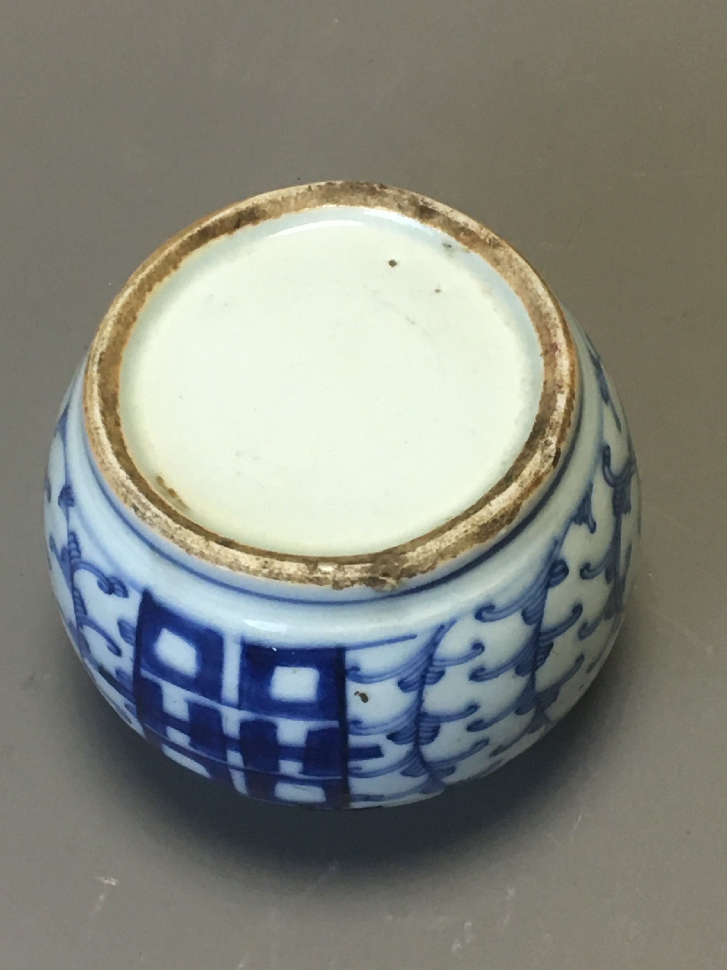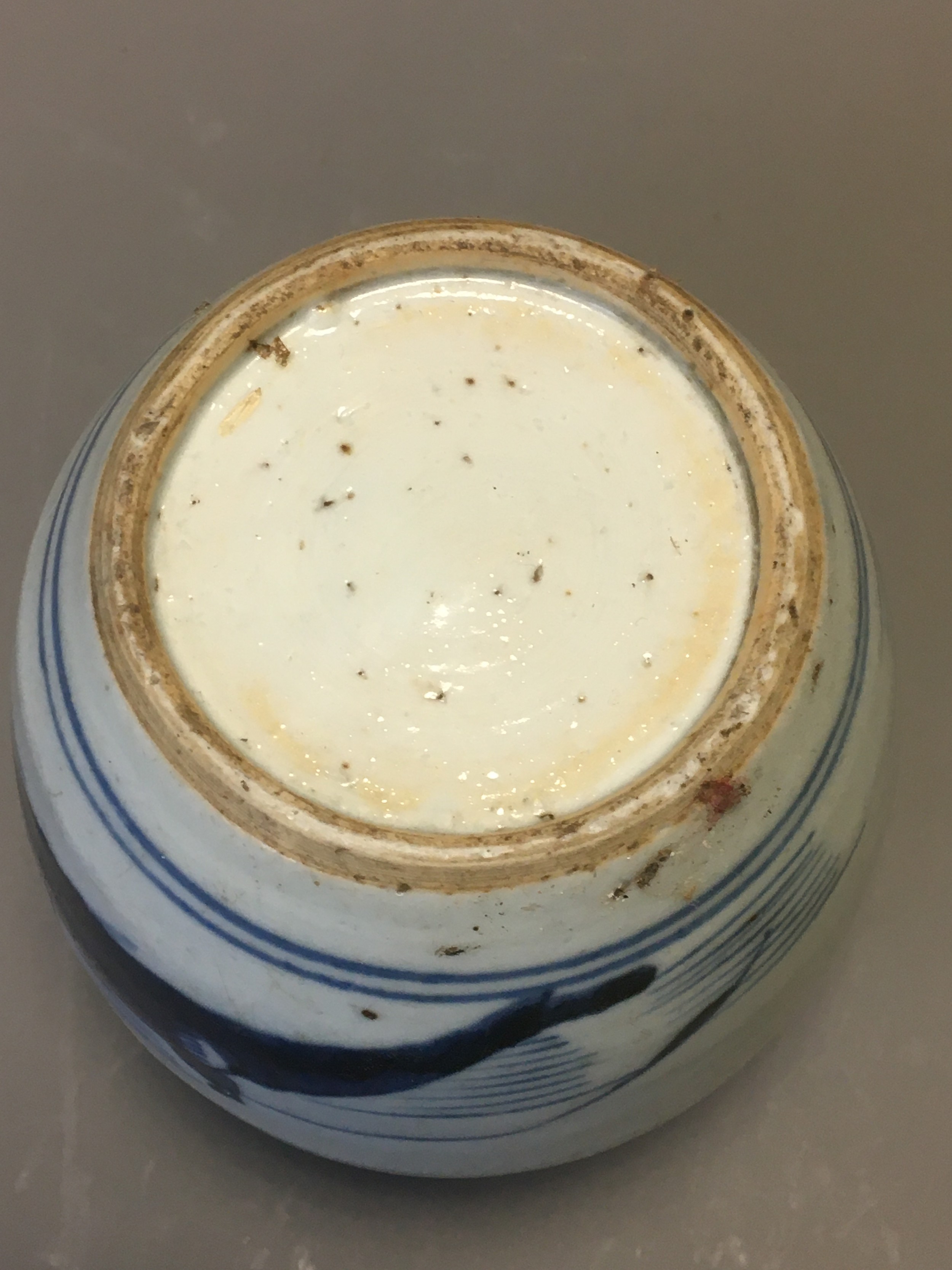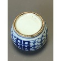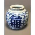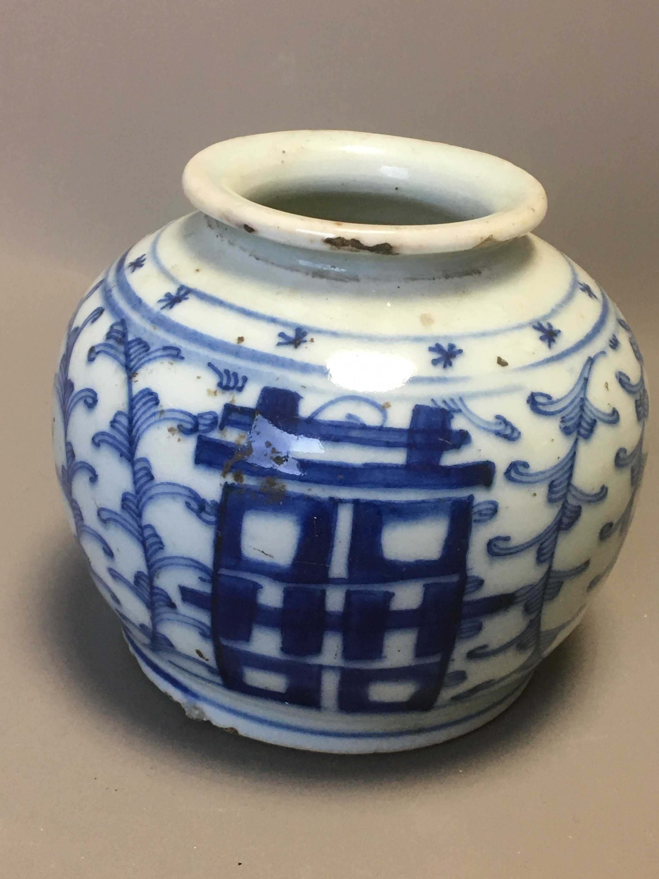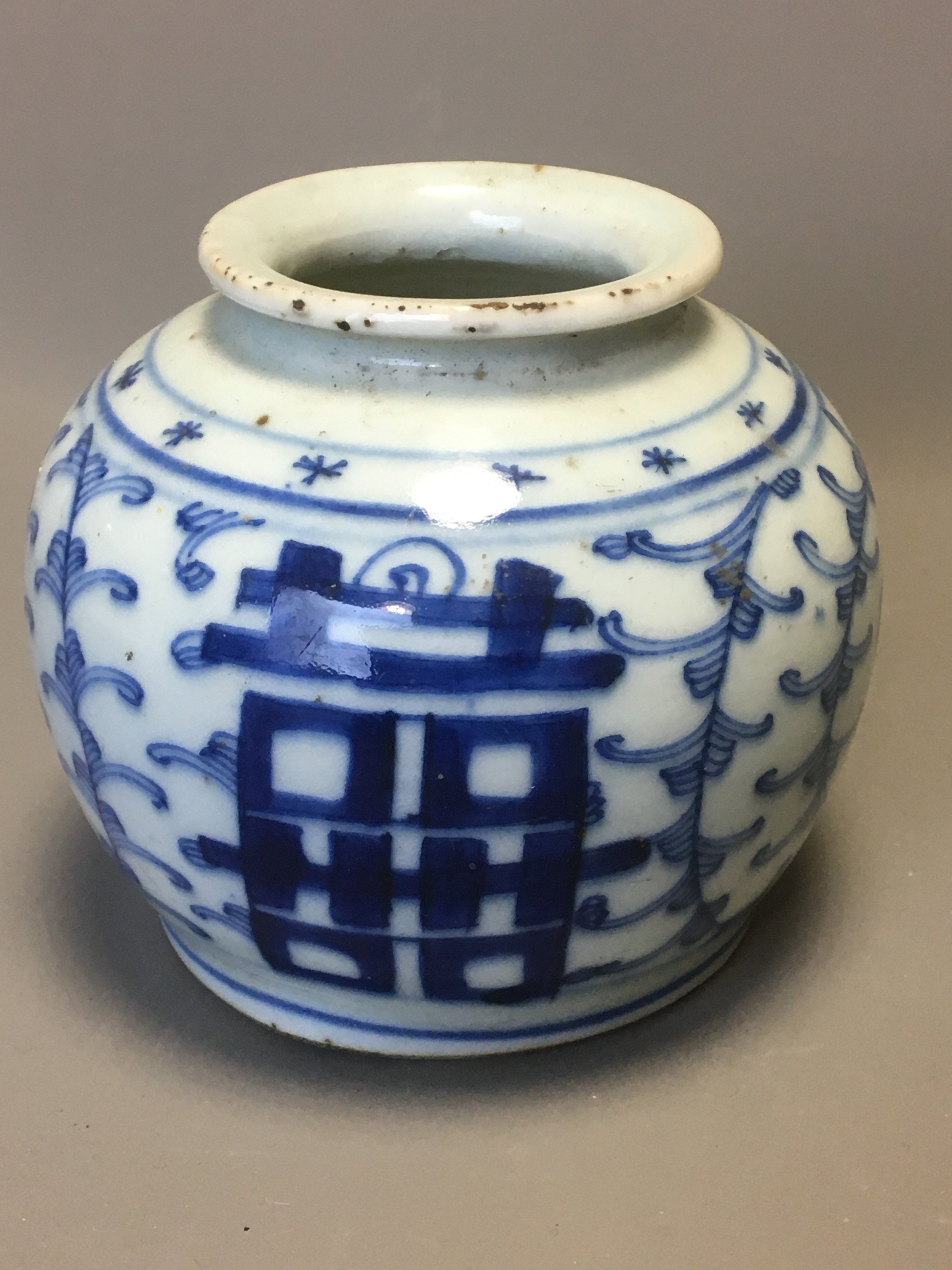 Chinese Jars x 2 both with Blue and White decoration one with Auspicious Symbols Early 20th Century the other an earlier Qing Dynasty Example with Landscape and River Detail.