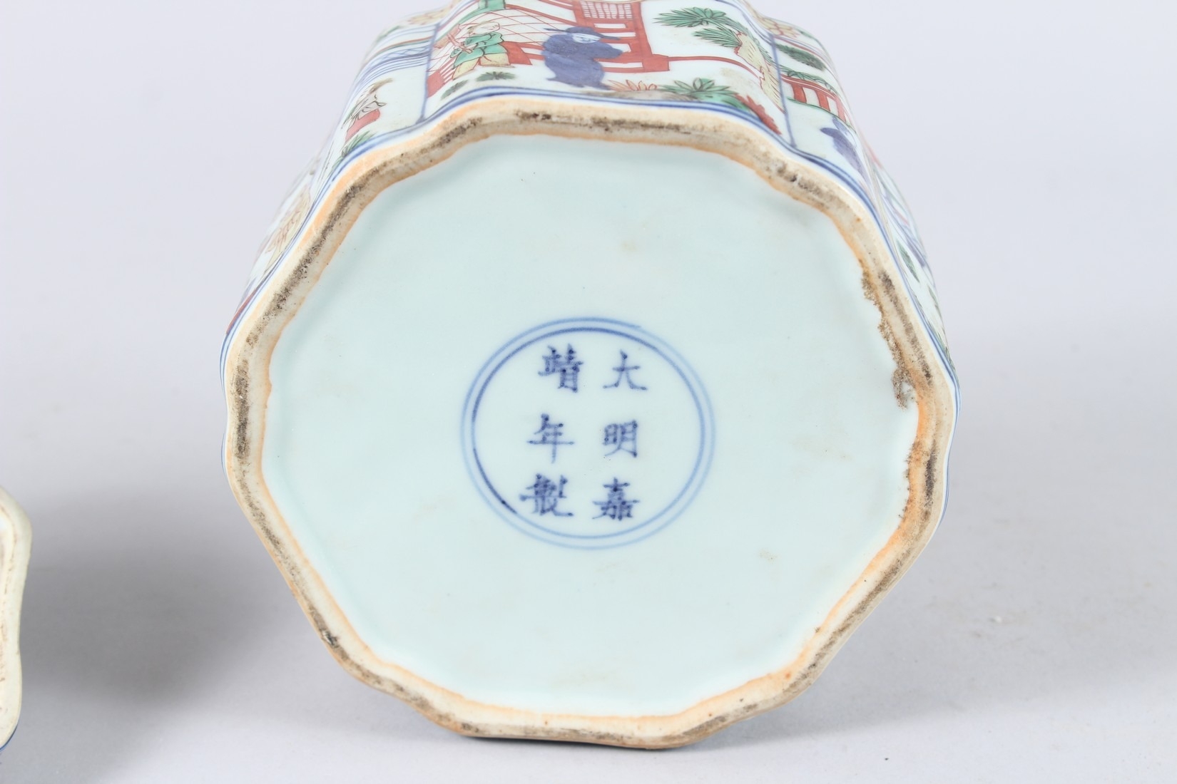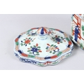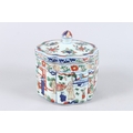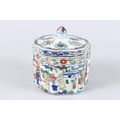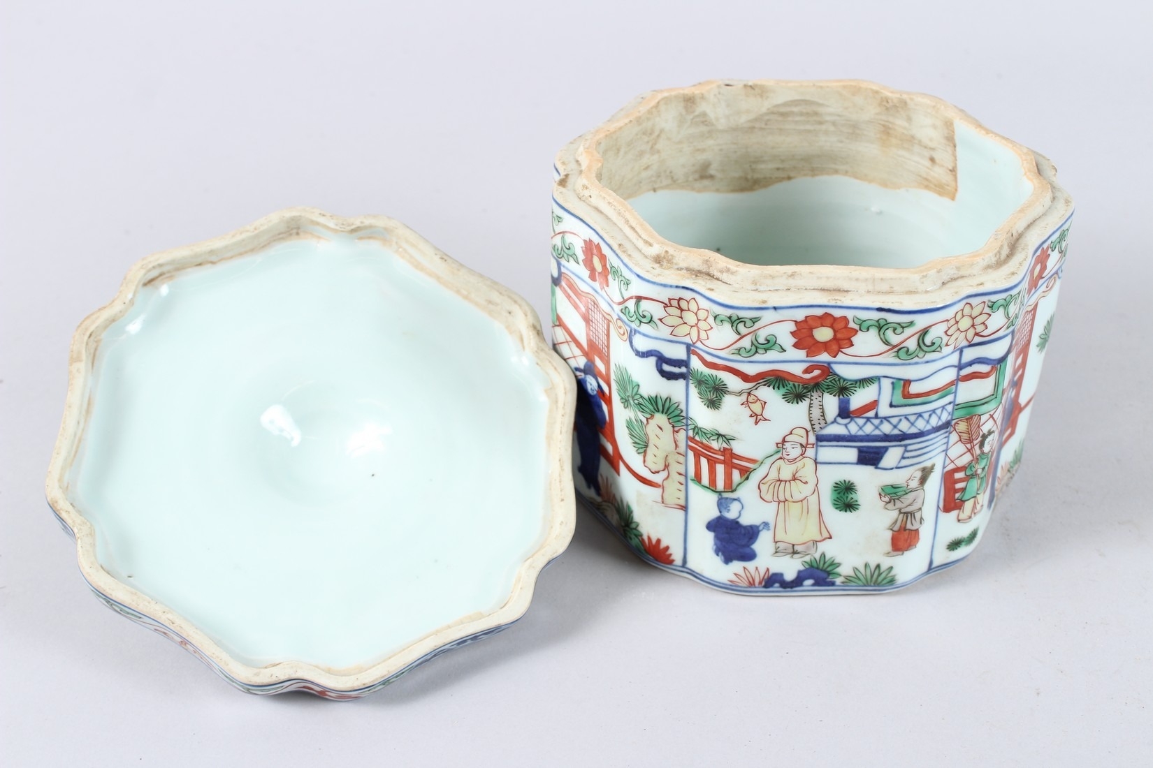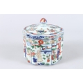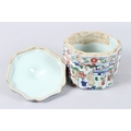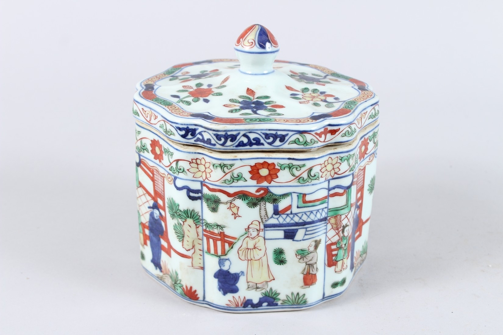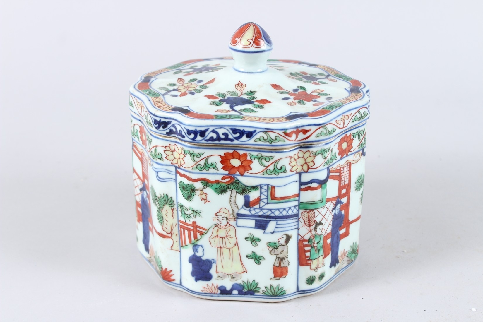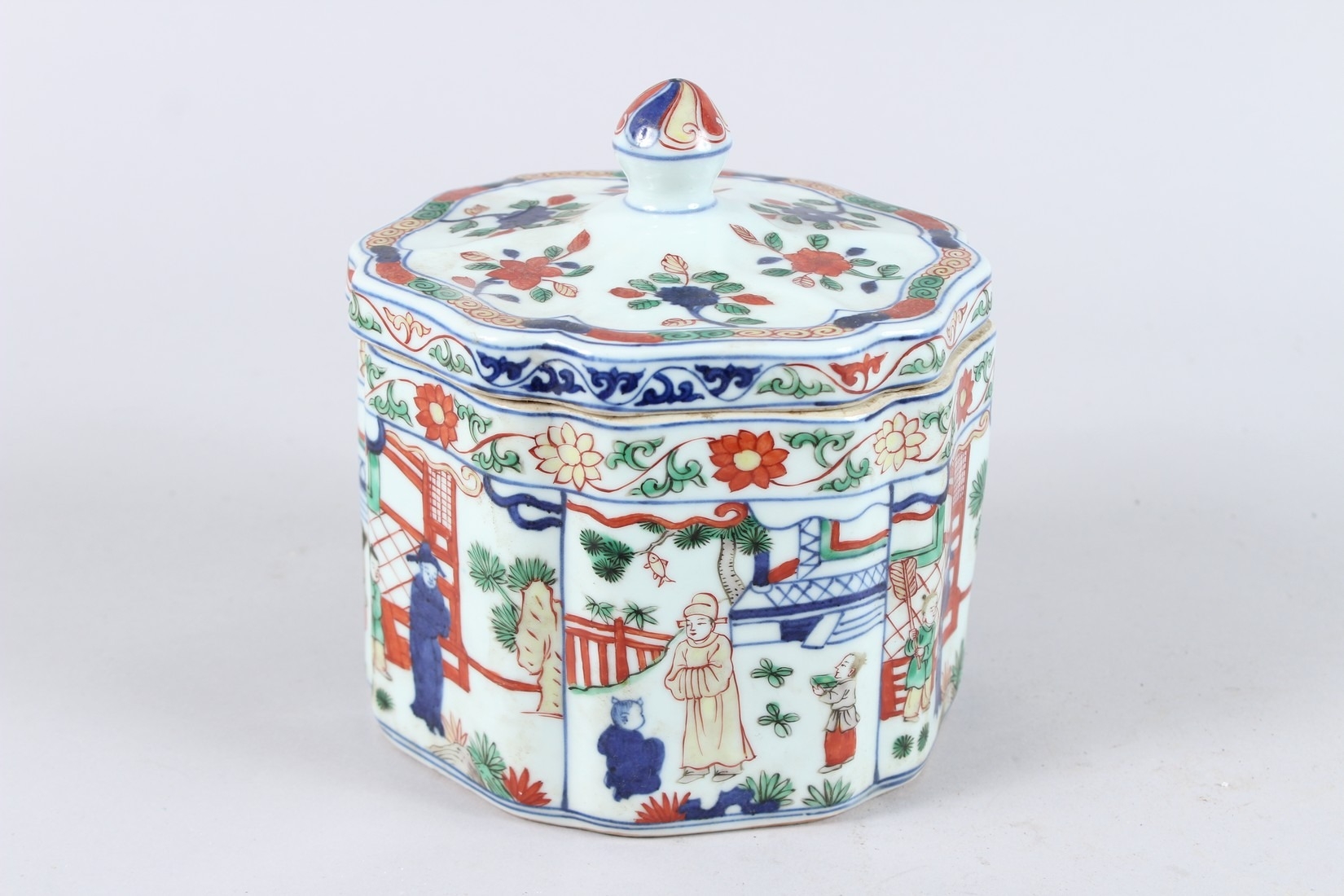 A CHINESE FAMILLE VERTE PORCELAIN BOX AND COVER, the cover painted with flowers, the body with panels of figures and buildings, a six character mark to the base.