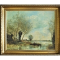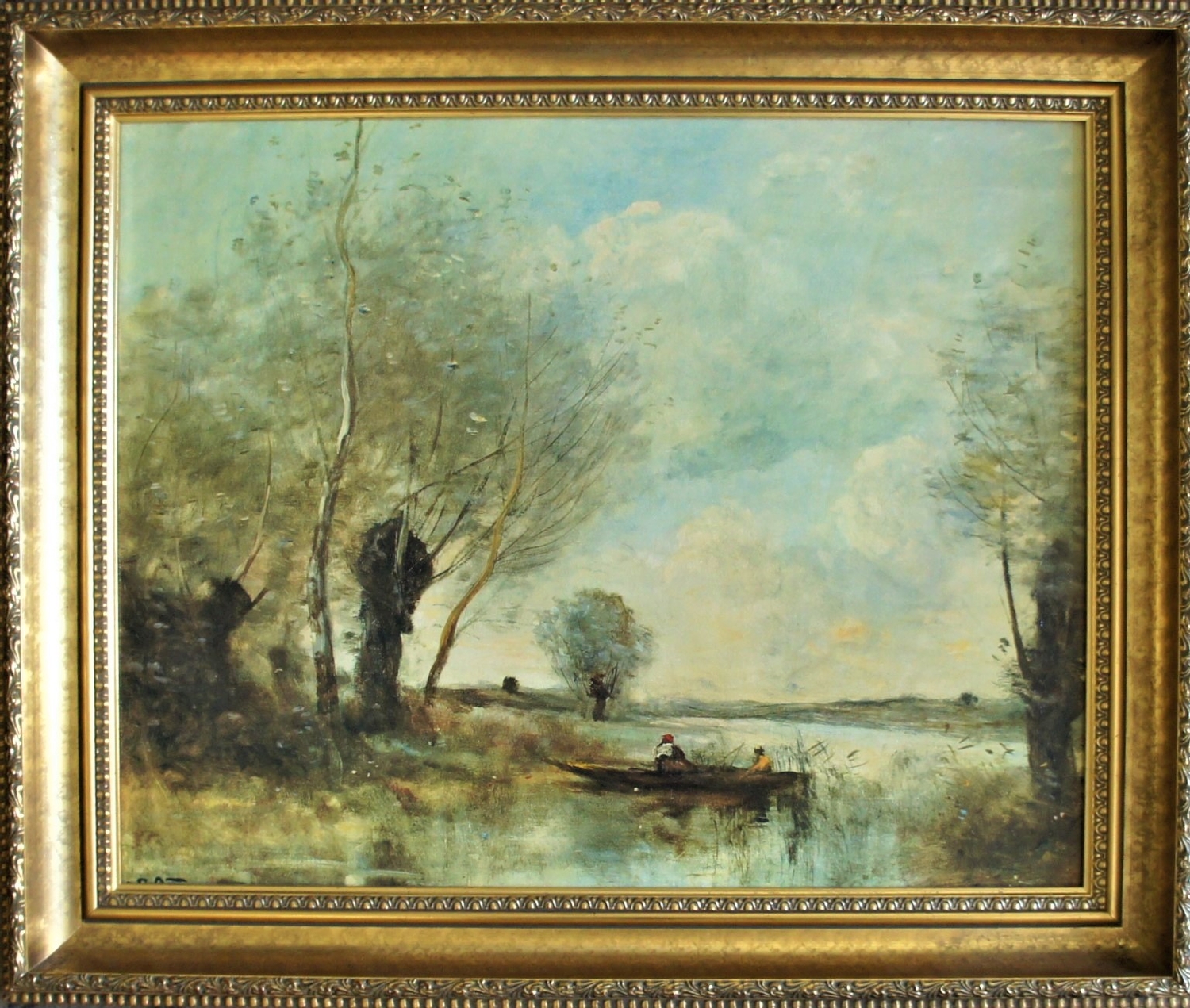 A framed canvas print after J.B.C. Corot, A boat with fishermen near the willow tree, 49 x 38 cm.