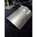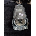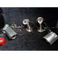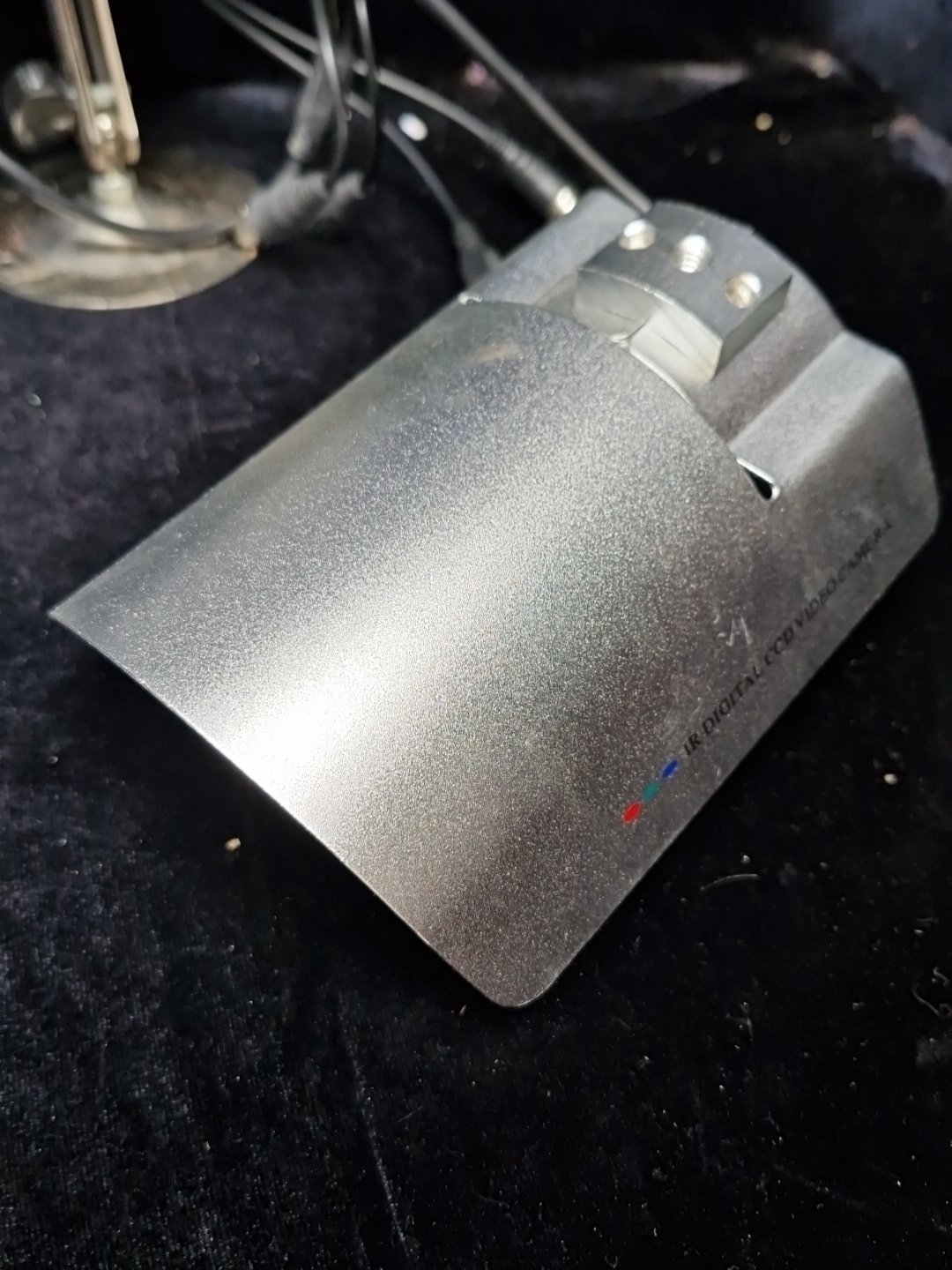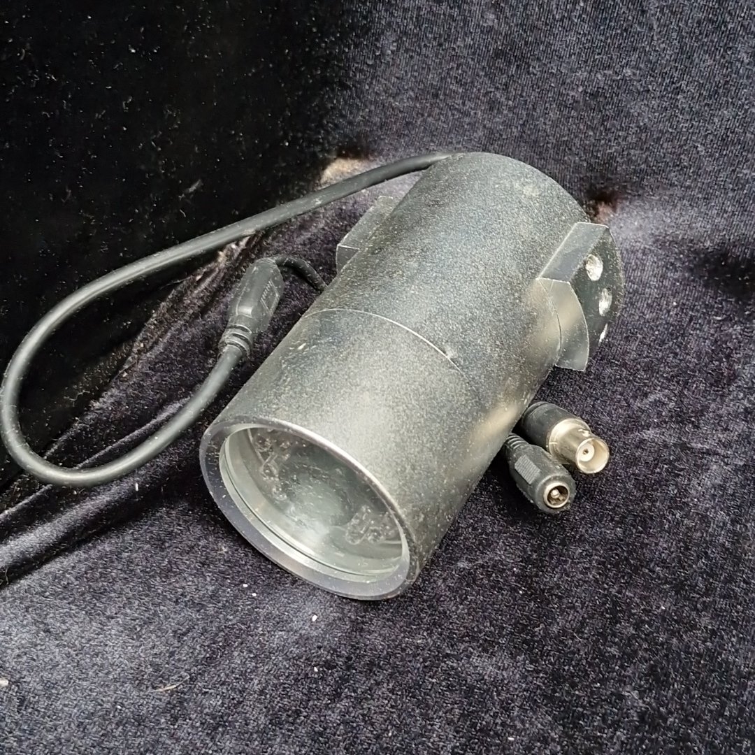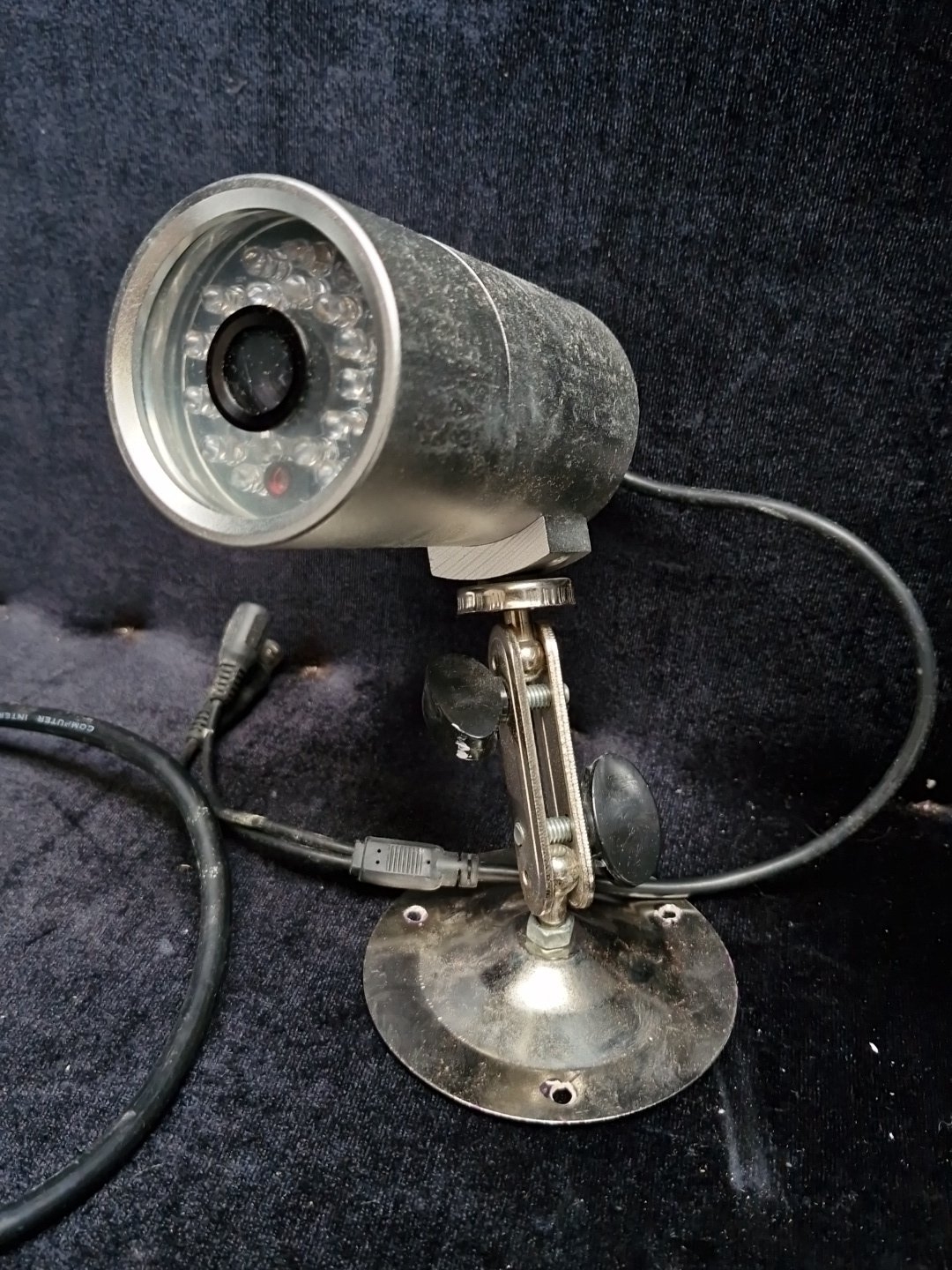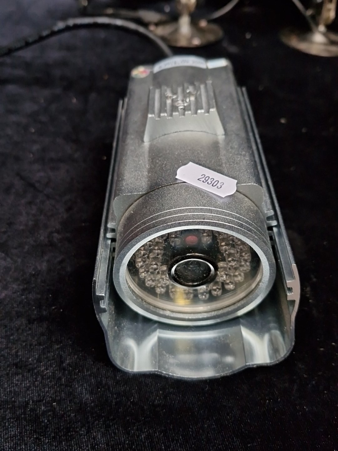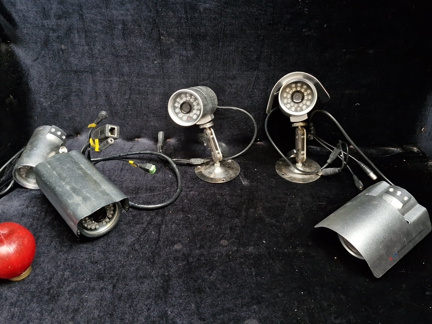 A group of outdoors or indoors CCTV security cameras with infrared LED night-vision rings, comprising cylindrical and bullet-style housings with mounting brackets and attached video/power leads.