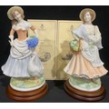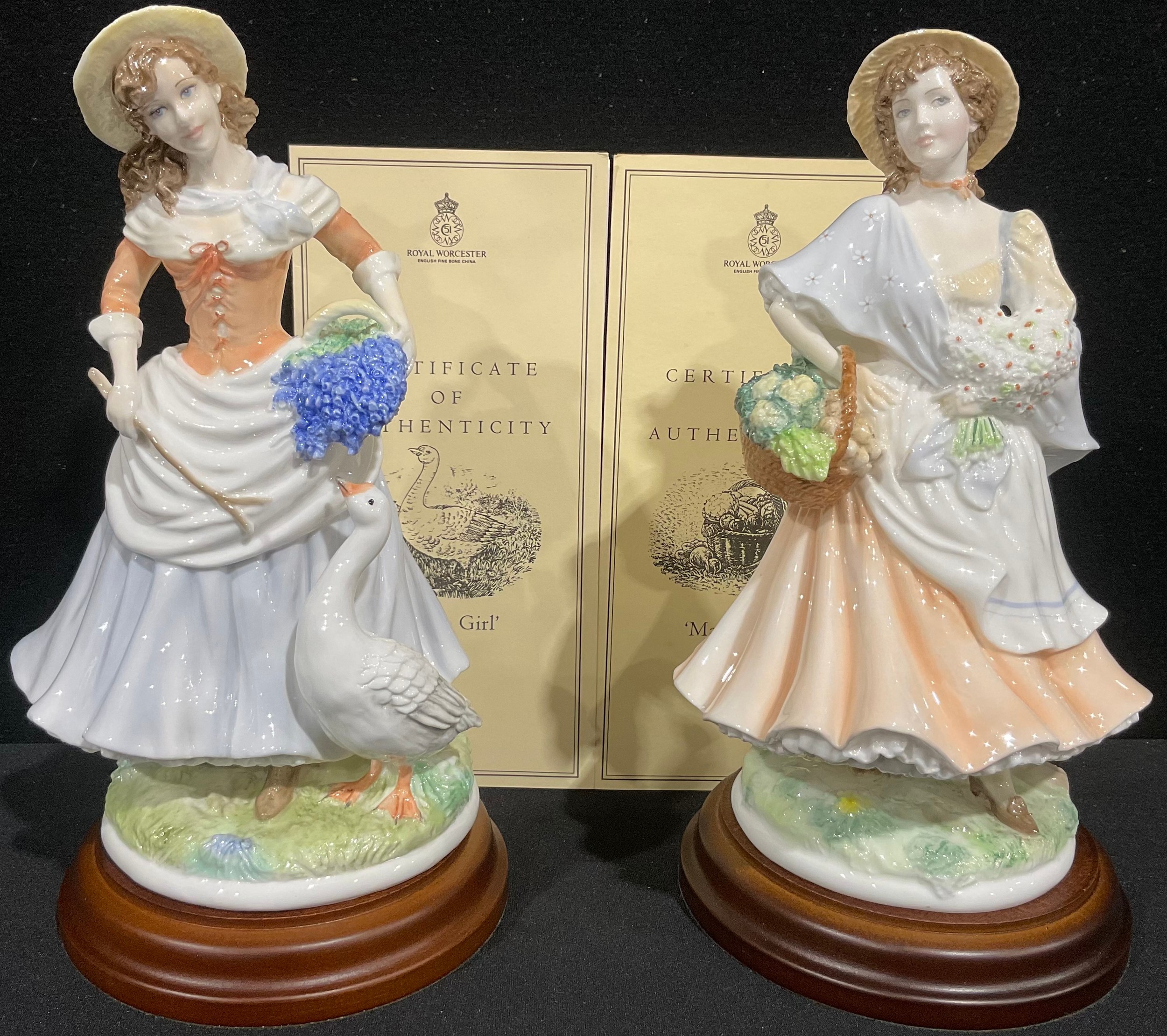 A pair of Royal Worcester figures for Compton & Woodhouse, Pastoral Collection, comprising Market Day, sculpted by Maureen Halson, limited edition 574/5,000, 24cm overall, wooden plinth, certificate and Goose Girl, limited edition 574/5,000, wooden plinth, 24cm overall, certificate