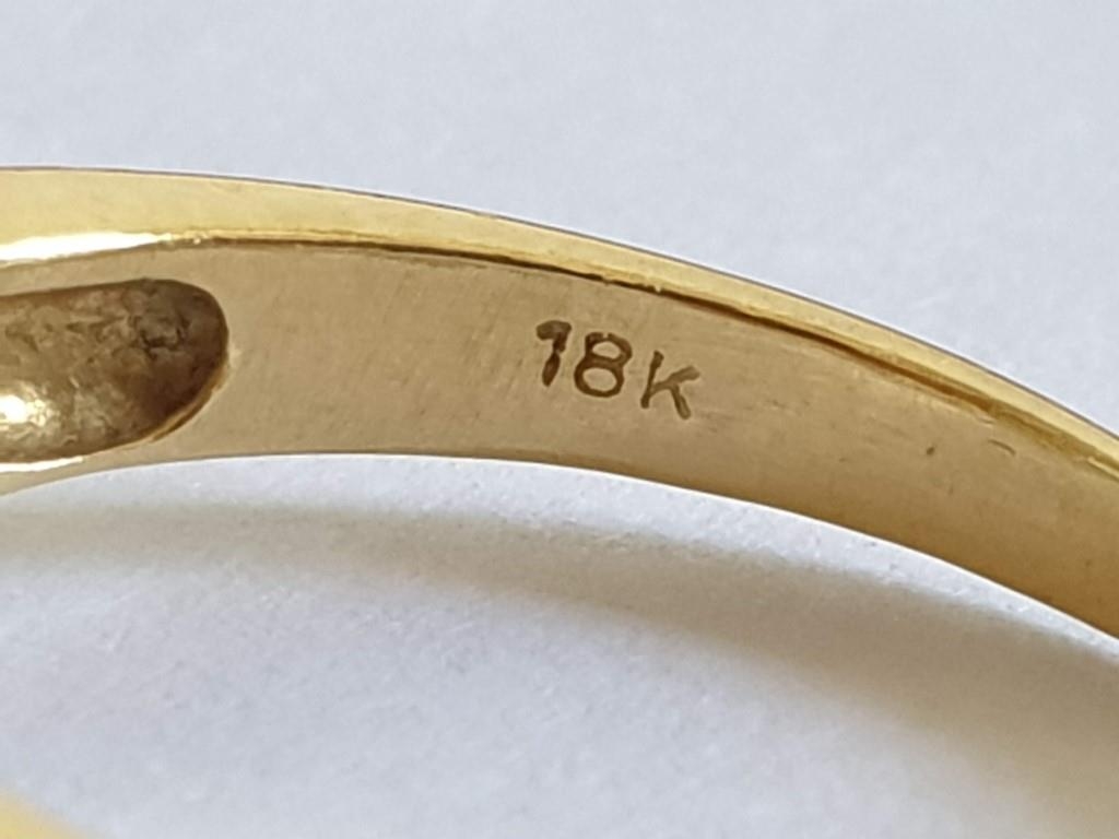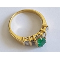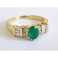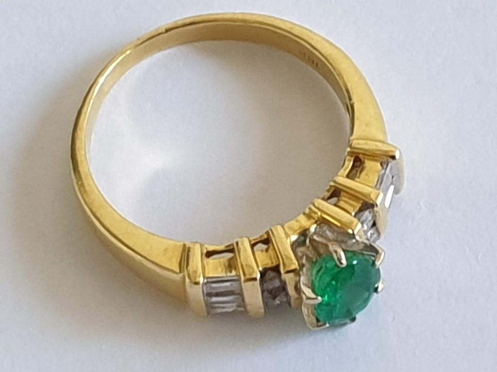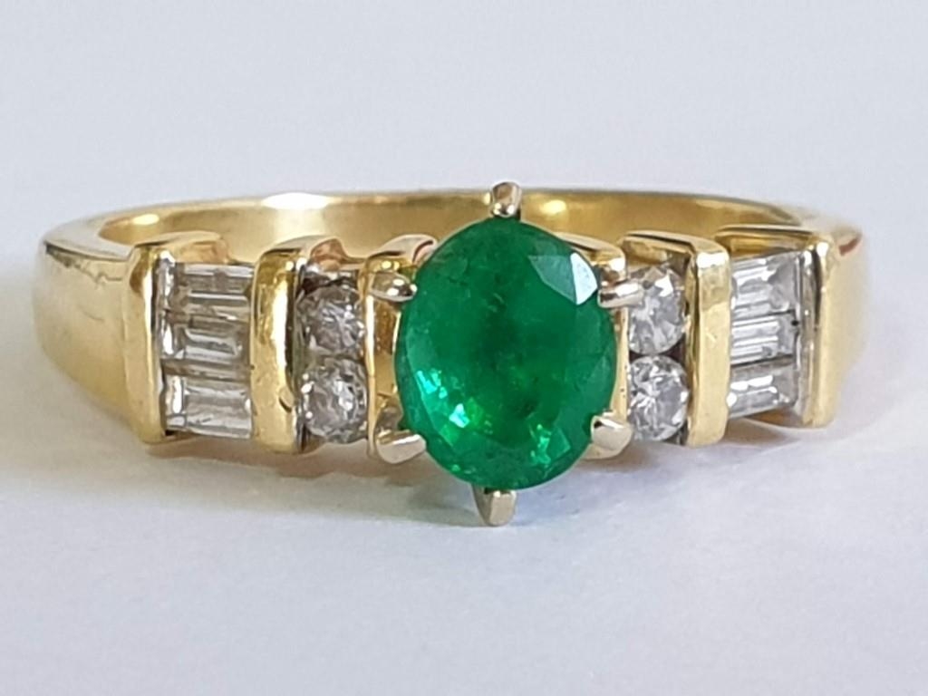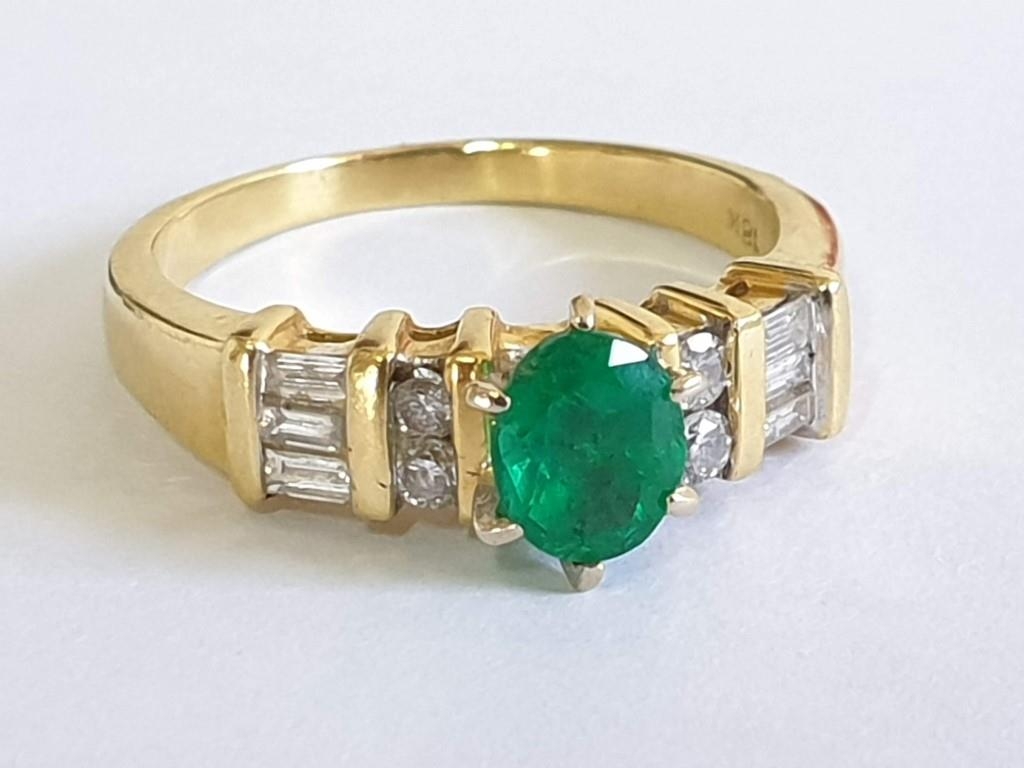 18ct Gold Emerald & Diamond Ring, Oval Cut Center Green Stone Offset by 4 x Round and 6 x Baguette Cut Diamonds, Approx 5.3g, Size O