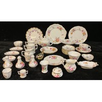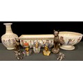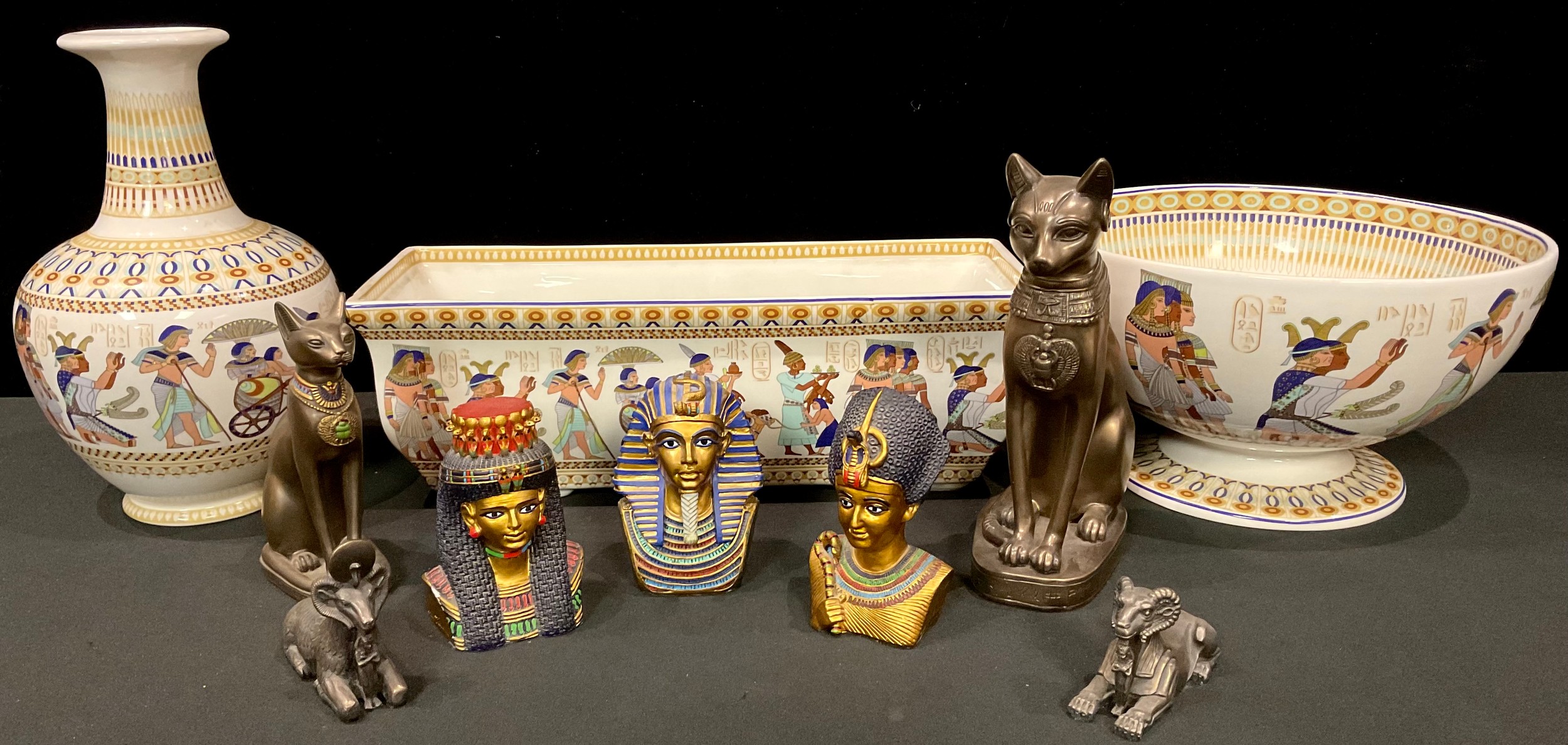 A pedestal bowl, transfer printed with ancient Egyptian figures and hieroglyphics, 26cm diam; a similar bottle vase, 24cm, and trough; two resin Egyptian cats; three miniature busts, Tutankhamun etc (10)