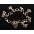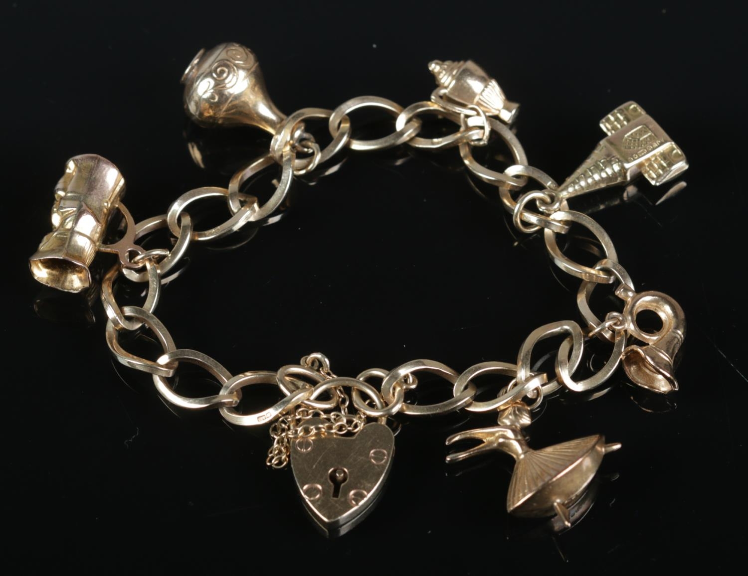 A 9ct gold charm bracelet with six 9ct gold charms and heart shaped clasp. 19.21g.