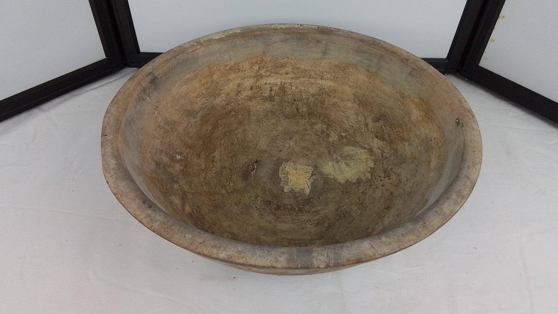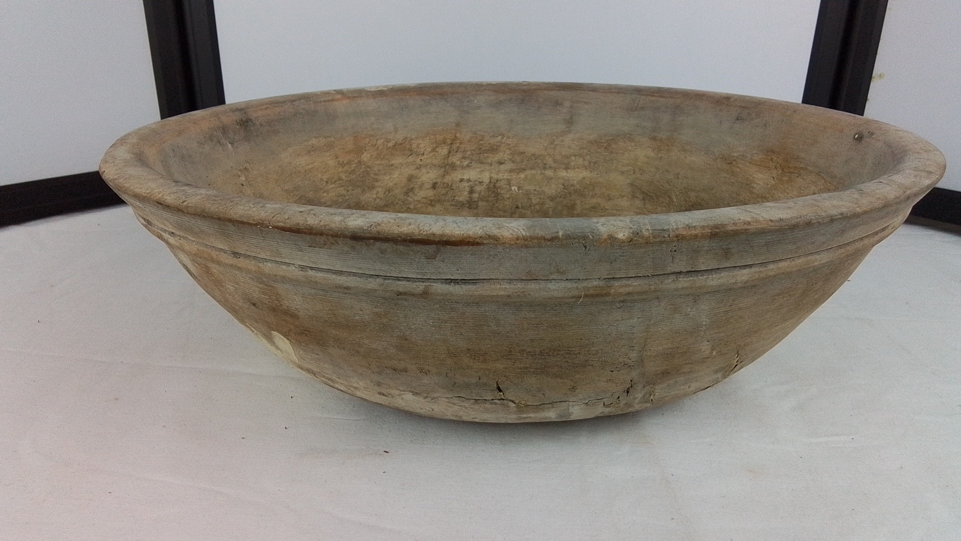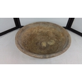 An Irish hand-carved wooden dough bowl or trough, of elliptical form with thick rim and deep interior, showing adze and wear marks; likely a rustic kitchen or dairy vessel, 11cm x 42cm x 42cm.