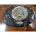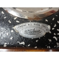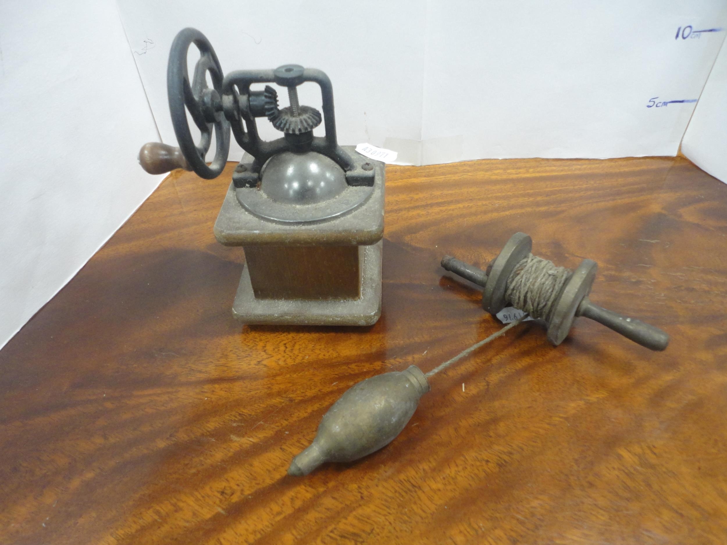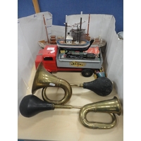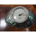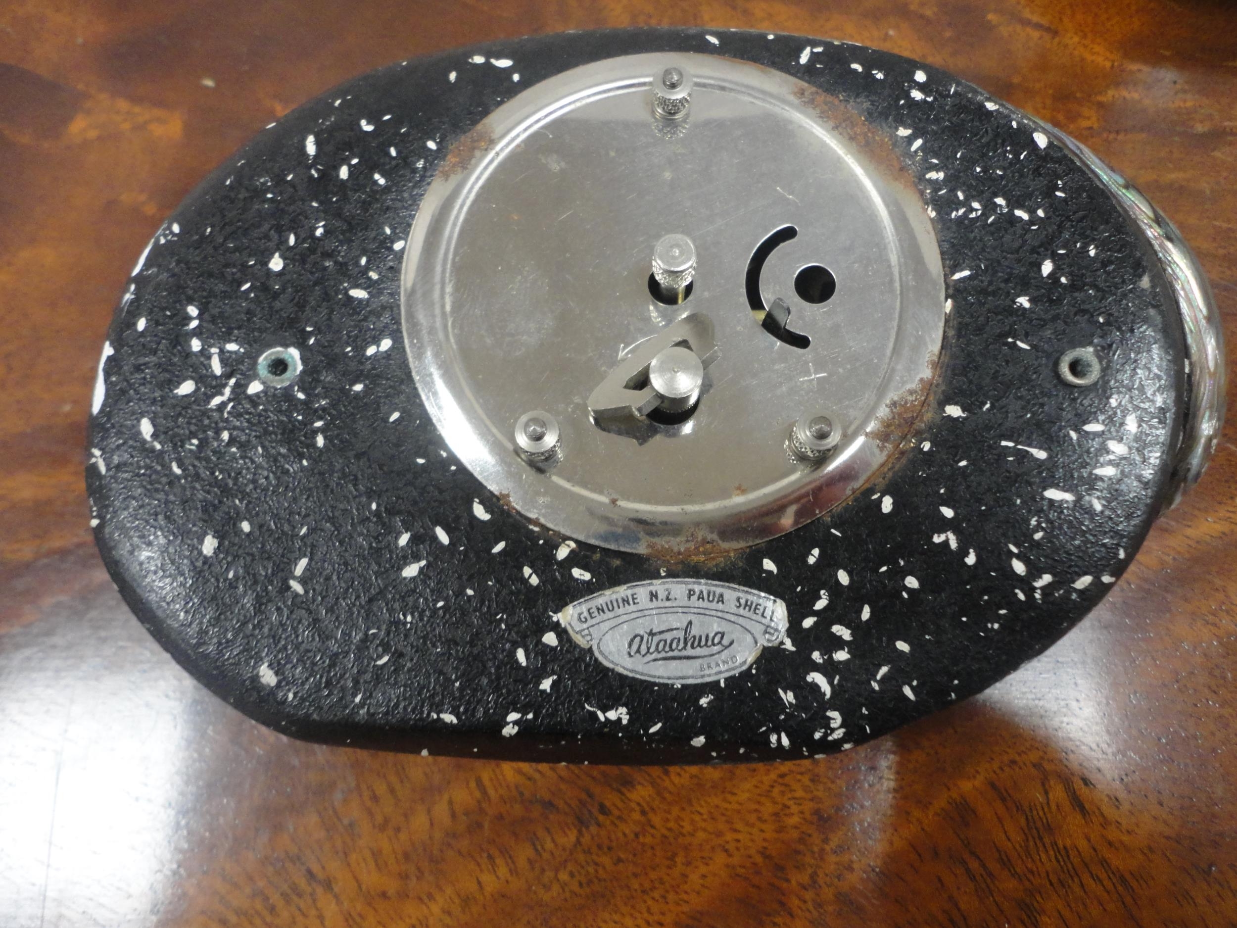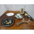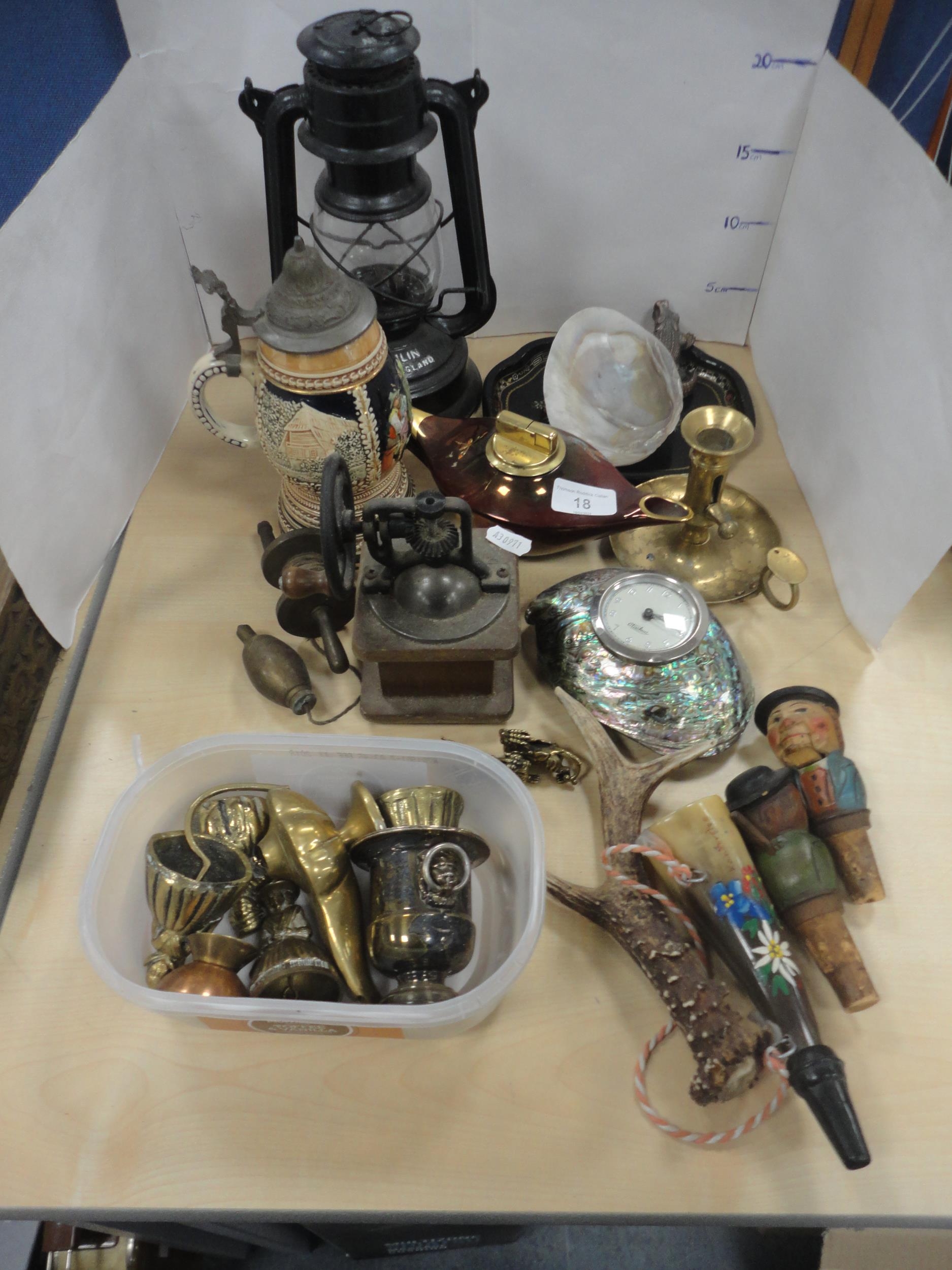 Paraffin hurricane lamp, brass taperstick, German Black Forest-style bottle stoppers, abalone-style shell clock etc.