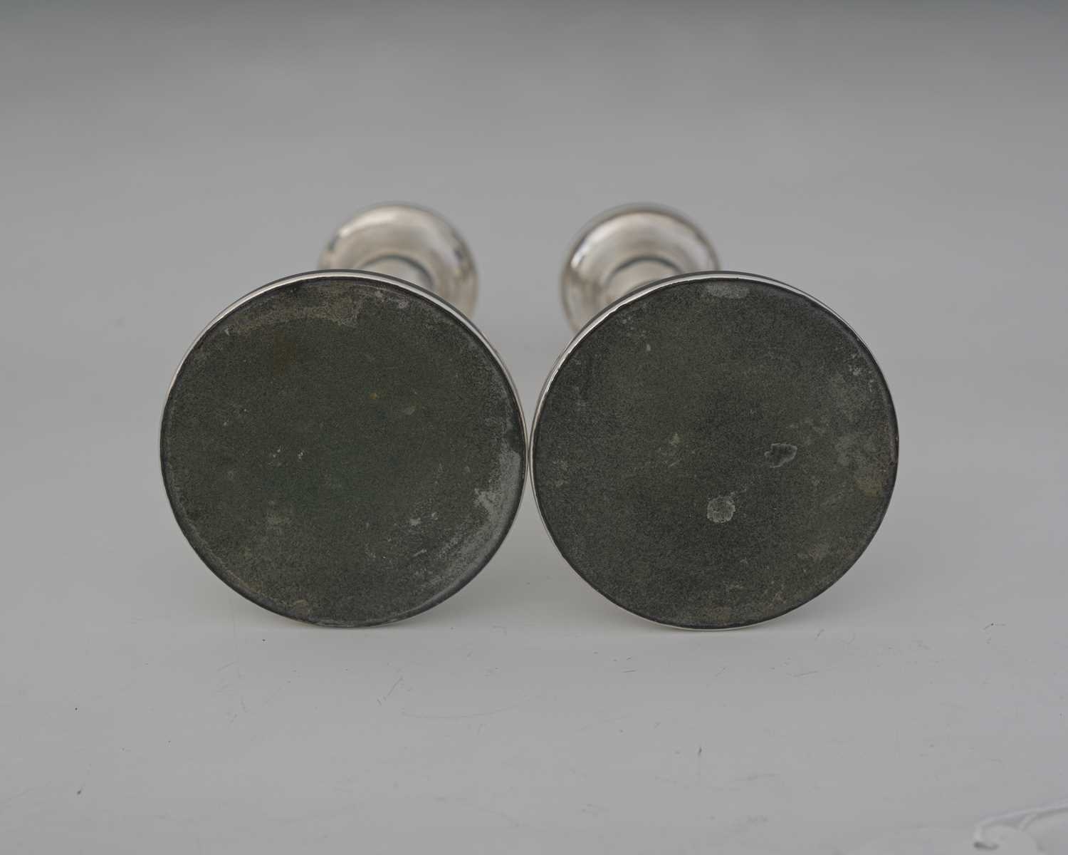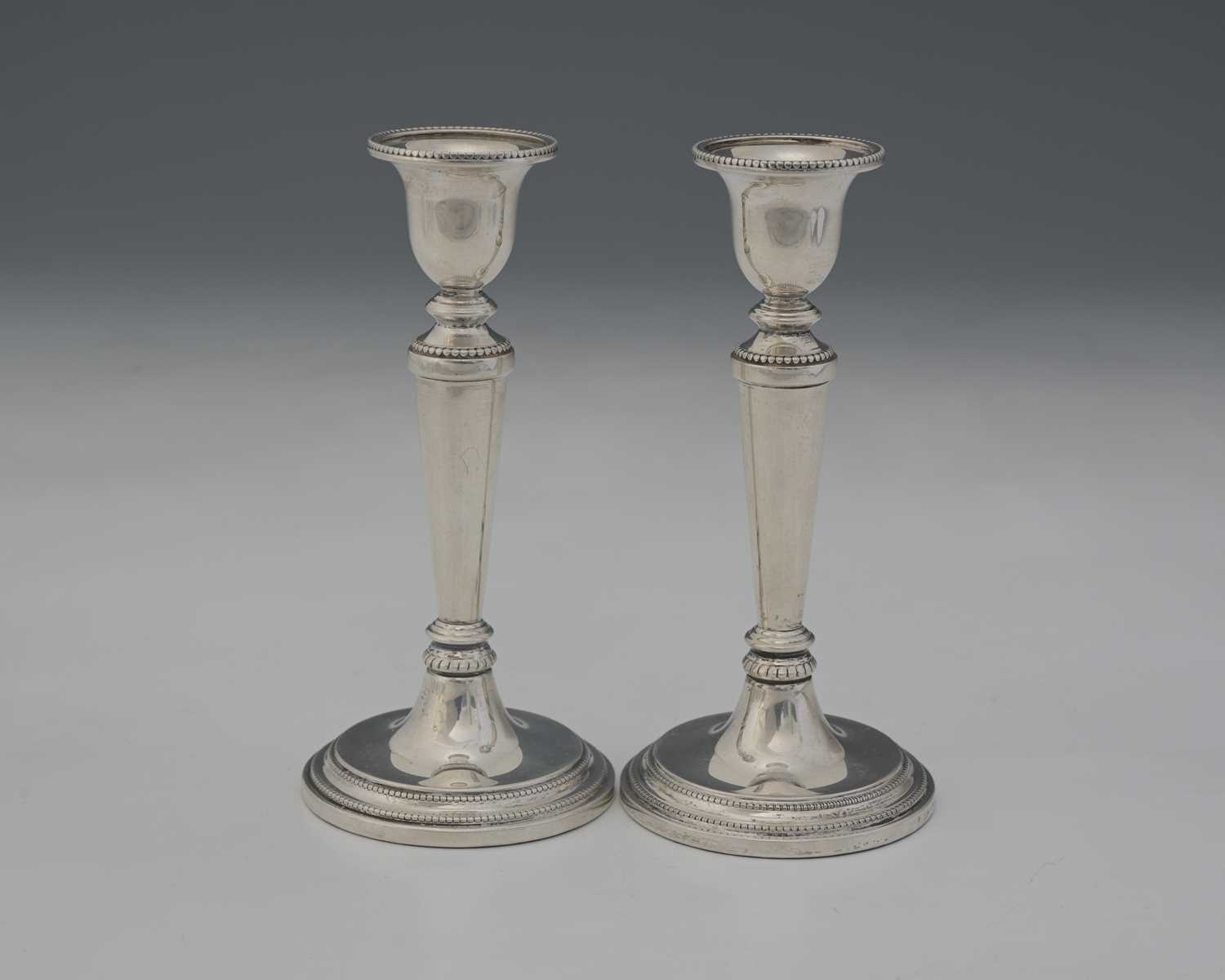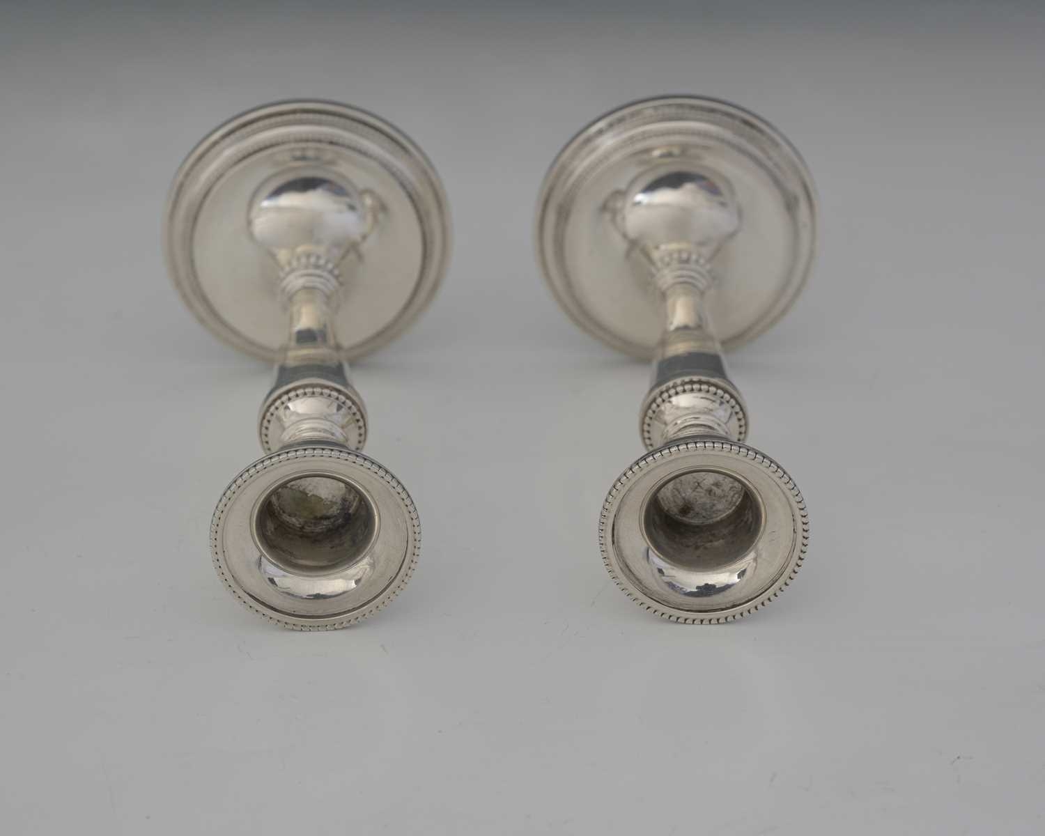 A pair of Elizabeth II silver candlesticks, by 'B&Co', Birmingham 1993, each with a stepped beaded foot and weighted base, height 14cm approx (2)
