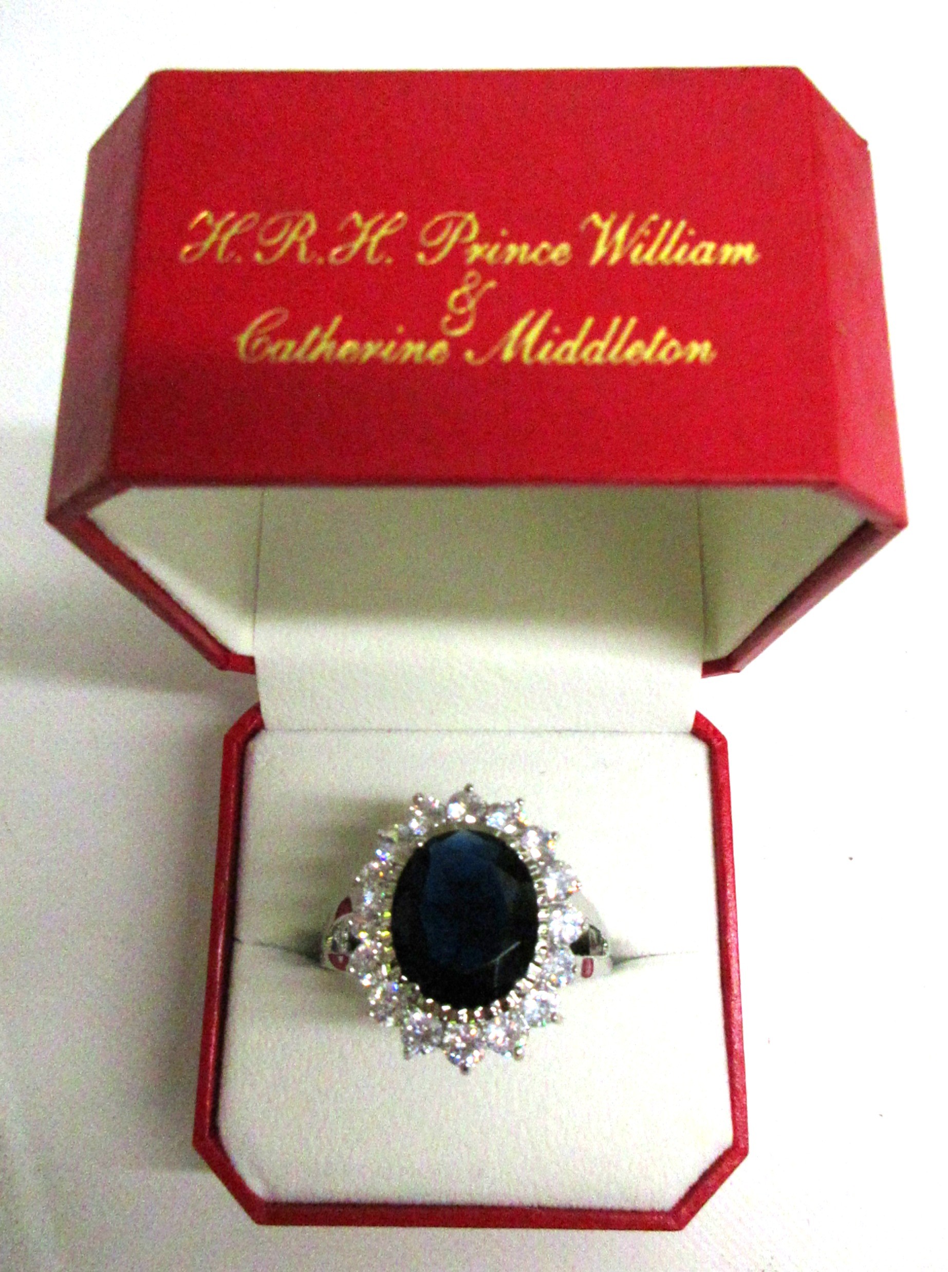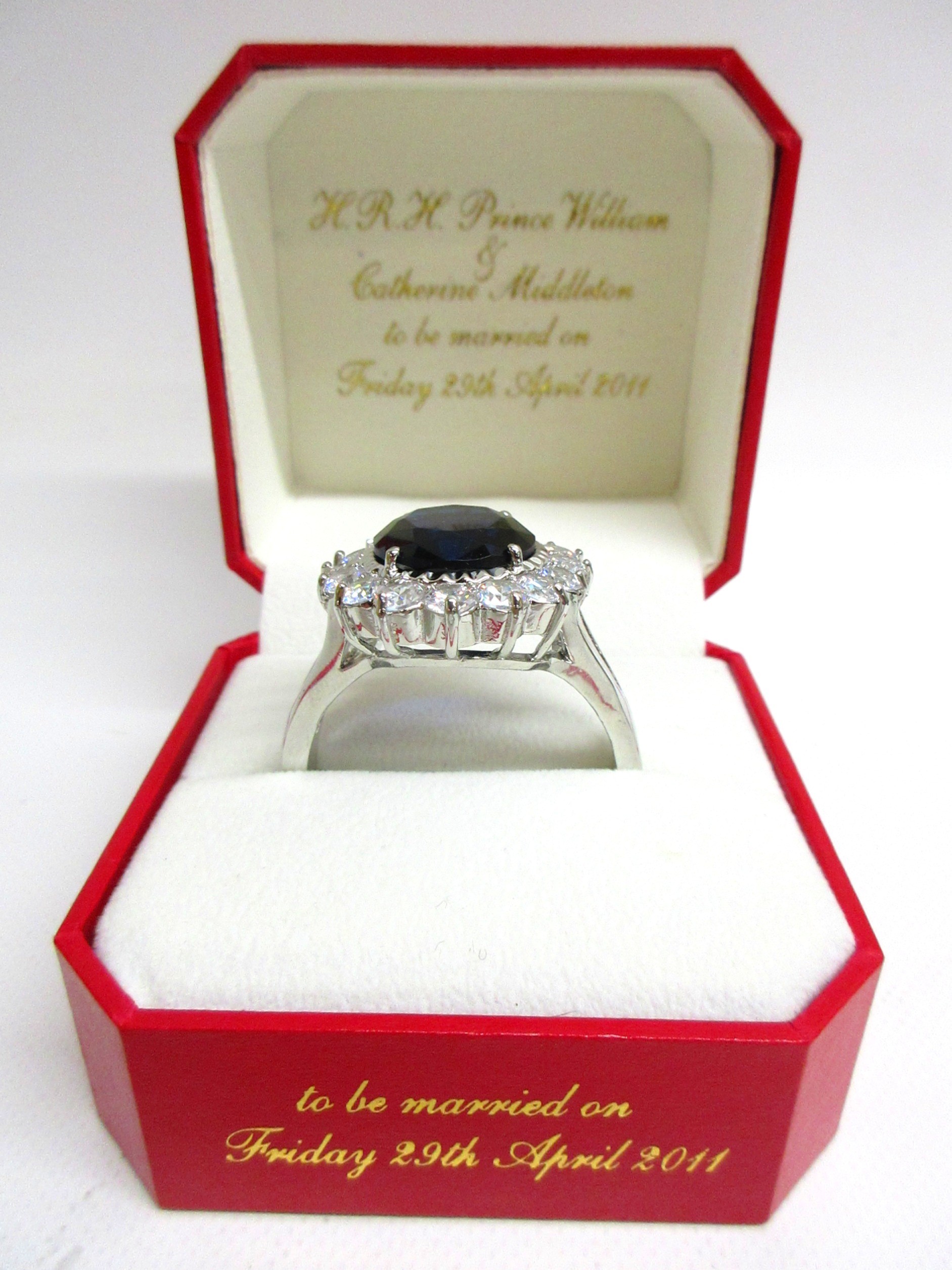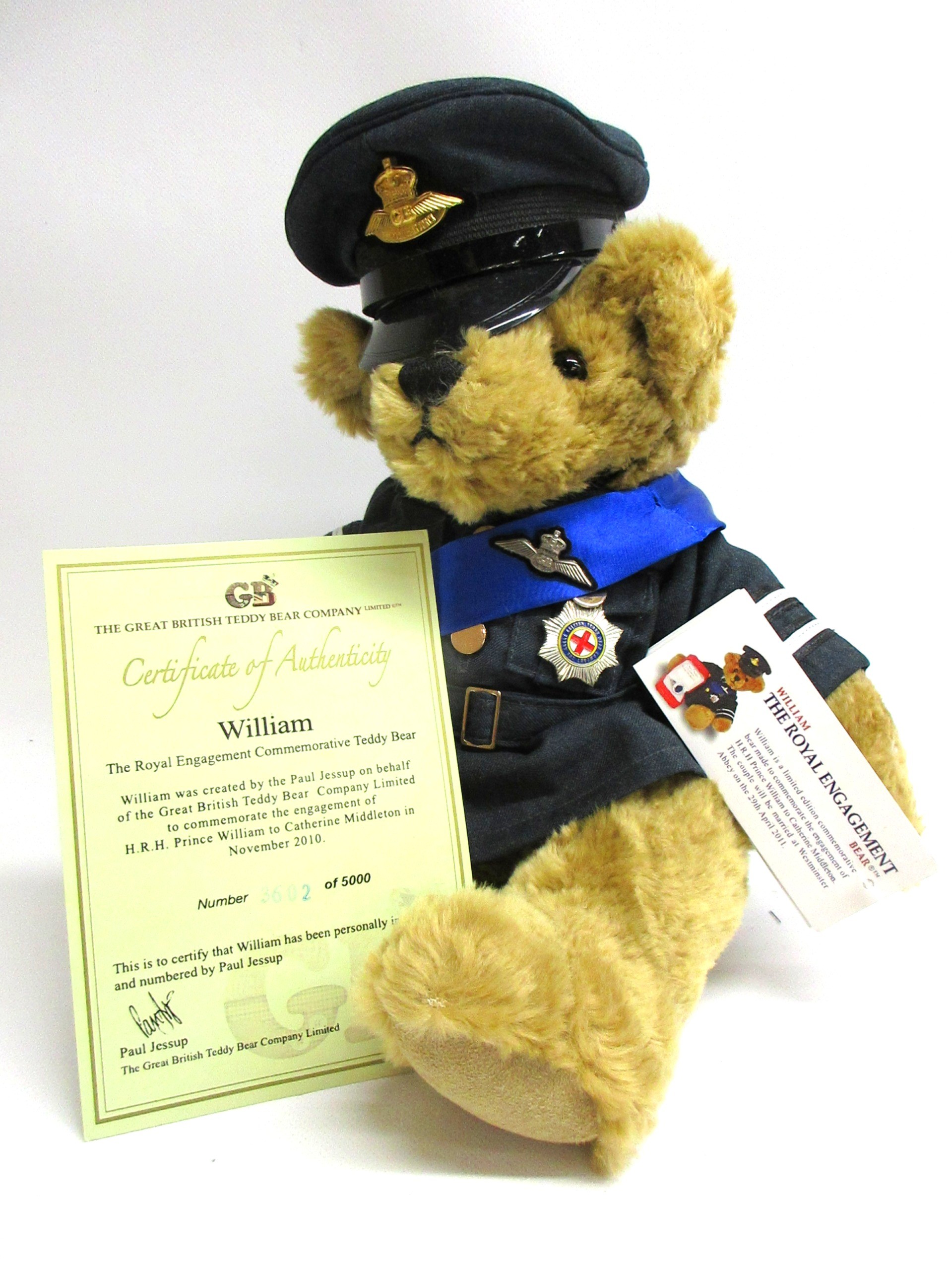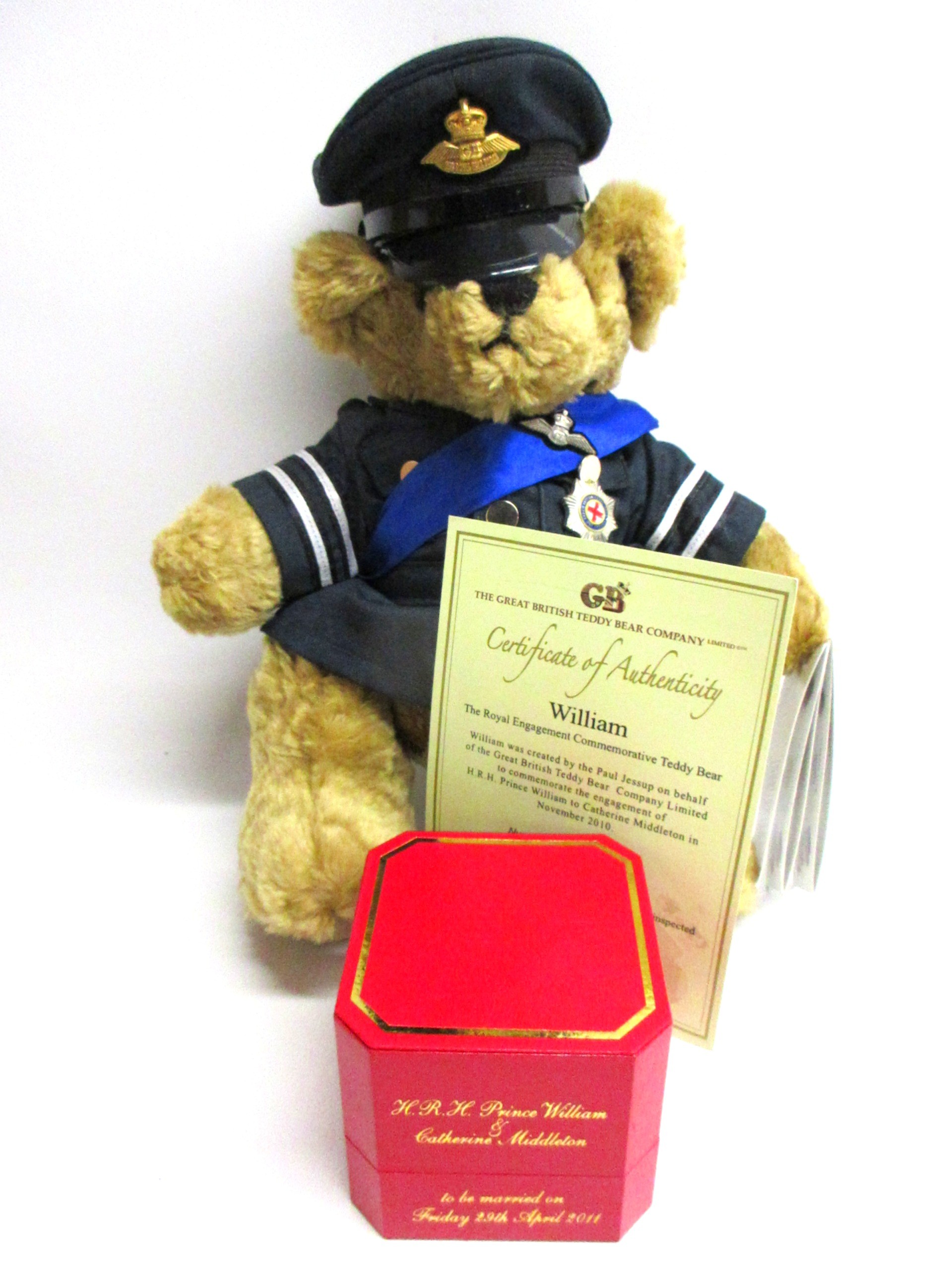 Great British Teddy Bear Company's Limited Edition HRH William the Royal Engagement commemorative bear no. 3,602 of 5,000 c2010/11; depicting brown plush bear with plastic eyes, stitched nose & mouth, plus jointed limbs; wearing RAF no.1 uniform with blue sash & 'Royal Bear Force' cap badge/wings; alongside Certificate of Authentication, original card & rear cloth tags in tact, approx. W 24cm x H 30cm in box; together with an enlarged replica of HRH Princess of Wales engagement ring with faux oval Ceylon sapphire surrounded by faux round-cut solitaire diamonds, in faux white gold setting; secured in a ring box, inscribed 'HRH Prince William & Catherine Middleton to be married on Friday 29th April 2011', Qty. 1