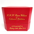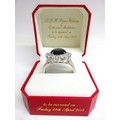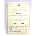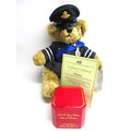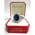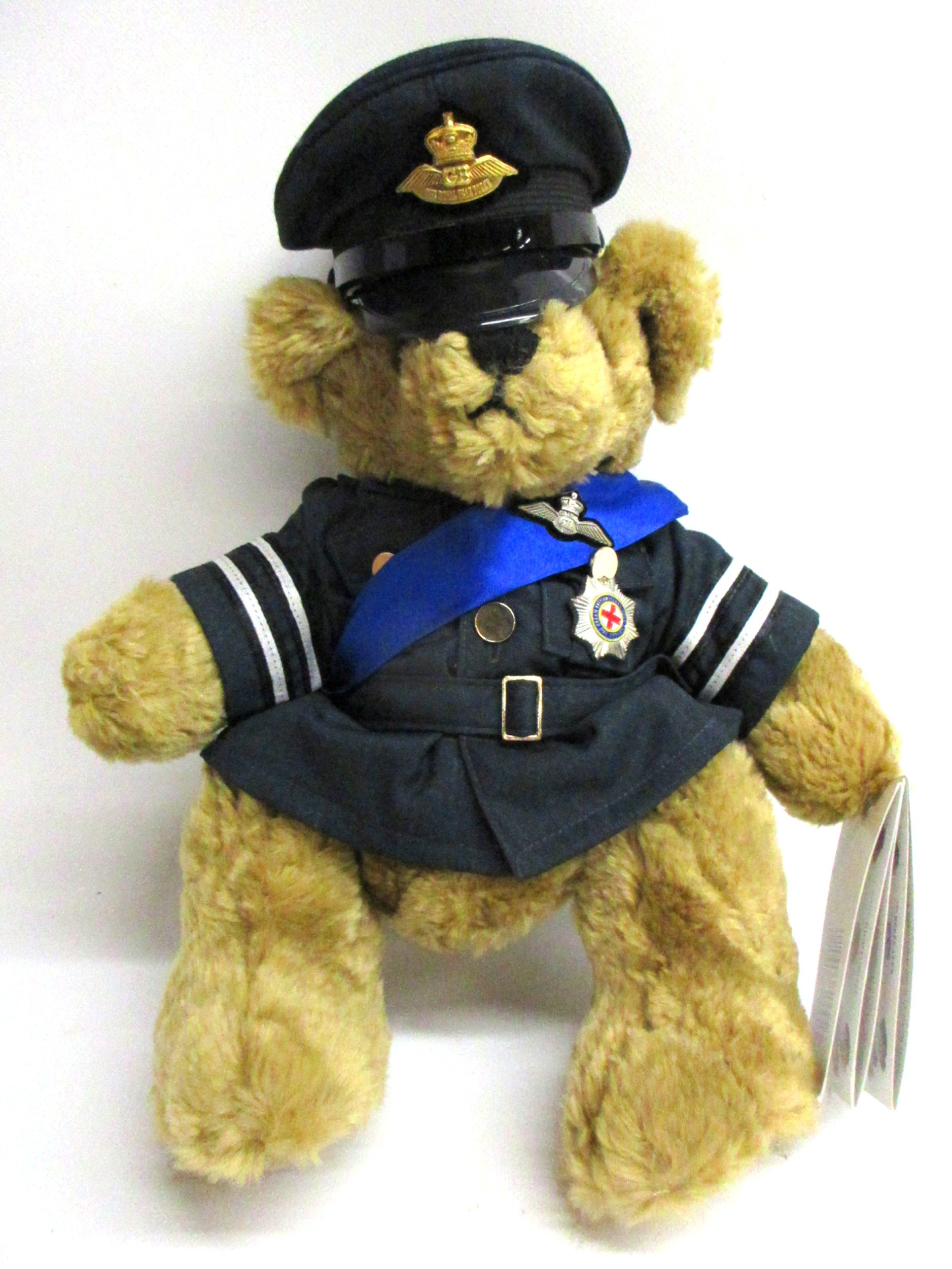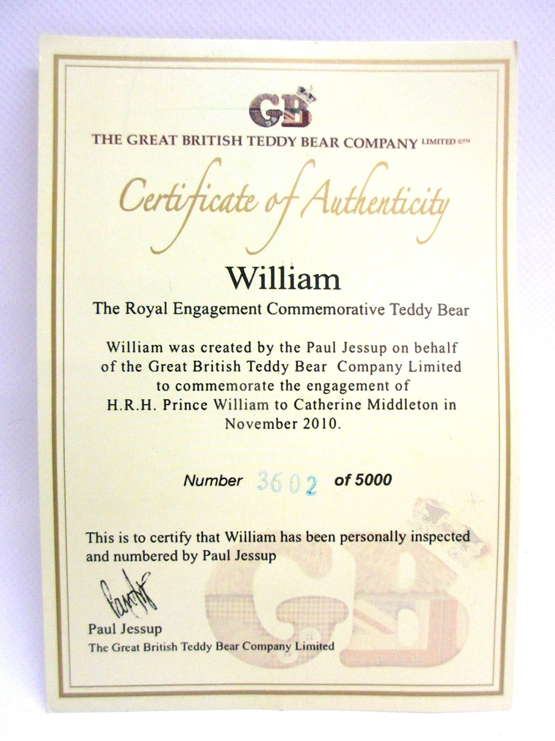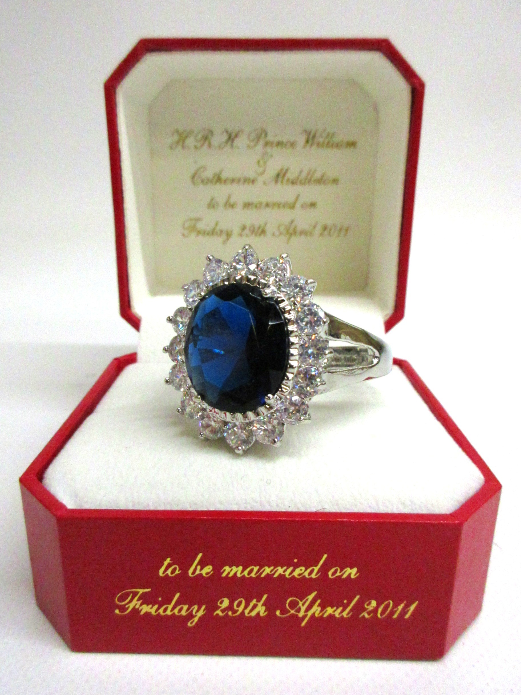 Great British Teddy Bear Company's Limited Edition HRH William the Royal Engagement commemorative bear no. 3,602 of 5,000 c2010/11; depicting brown plush bear with plastic eyes, stitched nose & mouth, plus jointed limbs; wearing RAF no.1 uniform with blue sash & 'Royal Bear Force' cap badge/wings; alongside Certificate of Authentication, original card & rear cloth tags in tact, approx. W 24cm x H 30cm in box; together with an enlarged replica of HRH Princess of Wales engagement ring with faux oval Ceylon sapphire surrounded by faux round-cut solitaire diamonds, in faux white gold setting; secured in a ring box, inscribed 'HRH Prince William & Catherine Middleton to be married on Friday 29th April 2011', Qty. 1