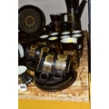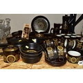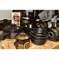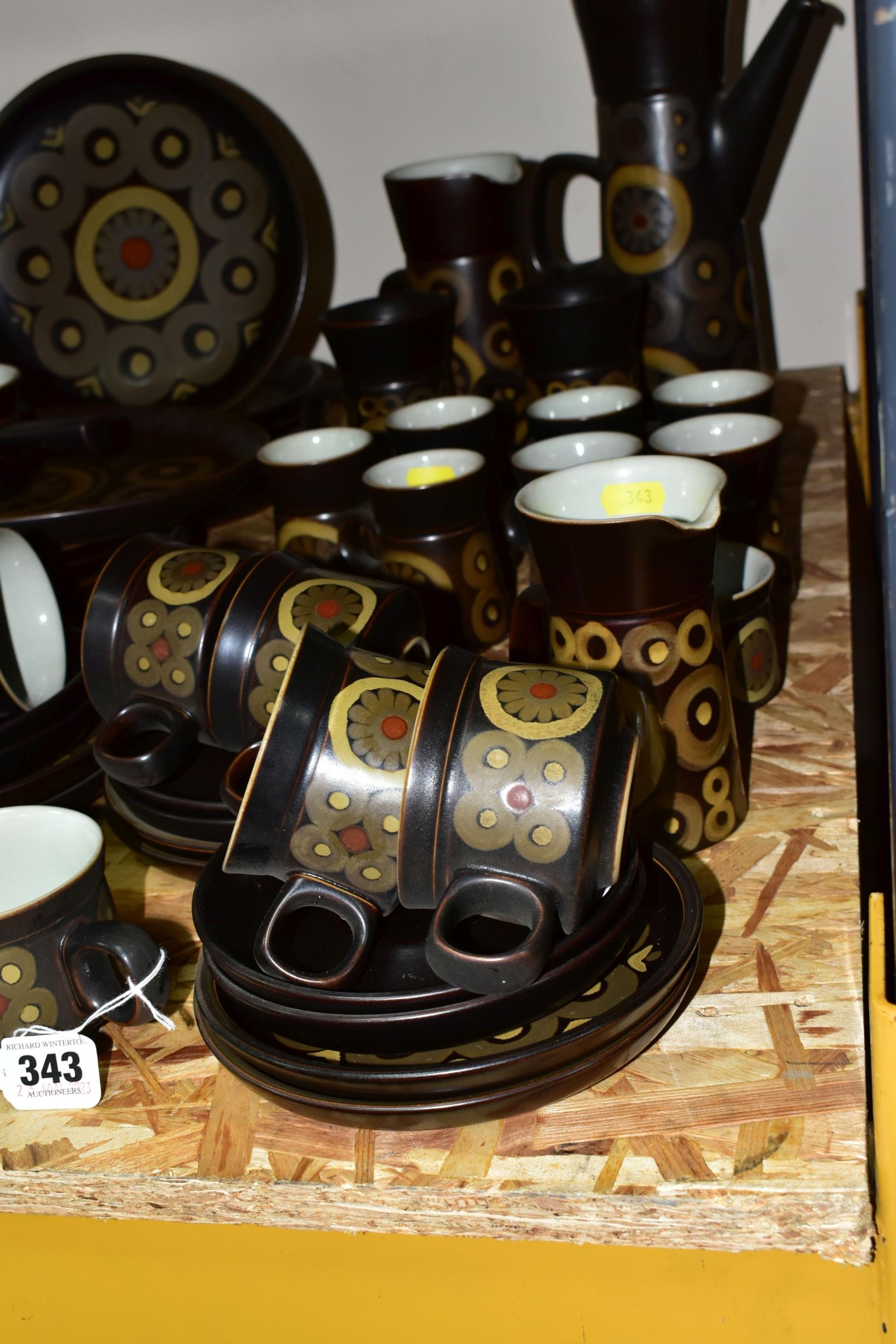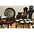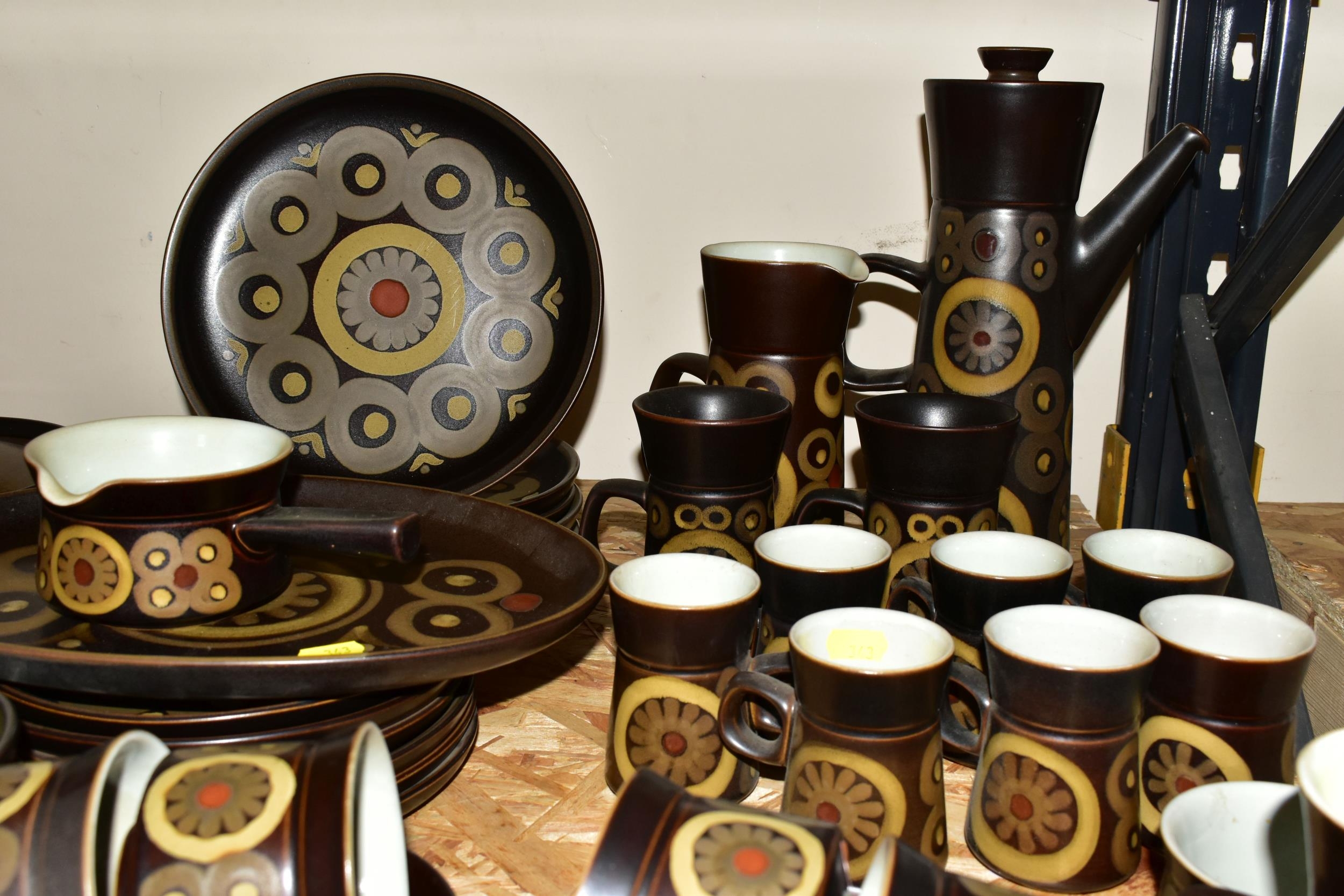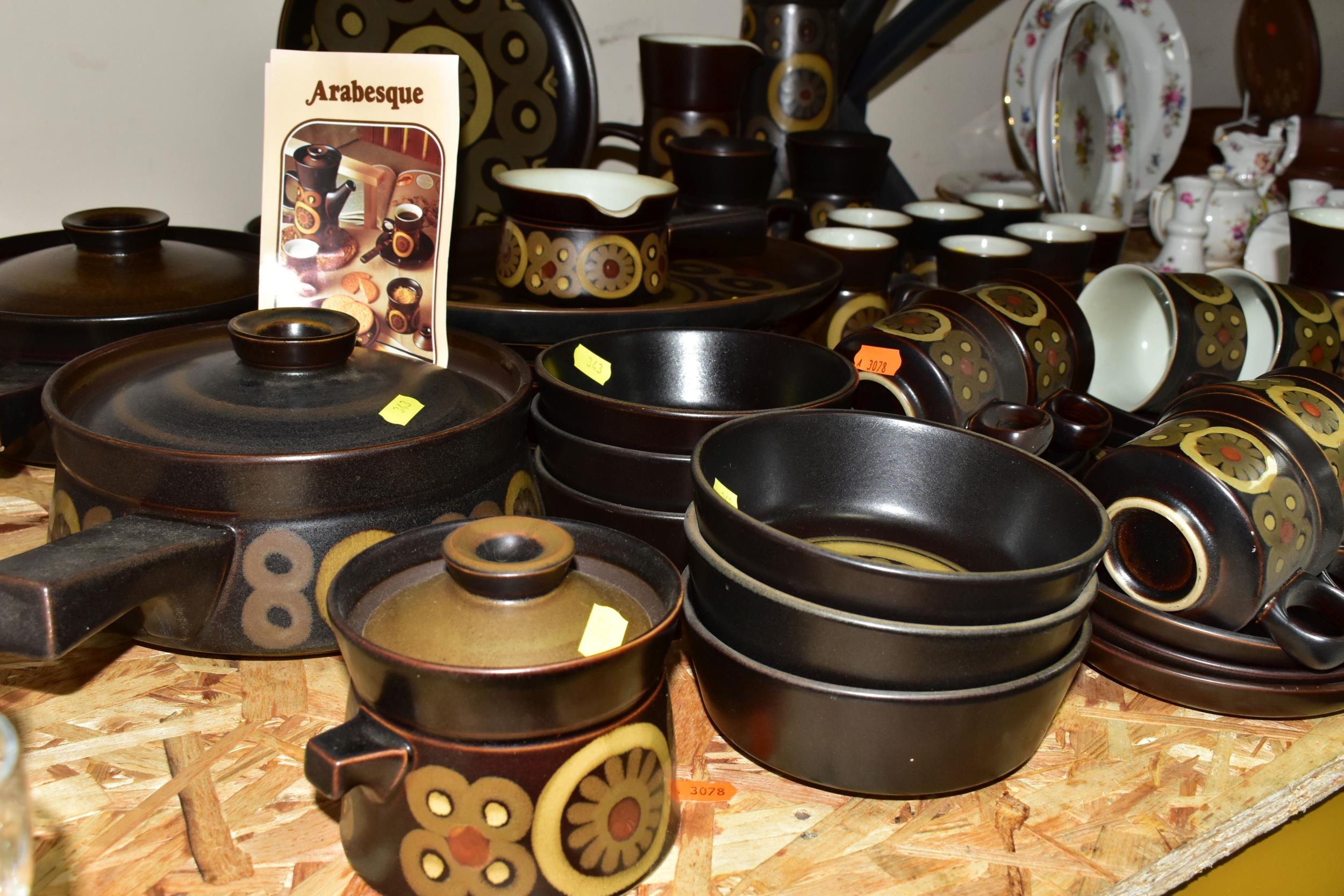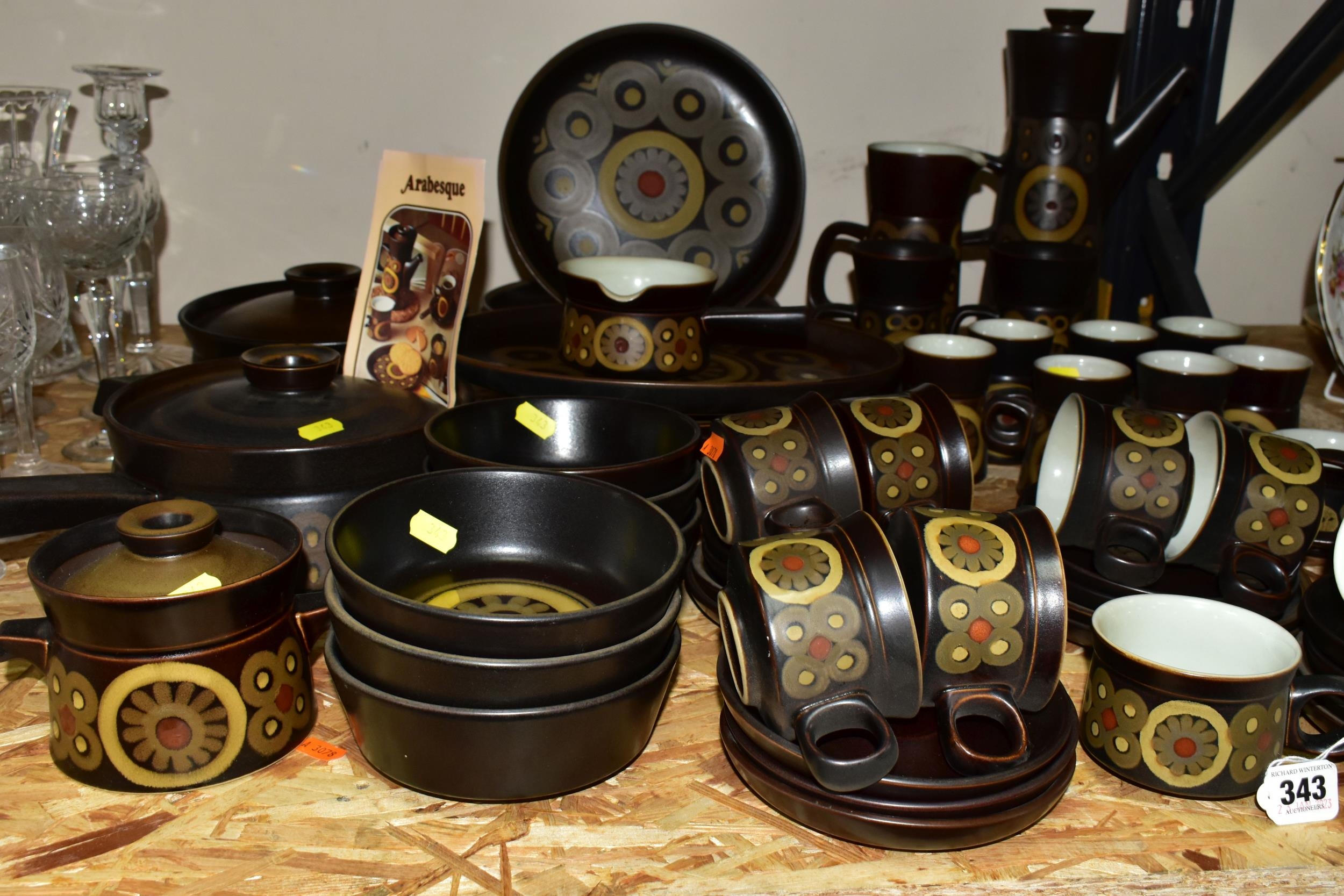 A 1970'S COLLECTION OF DENBY ARABESQUE OVEN-TO-TABLEWARE, comprising two round casserole/saucepan covered dishes (small chip to underside of one handle), a gravy tureen, six dinner plates, one oval platter, six side plates, six fruit/salad bowls, an individual covered soup dish, coffee pot, two large mugs, a large open jug, an open sugar bowl and milk jug, seven coffee cups, nine tea cups, nine saucers, six tea plates (60) (Condition Report: obvious damage is mentioned in description, most pieces have had little use)