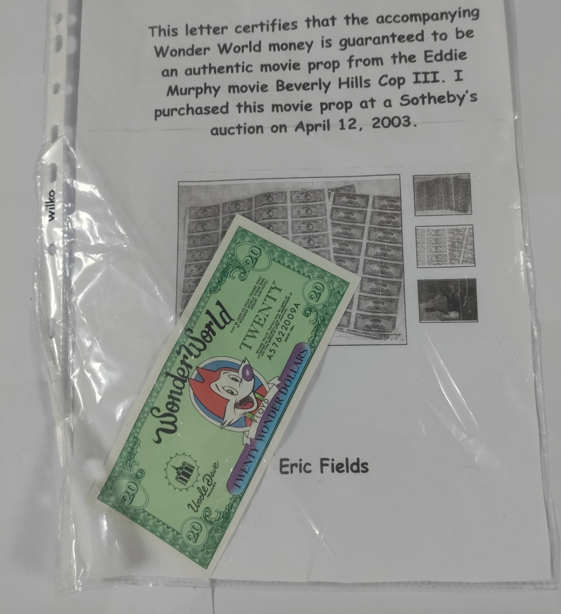 A prop note from the Eddie Murphy film Beverley Hills Cop 3 and certificate of authenticity