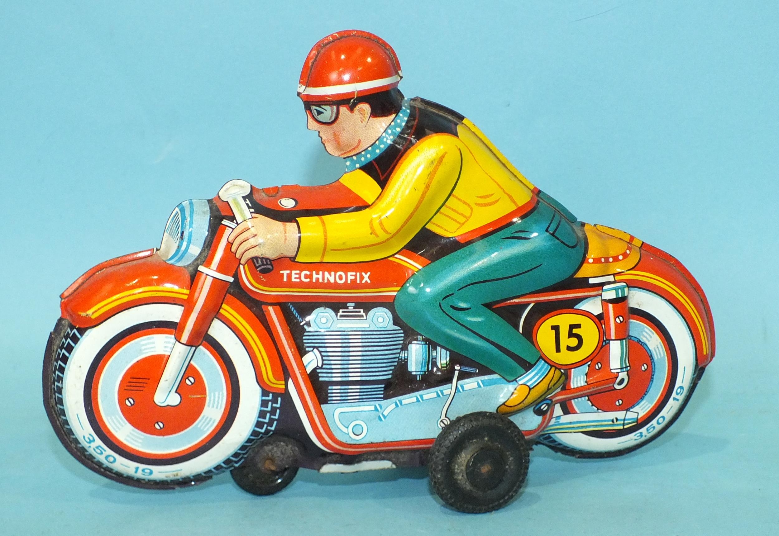 A Technofix tinplate racing motorcycle, 3.50-19, RN15, c1970's.