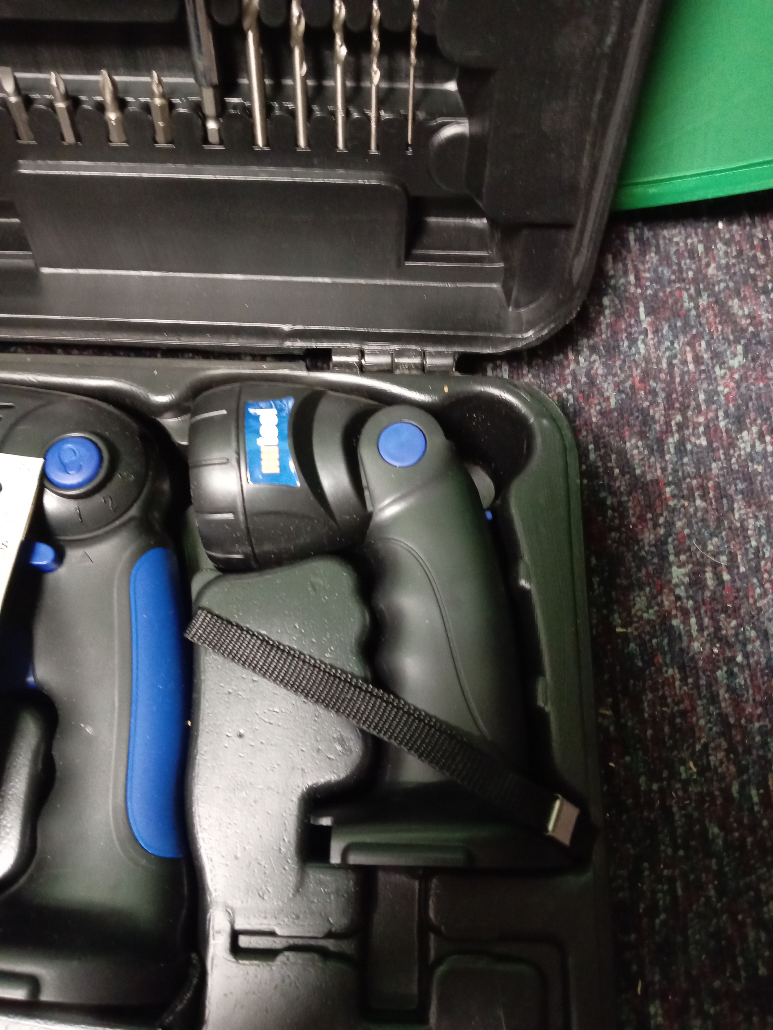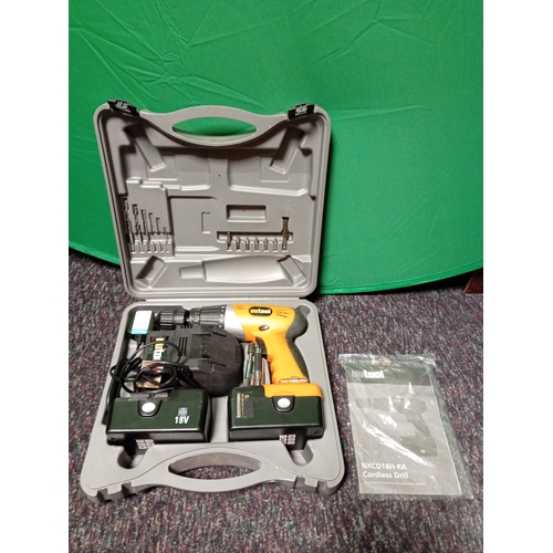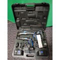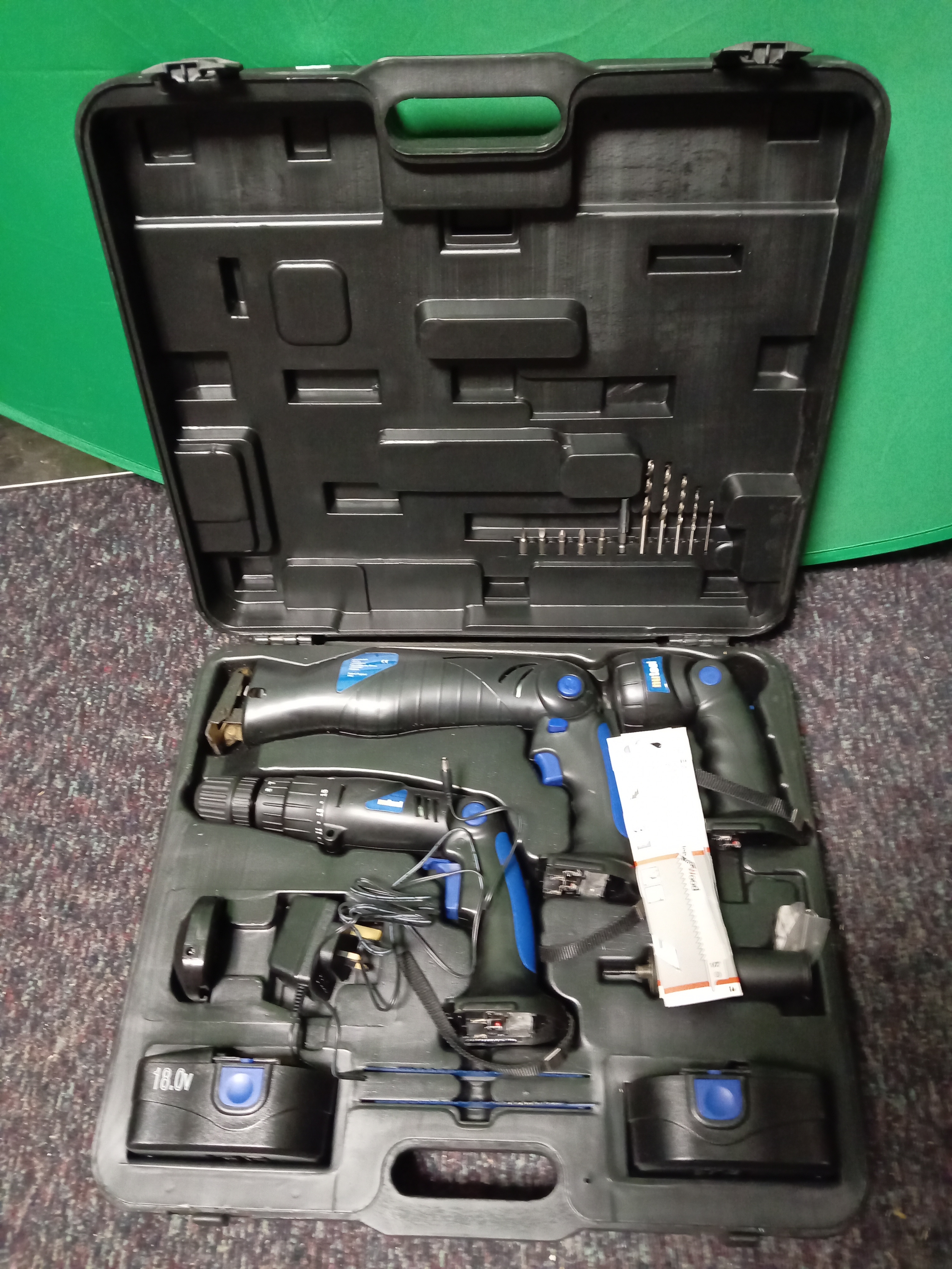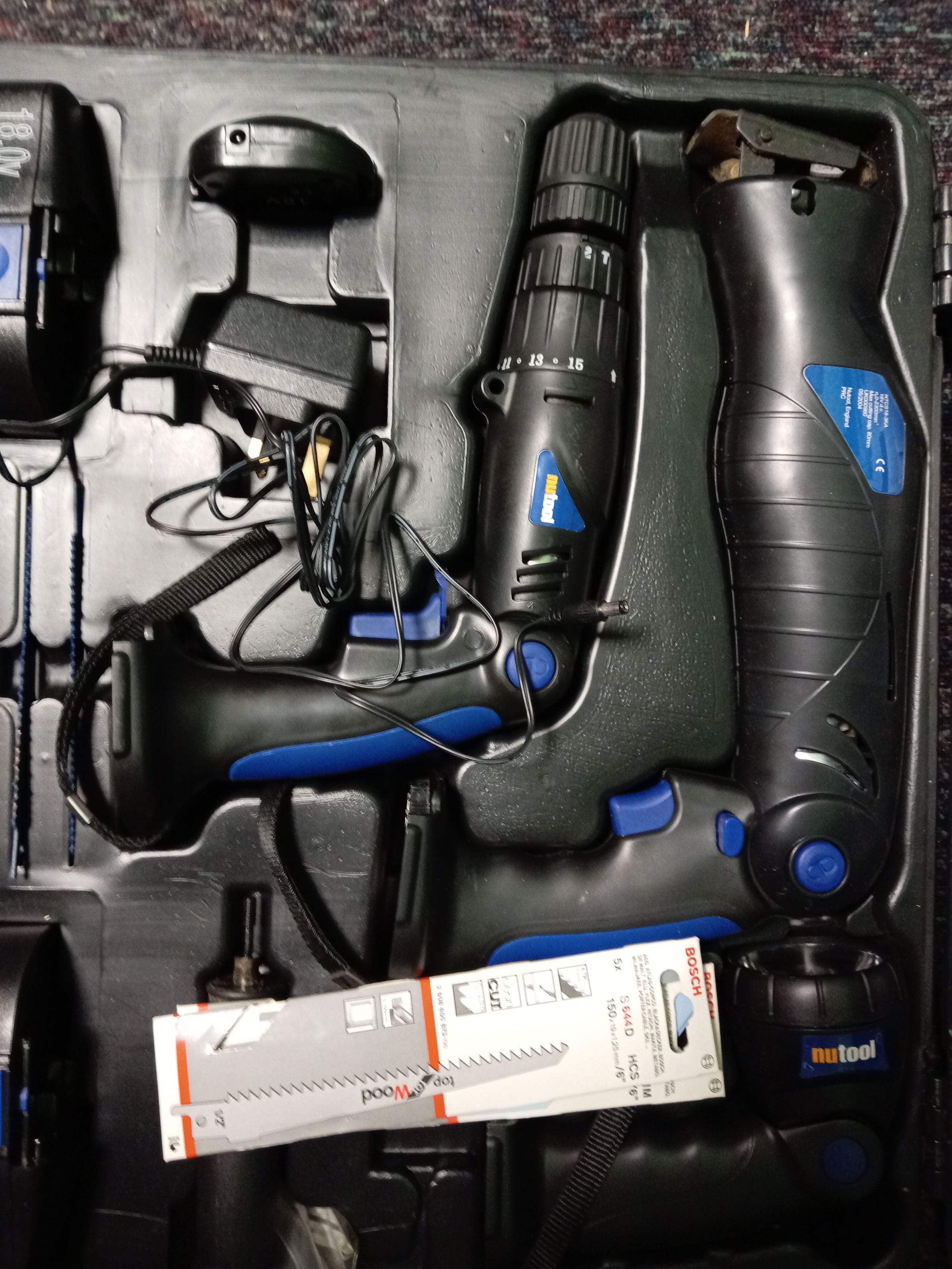 A nutool cordless tool set. To include a cordless drill, a reciprocating saw, a torch, and two batteries.