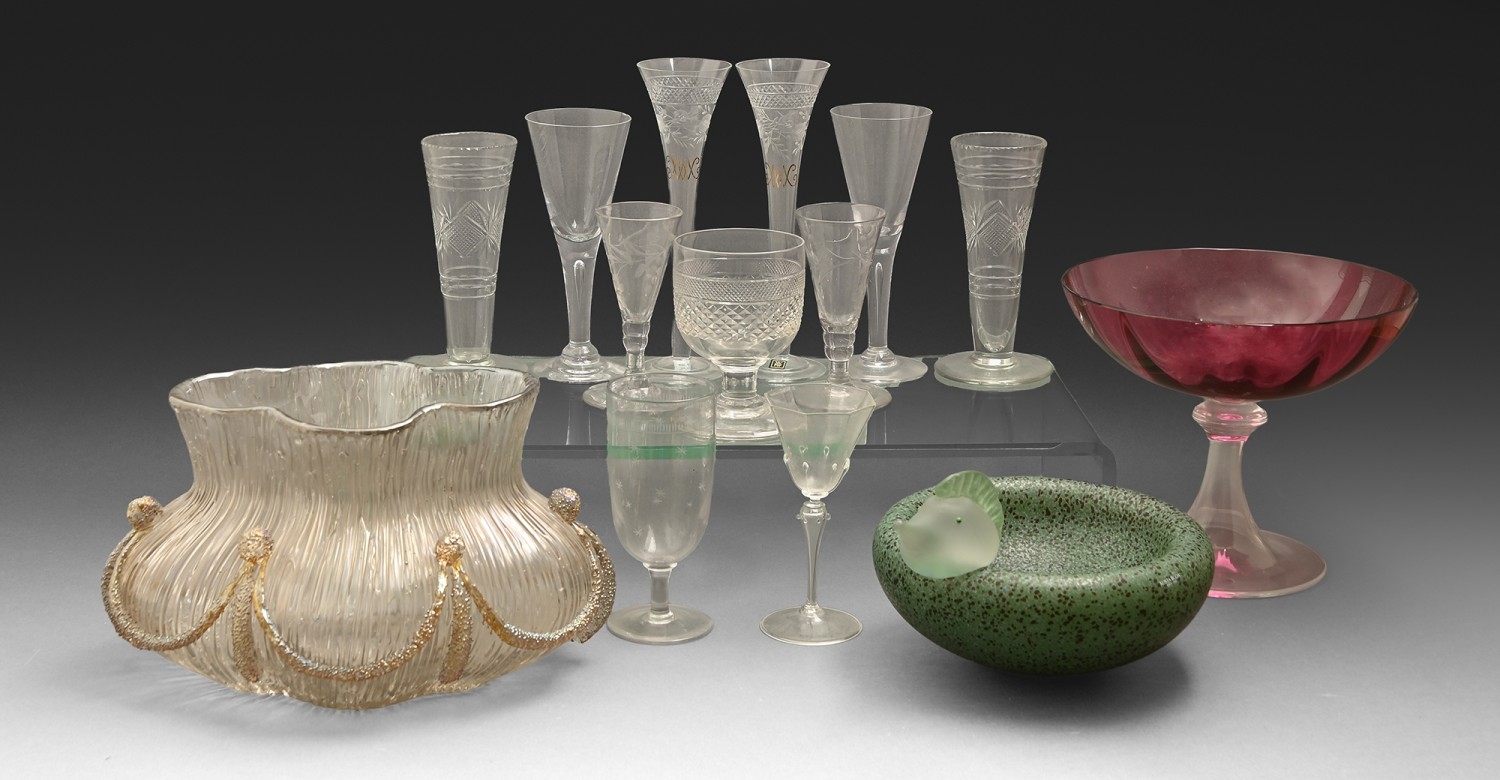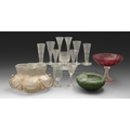Miscellaneous decorative glass and cut drinking glass, 19th c and later, to include a cranberry glass comport, a pair of WMF champagne flutes, a Kosta Boda bowl designed by Ulrika Hydman-Vallien and a pair of cut glass trumpet flutes, 23cm h and smaller (14)